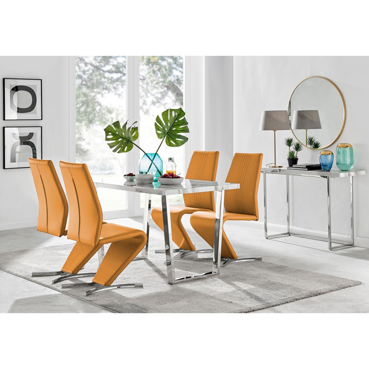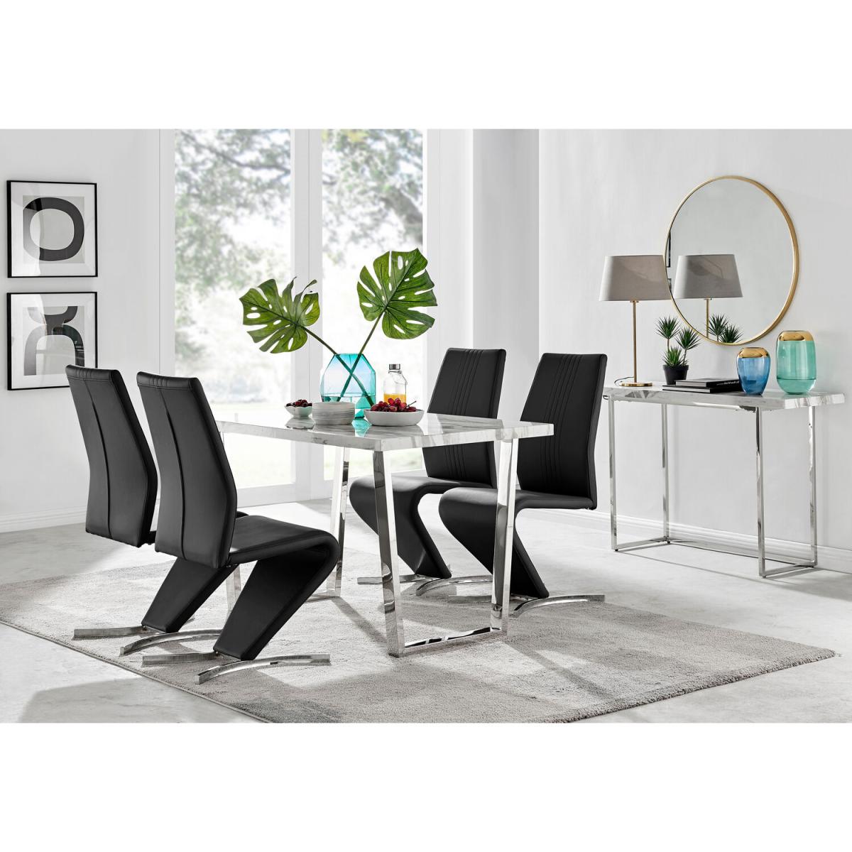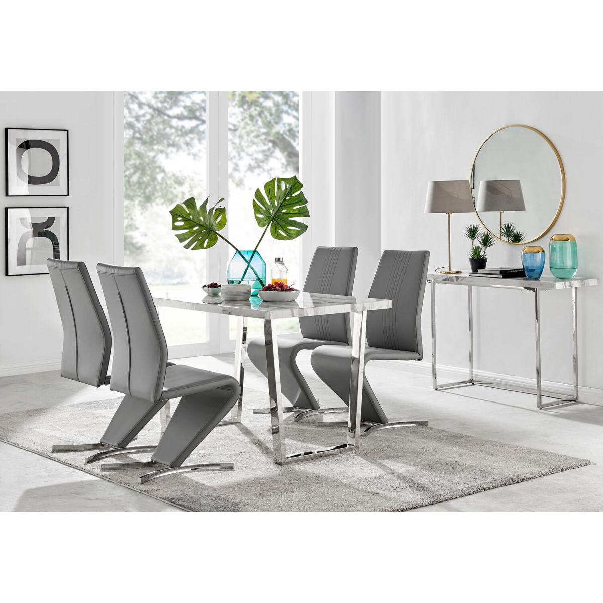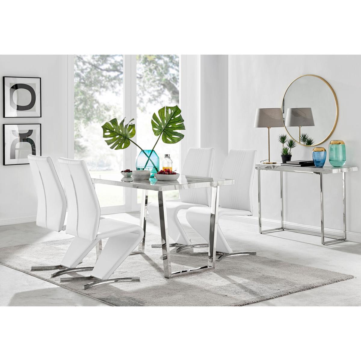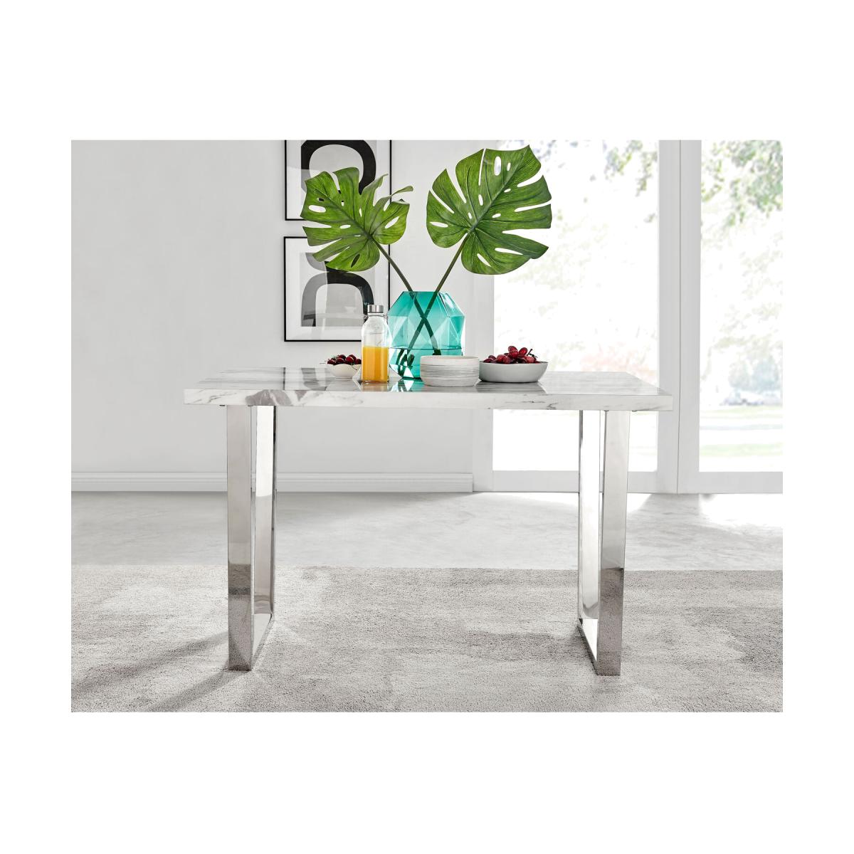 The Kylo collection features a large rectangular table top which has plenty of space for laying out an impressive spread for friends and family. This 120cm 4 seat version is ideal if you love hosting guests for dinner. Our favourite part of the Kylo dining table is the u-shaped metal legs which are beautifully finished here in a silver chrome finish for an ultra modern look. The white marble effect high gloss table top is not only beautiful but also practical and easy to clean thanks to its smooth surface which wipes clean. The subtle grey marbling gives you the aesthetic of marble without the price tag! This is a wow factor dining table for your dining room. Paired with our eye catching Willow chairs, with their luxurious curved frame and half crescent chrome feet, this set is sure to make any space a talking point for years to come. With such an appealing design and price tag we just love it and are sure that you will too!