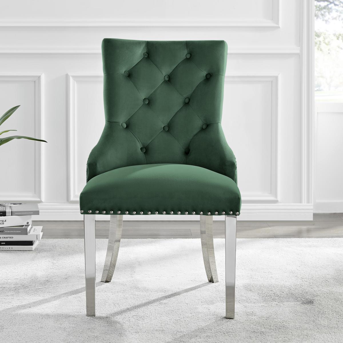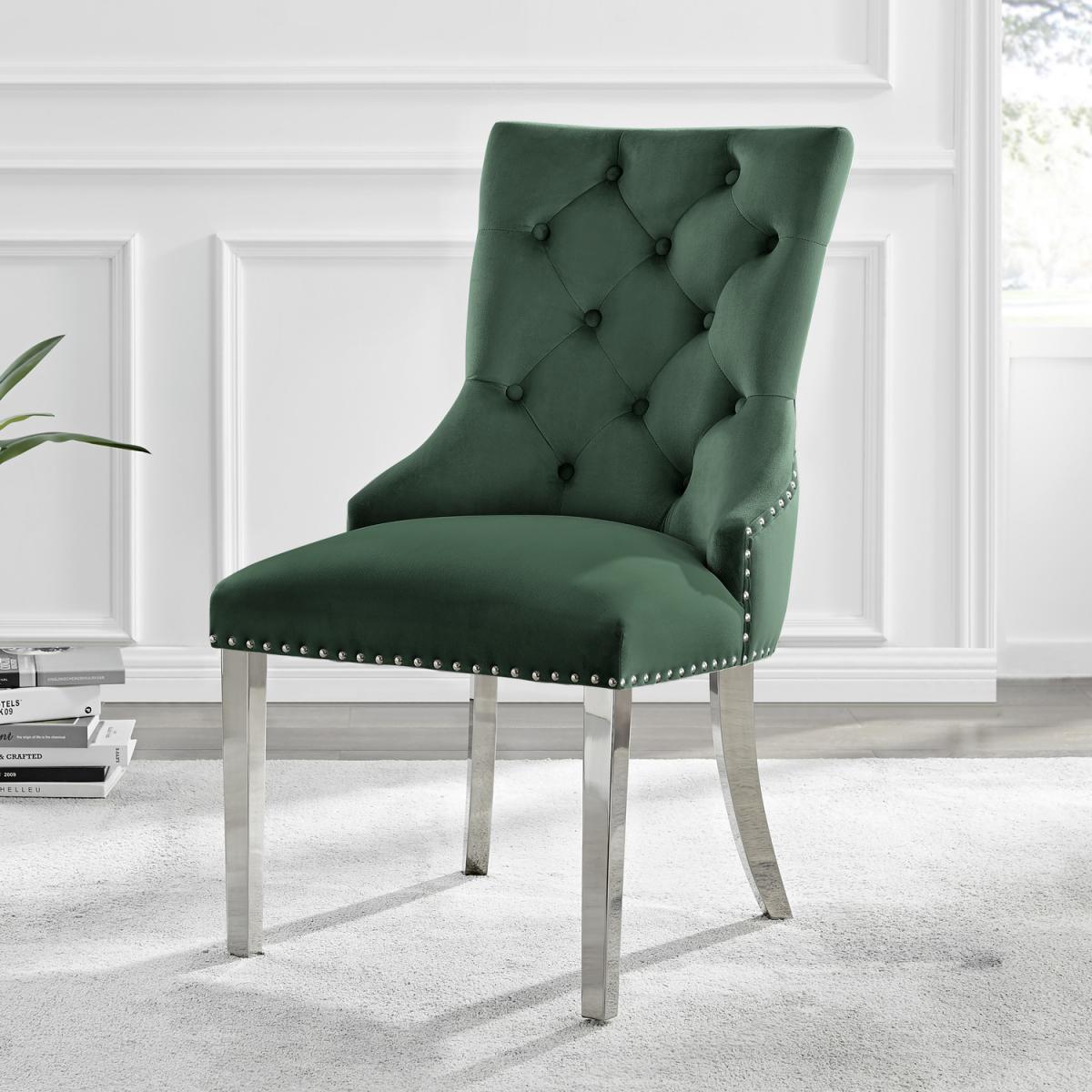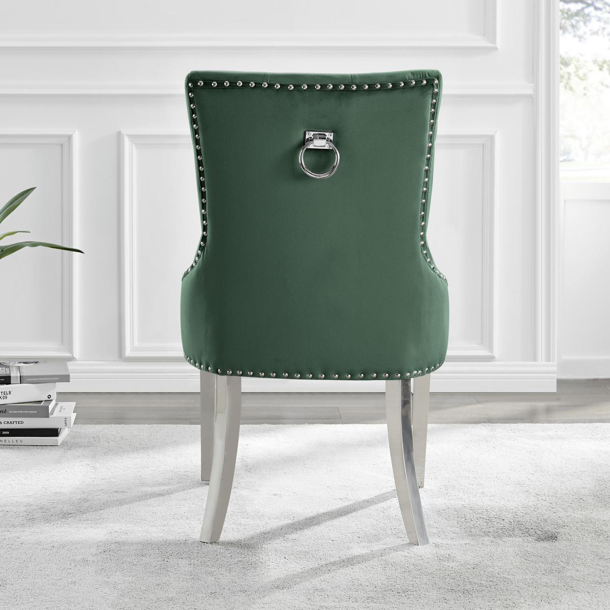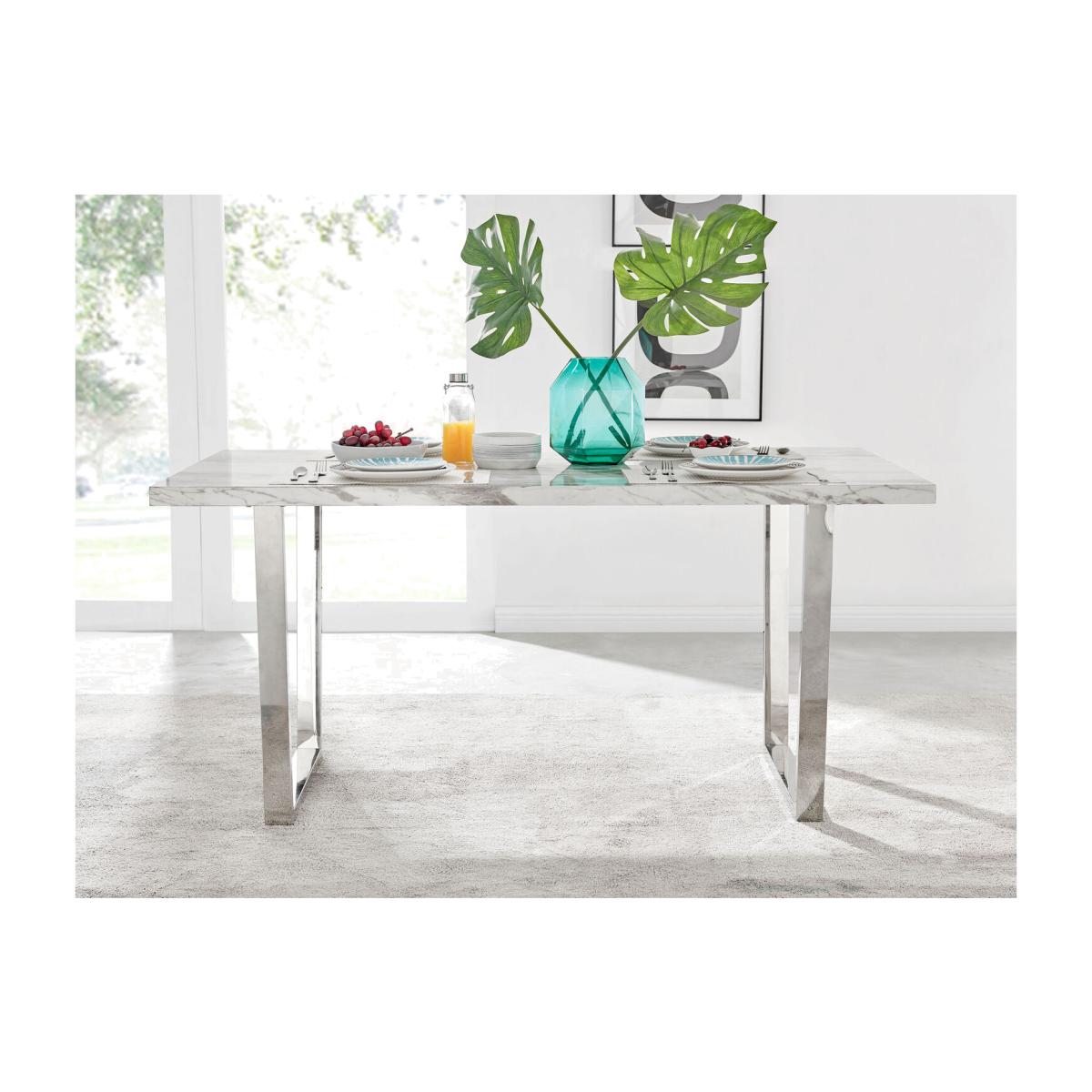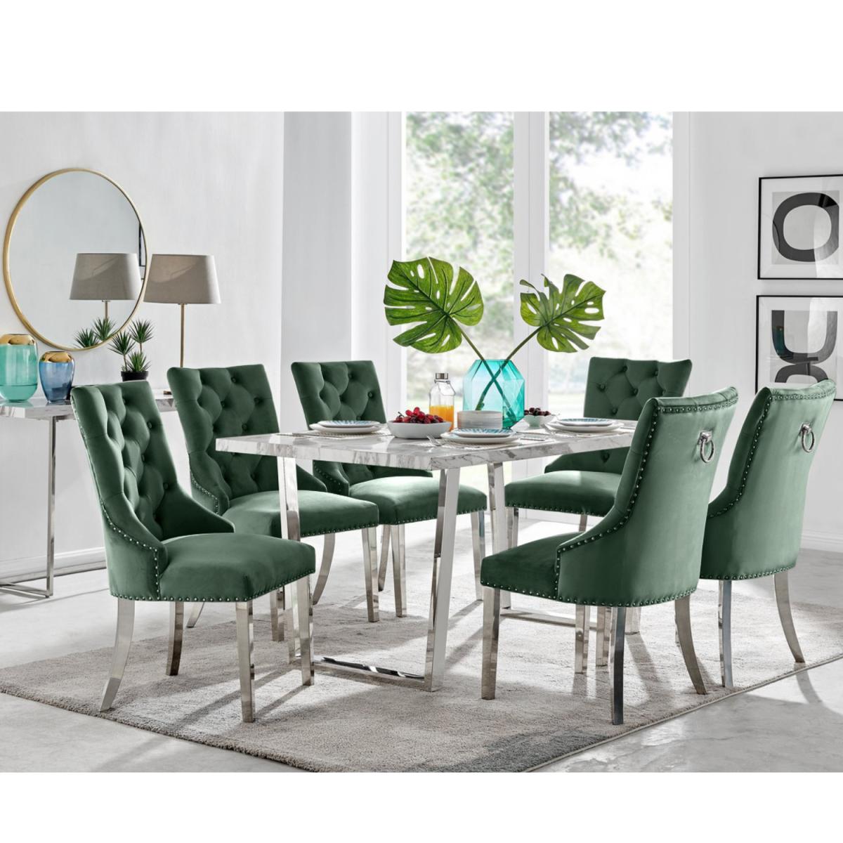 The Kylo collection features a large rectangular table top which has plenty of space for laying out an impressive spread for friends and family. This 160cm 6 seat version is ideal if you love hosting guests for dinner. Our favourite part of the Kylo dining table is the u-shaped metal legs which are beautifully finished here in a silver chrome finish for an ultra modern look. The white marble effect high gloss table top is not only beautiful but also practical and easy to clean thanks to its smooth surface which wipes clean. The subtle grey marbling gives you the aesthetic of marble without the price tag! This is a wow factor dining table for your dining room. The opulent Belgravia chairs provide a touch of luxury, with thickly padded velvet upholstery, and a striking knockerback detail. Anyone for a lovely dinner party or some cocktails