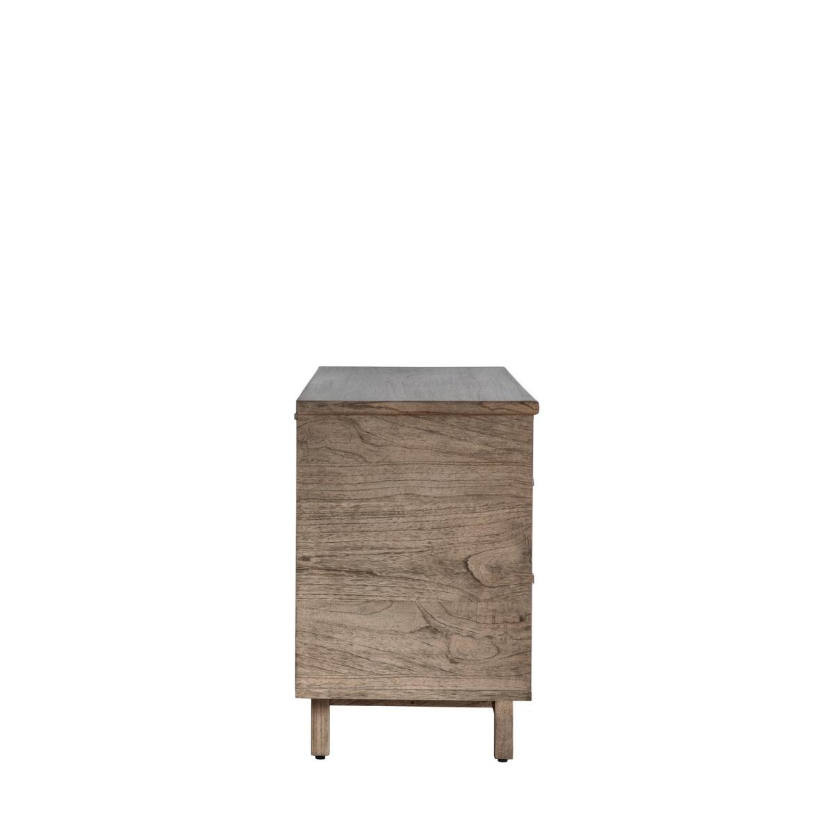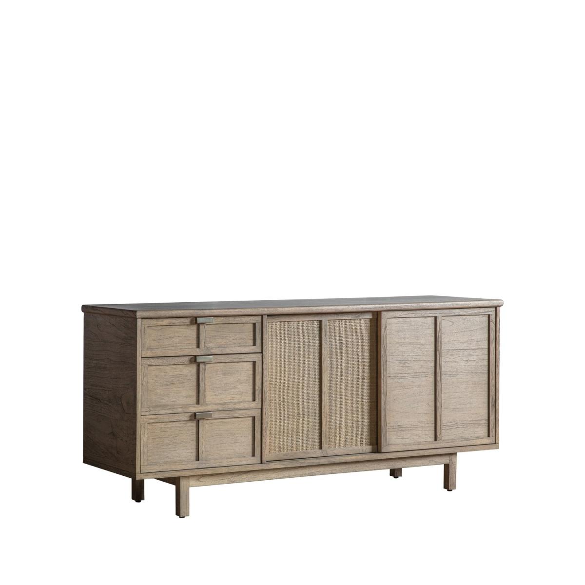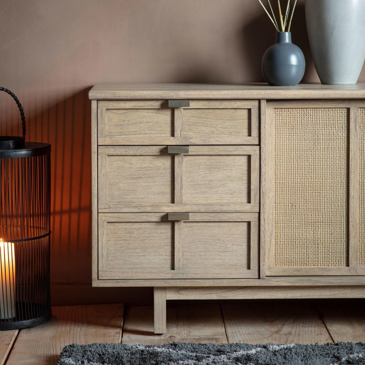 Dimensions:H:70 x W:150 x D:45 cm This piece of woodwork features three impressively large drawers and two sliding doors. The three sections of this sideboard offer an immense amount of storage space, while the natural, smoothly textured wood is attractive and can be used to display a number of accessories such as books, a lamp, and candles. Features: 2 Doors / 3 Drawers / 2 Shelves Assembly Required: Yes - legs / feet only Solid Mindi, Particle board, MDF, Rattan Cane Webbing, Plywood