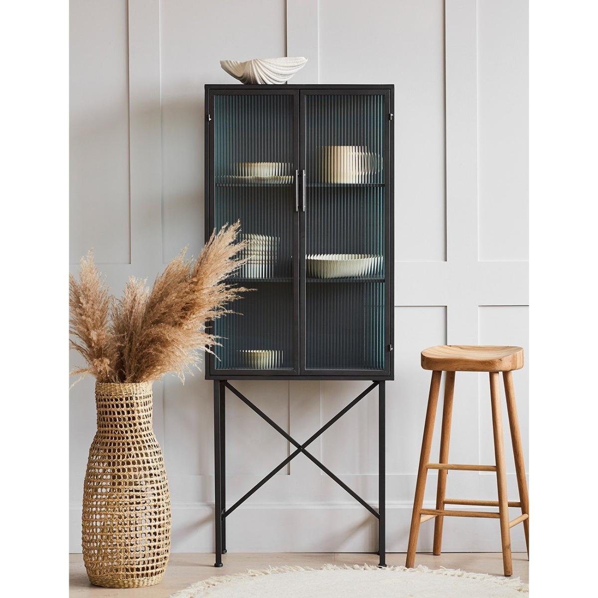 I love this cabinet for its sleek combination of glass and metal, which makes it a versatile piece that can elevate a range of interiors. It works particularly well in contemporary or industrial settings, where its clean lines and material mix add a modern edge. Practical styling tips include using the glass front to display curated accessories or favourite glassware, while keeping the inside organised with baskets or modest storage boxes. Because of its height and striking design, it can serve as a focal point in dining rooms, kitchens, or living spaces, adding both style and function without overwhelming the space.