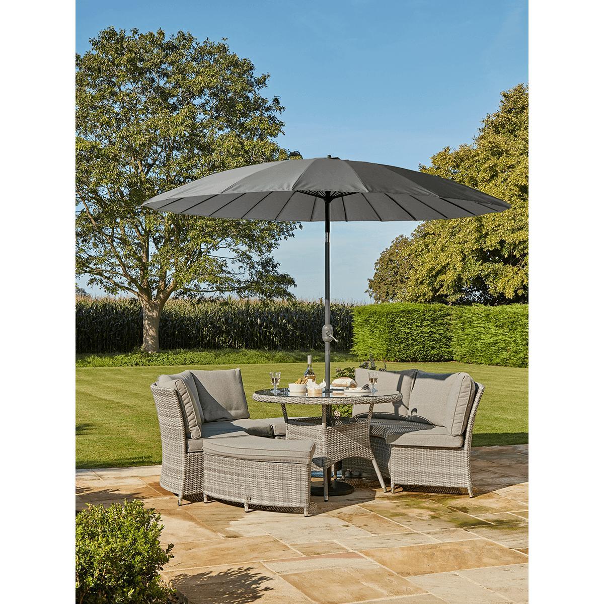 Positioned to your garden relax or dining spot our Kyoto parasol will protect you from the sun, completing your outdoor arrangement with a look that is charming, and elegant. The ribbed canopy of our parasol is reminiscent of a traditional bamboo and paper parasol in design giving it a unique, less purely functional look - yet it is crafted from quality all-weather material with a UV protection rating of 50+, and comes with a clever crank and tilt function to re-position in exactly the desired place.