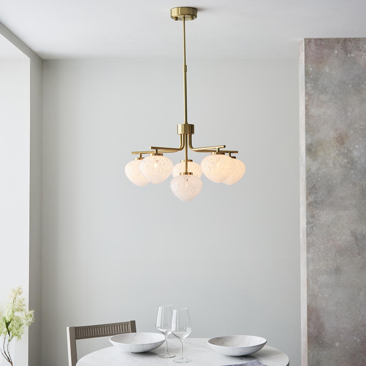 I love the kyra multi arm in satin brass for its contemporary take on a classic chandelier design. The confetti glass shades add a subtle texture and pattern, making it a versatile piece that works well in both modern and vintage-inspired interiors. It’s particularly effective in dining rooms or kitchens where you want a statement light that feels both stylish and functional. Practical styling tips include pairing it with soft, warm lighting to enhance the brass finish and keep the space cosy. It also works beautifully in foyers or living rooms with neutral palettes, adding a touch of sophisticated glamour without overpowering the overall decor.