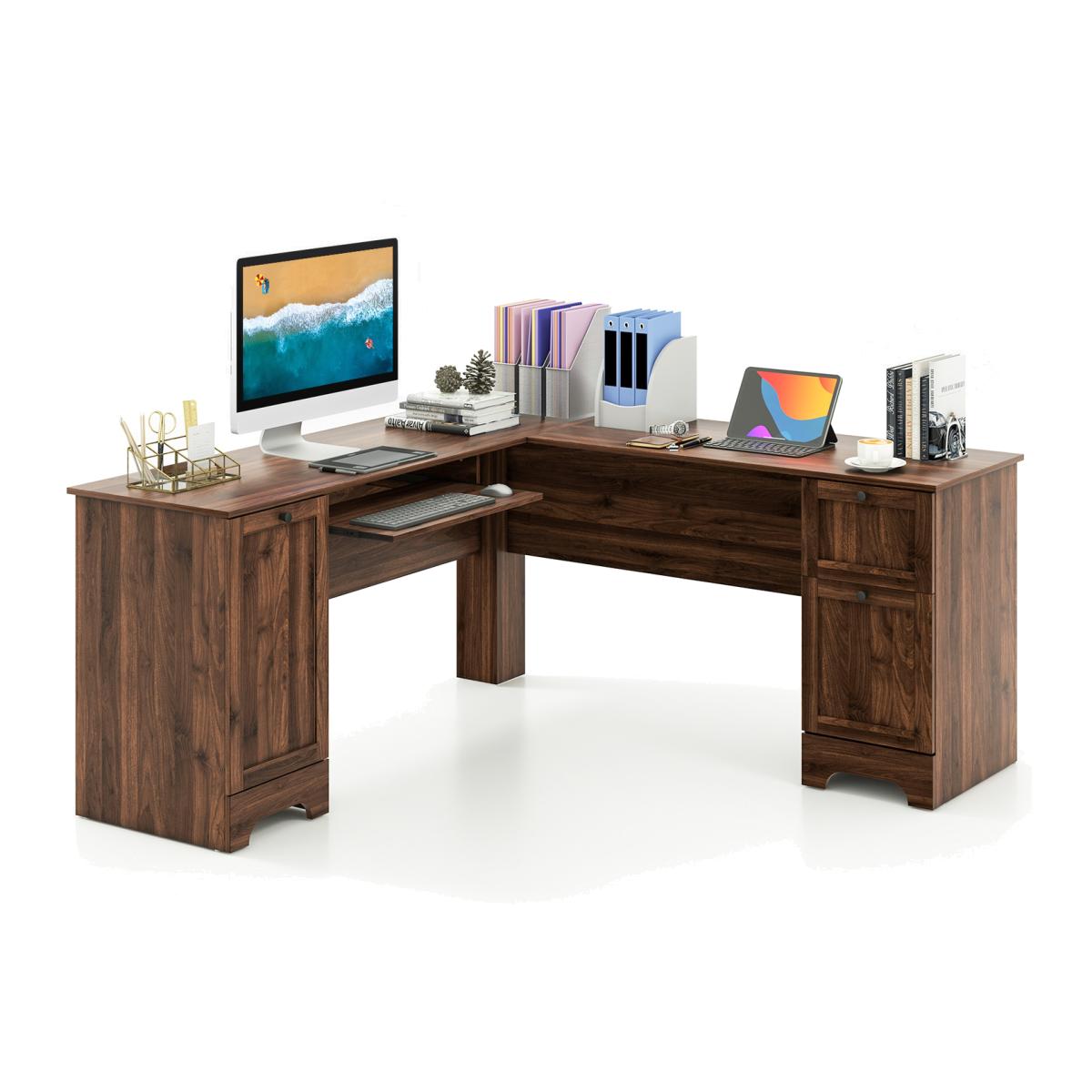 Are you looking for a desk that is both practical and stylish to meet your diverse needs? Well, why not try this one! Designed with a spacious desktop, 2 large drawers, a door cabinet and a slide-out keyboard tray, this L-shaped corner desk offers ample storage space to organise your office supplies well, ideal for any corner of your room, making the most of your limited space, providing you with more studying and working areas. In addition, convenient metal knobs and smooth metal drawer slides make it easy for you to open and close the drawers. Its classic appearance and space-saving design are perfect for your living room, bedroom, study room and home office.