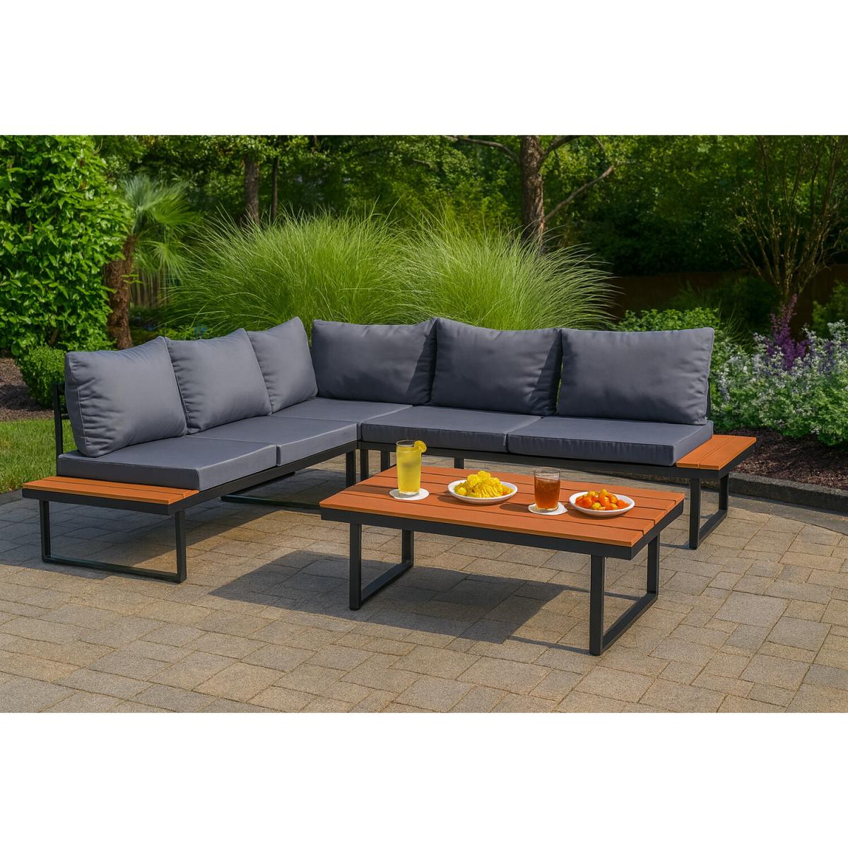 Is your outdoor seating area in need of an upgrade. Then look no further than our super stylish Aluminium Metal furniture set, designed to look fabulous and feel even better. Perfect for your patio, garden or courtyard. Make the most of your outdoor space and create a compact, comfy area to sit back and relax as you entertain your family and friends. Seat up to 5 people this set includes 1x five seater L shaped sofa, 1x centre table complete with a wooden top. The 10cm padded cushions make for a comfortable seat and are covered with high quality polyester fabric. This stylish set is crafted in high quality, powder coated aluminuim metal which is both rust and corrosion proof. It is also UV resistant and very easy to maintain. Please use a damp cloth or antibacterial wipes to spruce up your outdoor set and keep it looking as good as new. The cushion covers are dirt and rain shower resistant, they can also be removed and gently hand washed. Our outdoor sets are constructed with powder coated, high grade metal frames that are both rust and corrosion proof. Its super easy to maintain giving you an outdoor set that looks consistently great throughout all the seasons. All tools are included as well as clear instructions. Quick and easy set up means less time assembling and more time to sit back, relax and enjoy