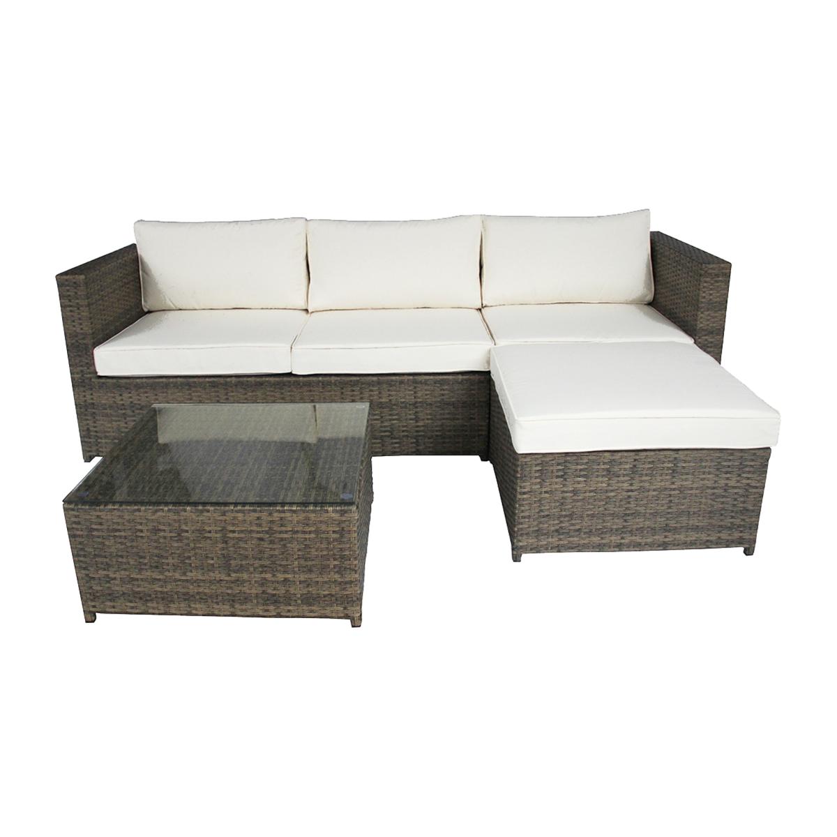 Create the perfect place to lounge in the garden, with this stylish L-shaped rattan furniture set. Designed for up to three people, this attractive set comprises an L-shaped sofa and comes complete with a footstool, for added comfort. Constructed from a highly durable variegated flat weave rattan, this modern furniture is finished with back and seat cushions for added comfort. Available in a choice of either grey or natural, this rattan sofa set is weatherproof, so can be left outside all year round. Please Notenbsp Matching outdoor furniture is available. Care Instructions To extend the product life and appearance, we advise storing the furniture in a cool and dry indoor place during the winter and unexpected weather conditions. Check that the furniture is completely clean and dry before storing indoors. Wipe with warm, soapy water and dry thoroughly. Features Showerproof (can be kept outside all year round)Machine washable coversIncludes. 2 seater sofaFootstoolTable Corner sofaMaterials. Aluminum Frame5mm Tempered GlassP. E Rattan200g UKFR PolyesterDimensions Corner sofa H64 x W73 x D73cm. Two seat size H64 x W136 x D73cm Stool H29 x W63 x D63cm. Tea table H29.5 x W60 x D60cm. Seat height 29.5cm Rattan thickness 1.2mm. Back cushion H35 x L65cm Thickness 15cm. Seat cushion L63 x W63cm Thickness 8cm. Stool cushion L63 x W63cm Thickness 8cmWeights. Corner sofa 7.9kg. Two seat size 13.8kg Stool 4.4kg. Tea table 7.7kg. Max. user weight 100kgColours. Grey rattan with charcoal grey cushions. Additional Info. Guarantee 1 year. Some self-assembly required. Full instructions provided. This product will be delivered on a pallet, which cannot be disposed of by the courier team. The recipient will be responsible for the disposal of the pallet.
