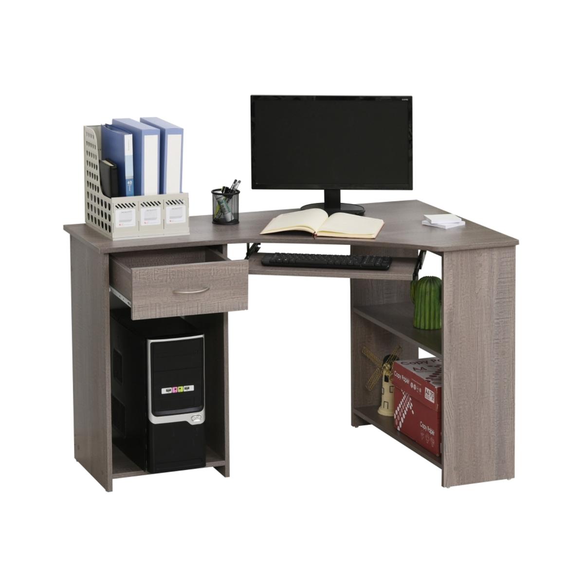 L shape fits snuggly into corners with ease,helping to efficiently utilise space in smaller areas. Suitable for homes, study rooms,offices and even shared accommodation. Features two side shelves, a drawer,a large open compartment,slide out keyboard tray and a flat table-top. Large compartment is suitable for your computers power tower unit. Made from thick particle board, the structure is made for everyday use. MELAMINE COATING:Smooth finish which protects against light wear. Easy to clean. Simple design in a neutral tone will look great anywhere. DIMENSIONS, 75. H X120W X 70. Dcm. Drawer inner, 8.6. H X29.8W X30. Dcm. Maximum Load 50K G.