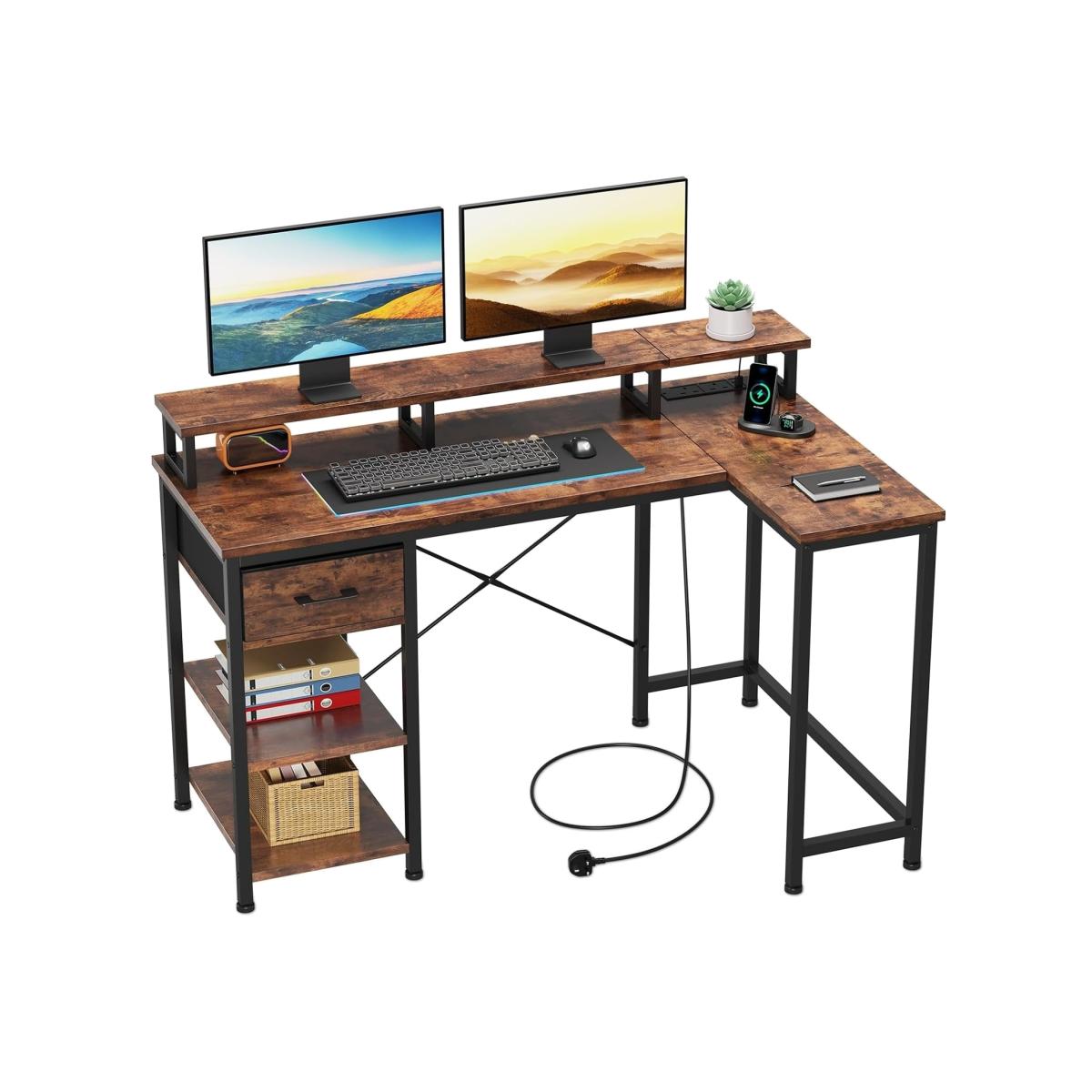 This L-shaped computer desk is equipped with built-in outlets and USB ports, providing convenient device charging. Its sturdy metal frames and particleboard construction feature an "X" design for enhanced stability, along with adjustable feet to ensure balance on uneven floors. The desk includes shelves and a monitor stand, offering organised storage and the ability to accommodate multiple monitors. Designed to fit neatly in corners, it maximises your workspace efficiently. It also comes with easy-to-follow assembly instructions for a hassle-free setup.