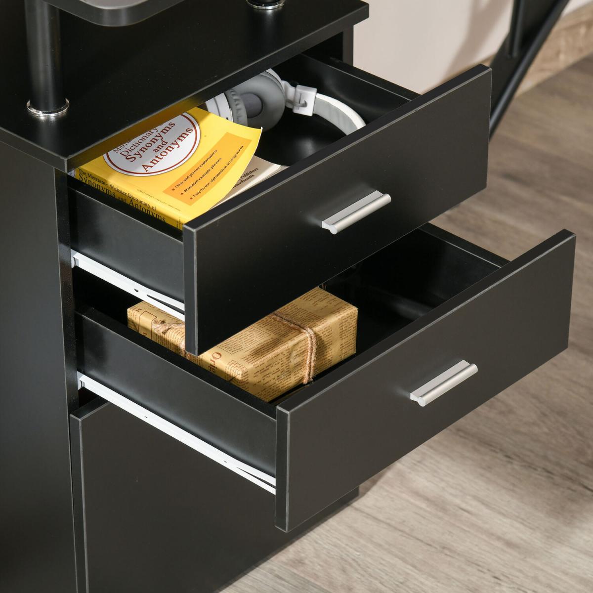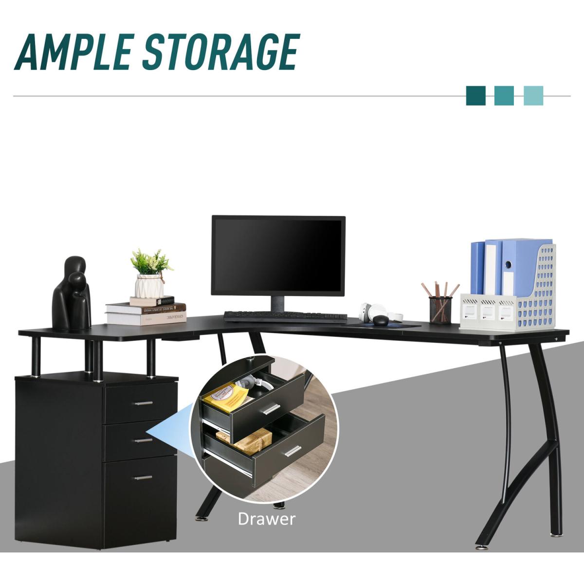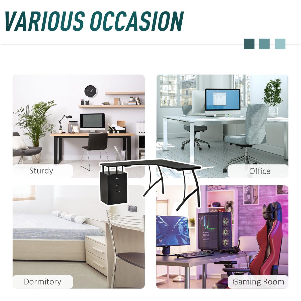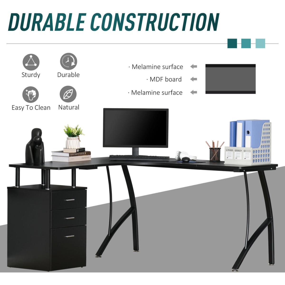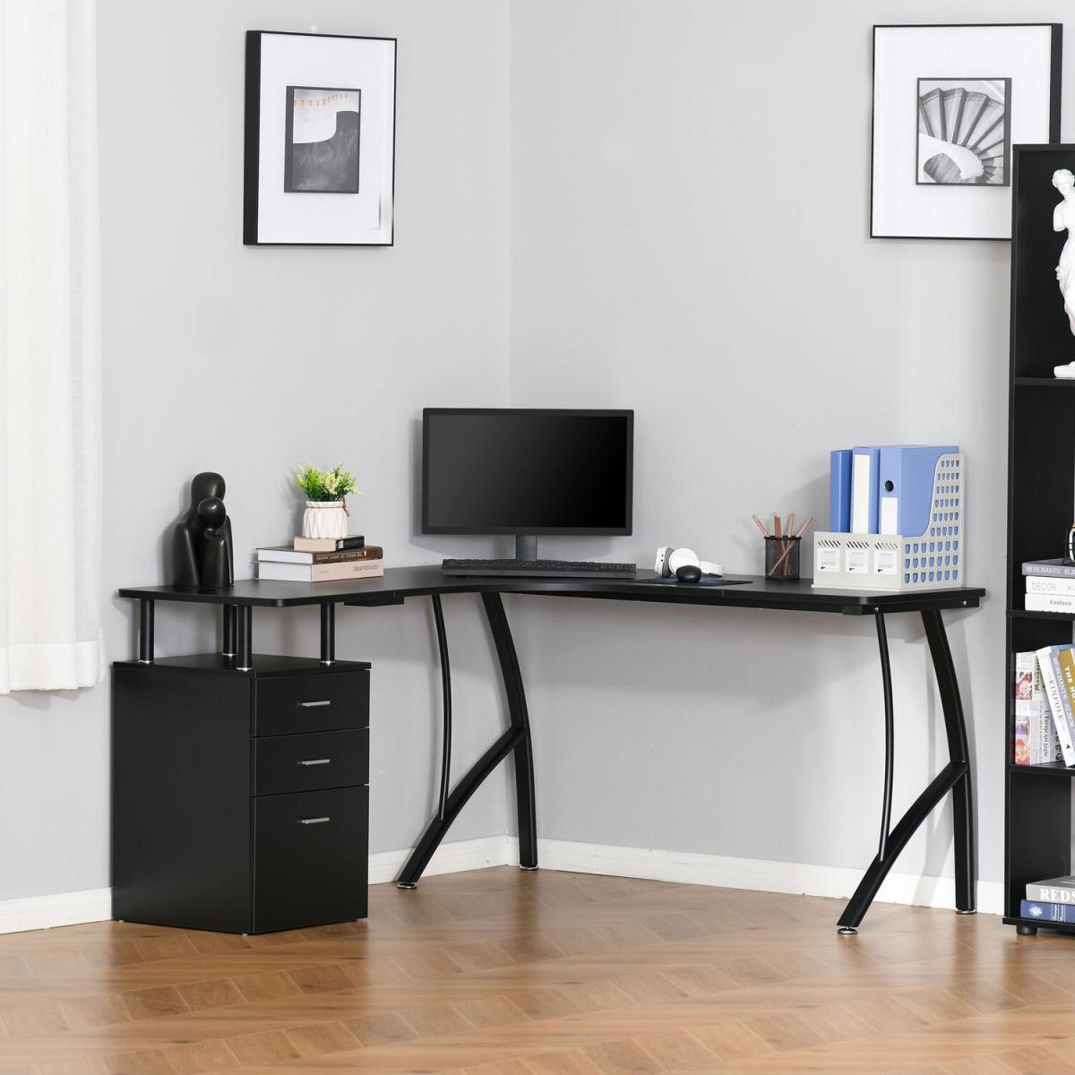 Modern and sleek, this work desk from HOMCOM looks as good as it feels when working, supporting you properly when you need to focus hard. Its 'L' shaped design fits perfectly into corners to help utilise space more efficiently. The frame is made from steel frame for a tough structure, fitted with MDF shelves so you can work well. There's plenty of space to work and have your computer and other devices on top. It's finished with a three-drawer cabinet so you can keep papers and more safely stored.