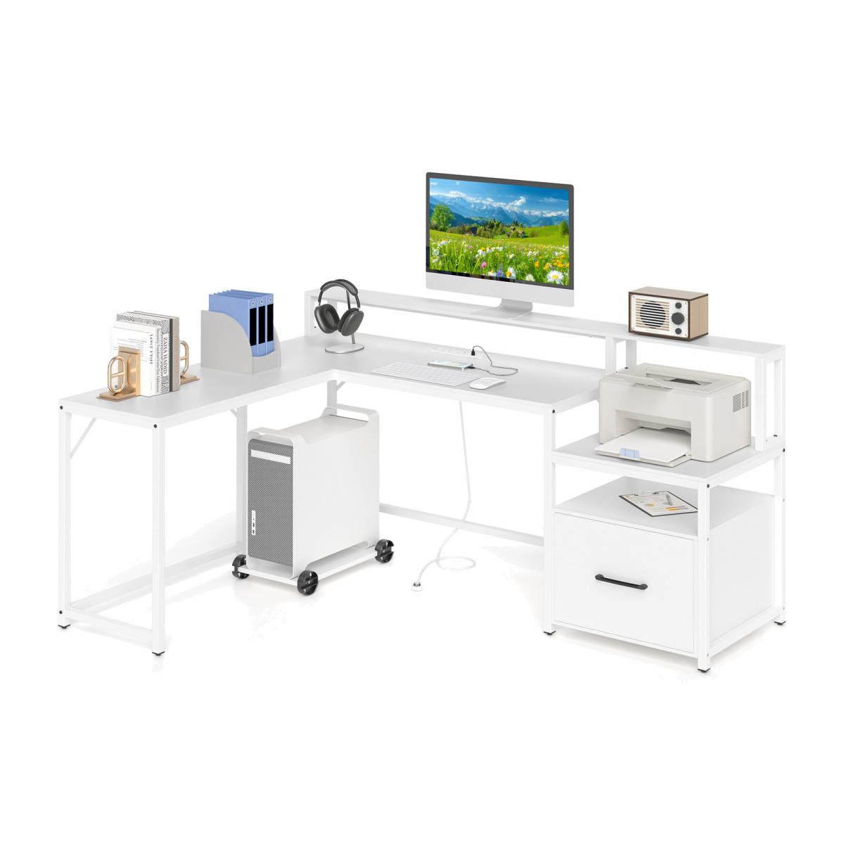 Revolutionize your office setup with this sleek, ultra-functional L-shaped computer desk! Say goodbye to cord chaos with the handy charging station featuring 2 AC outlets, a USB port, and a Type-C port designed to keep your tech at full power. Wave goodbye to clutter with ingenious storage options, including a printer stand and an adjustable file cabinet fit for all your documents. Experience unmatched viewing comfort, thanks to a cleverly elevated monitor stand that helps to protect your posture.