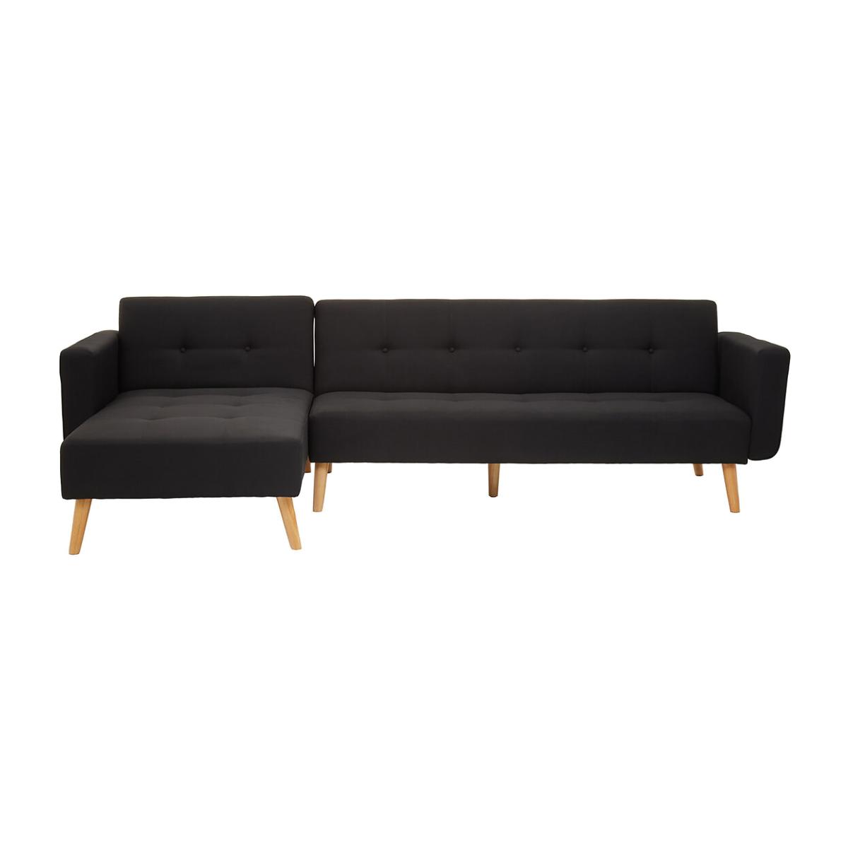 This retro inspired corner sofa bed features button tufted and is upholstered with high quality linen-polyester fabric, finished with oak wood legs. Product details. Seats 3 Upholstered in premium quality polyester linen Oak wood feet Medium comfort Foam fillings. Removable covers Scatter cushions included. Clean with a soft cloth. Avoid abrasive cleaners. For use as sofa bed. Sleeps 2. Click clack foldout action. Product Composition - Linen, Wood, Foam. Product Dimensions - 156 cm x 292 cm x 82 cm , Weight - 32 KGSeat height: 40cm. Seat width between the arms: 180cm. Seat depth: 58cm. Back height from seat: 40cm. Back height from floor: 40cm. Arm height from seat: 65cm. Clearance to floor: 18cm Parcel 1 Packaged Dimensions - 182 cm x 88 cm x 25 cm, Weight 37 kg Parcel 2 Packaged Dimensions - 88 cm x 182 cm x 25 cm, Weight 18.5 kg. This product will be dispatched by one of our trusted suppliers. You’ll be contacted by their selected courier about your delivery. PREMI01