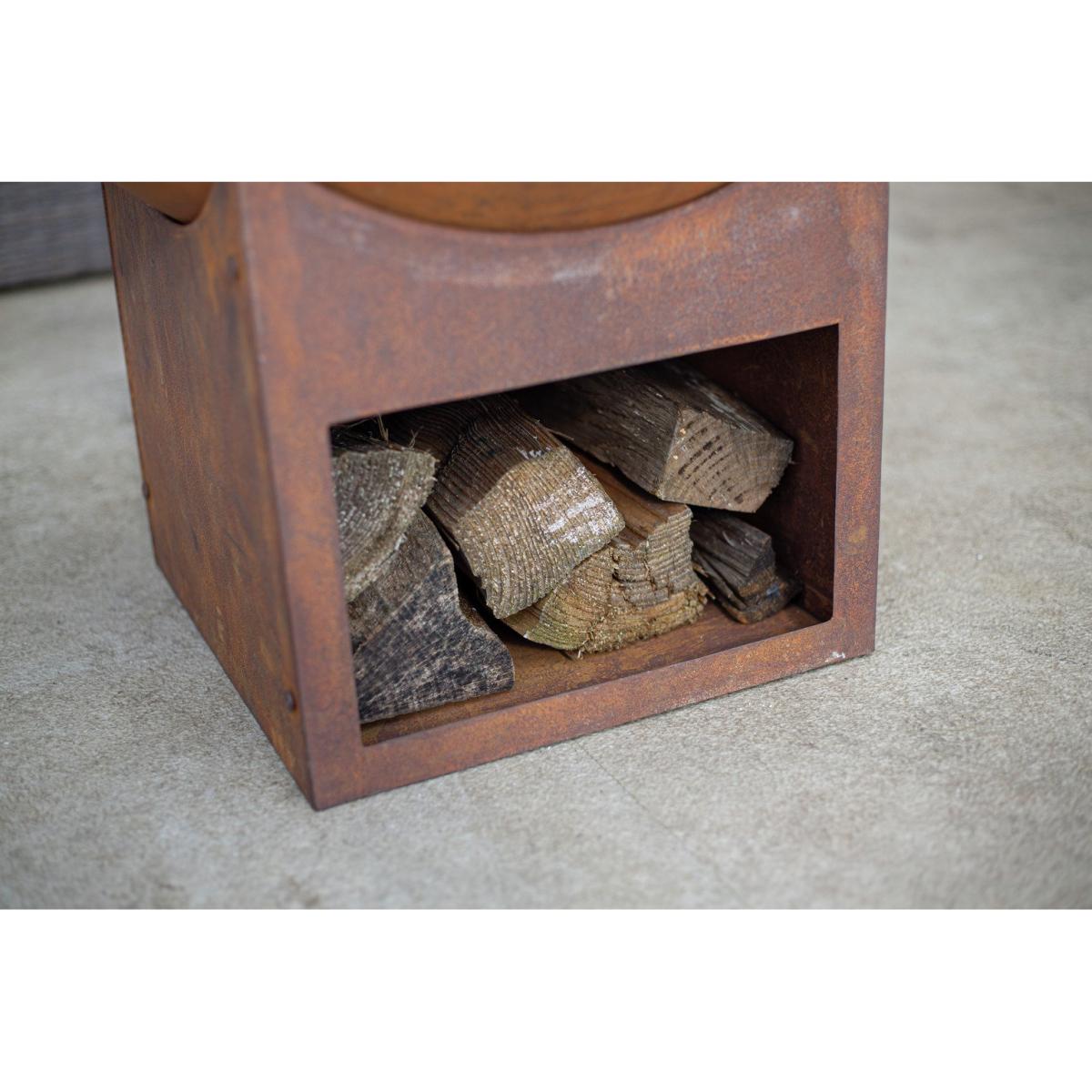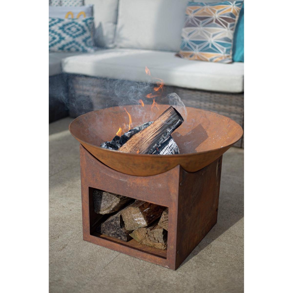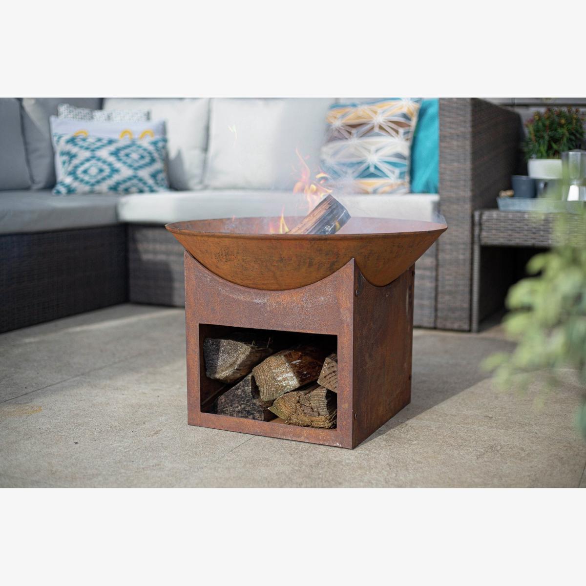Let the warming fire take centre stage at your outdoor gathering. Left outside to develop its rustic surface, the Fasa is innovative and functional. The handy, built in log store is perfect for storing your fuel when not in use and makes refuelling no effort at all. Constructed from a durable mix of cast iron and steel, this oxidised firepit is fuss and maintenance free. When left outside, the organic, naturally rusted finish continues to mellow and this enhances its character and appeal. Naturally rusted cast iron bowl and steel stand log store for neat and tidy fuel storage easy to assemble. Stand. Grill not included. Size H40, W56, D56cm. Weight 8.9kg.