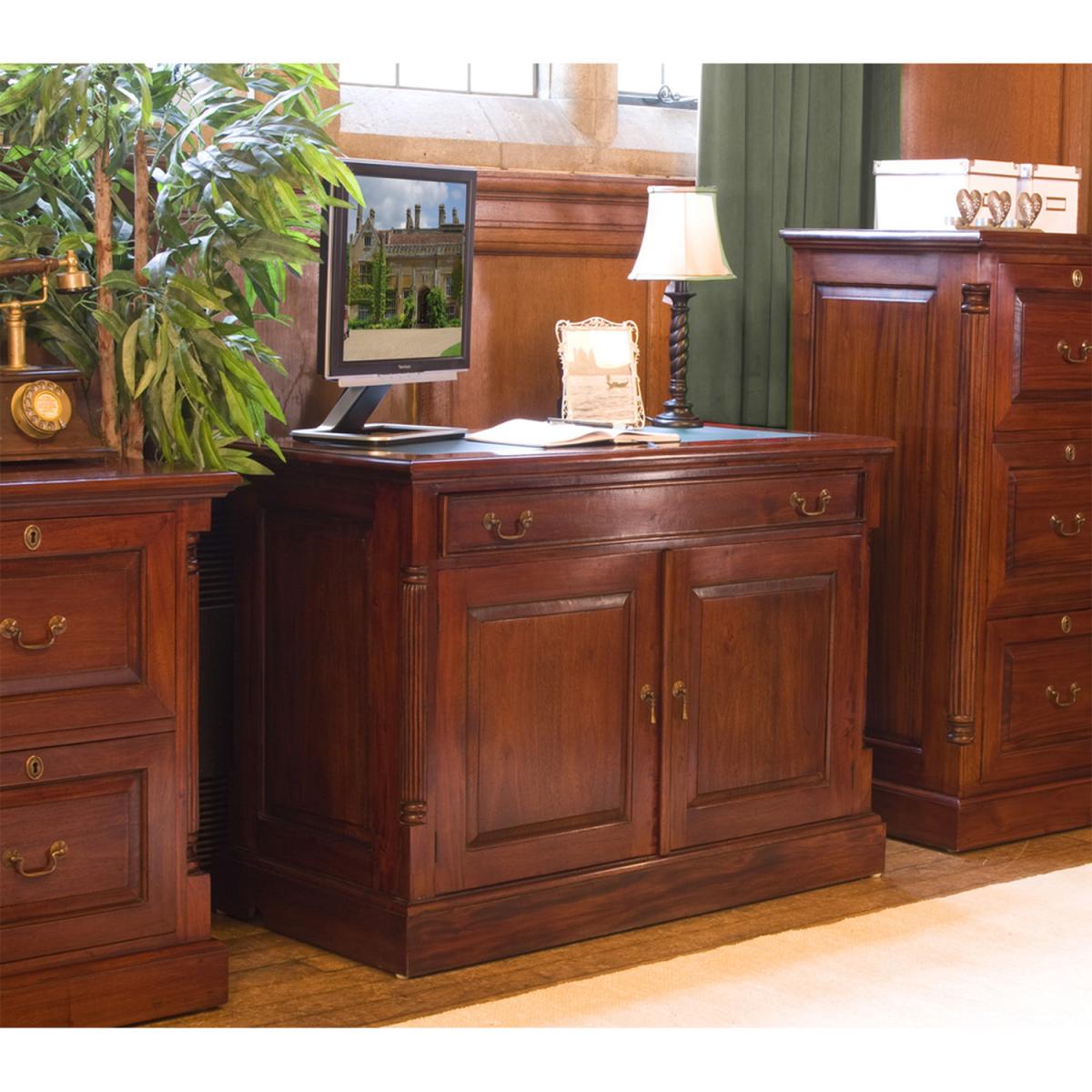 I’m a fan of this mahogany home office unit for its smart blend of storage and surface space - it tucks away your printer or paperwork behind neat doors, then doubles as a roomy desk by day. Its rich wood tone and simple brass handles sit comfortably within traditional or transitional schemes, especially alongside leather-bound books, a vintage desk lamp and a dark woven rug to ground the look. To style it, keep the desktop clear apart from a single statement lamp and a slim monitor or laptop; stow cables and office clutter inside the cabinet so the wood grain remains the focus. Add a sculptural vase of fresh foliage or a pair of brass bookends on top to introduce texture, and team with an upholstered desk chair in a muted fabric for comfort without competing with the wood’s warmth.