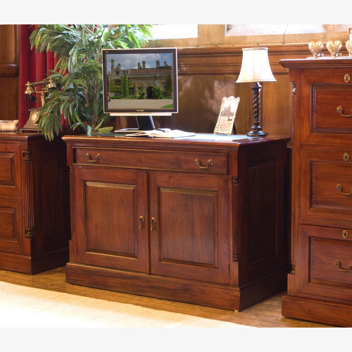 With the looks of a sideboard, this home office computer desk is a clever storage solution. The double handled drawer at the top pulls out to give you extra work surface. The double doors open to reveal a single shelf to the right and a PC tower and drawers to the left. This desk has all the exquisite detailing of the La Roque range.