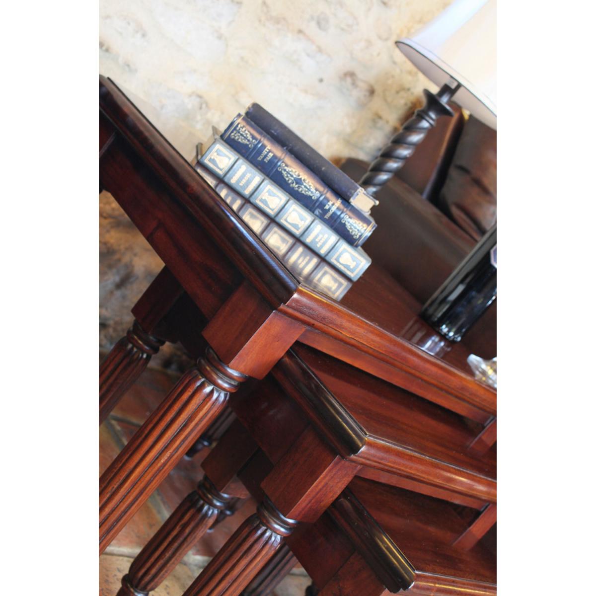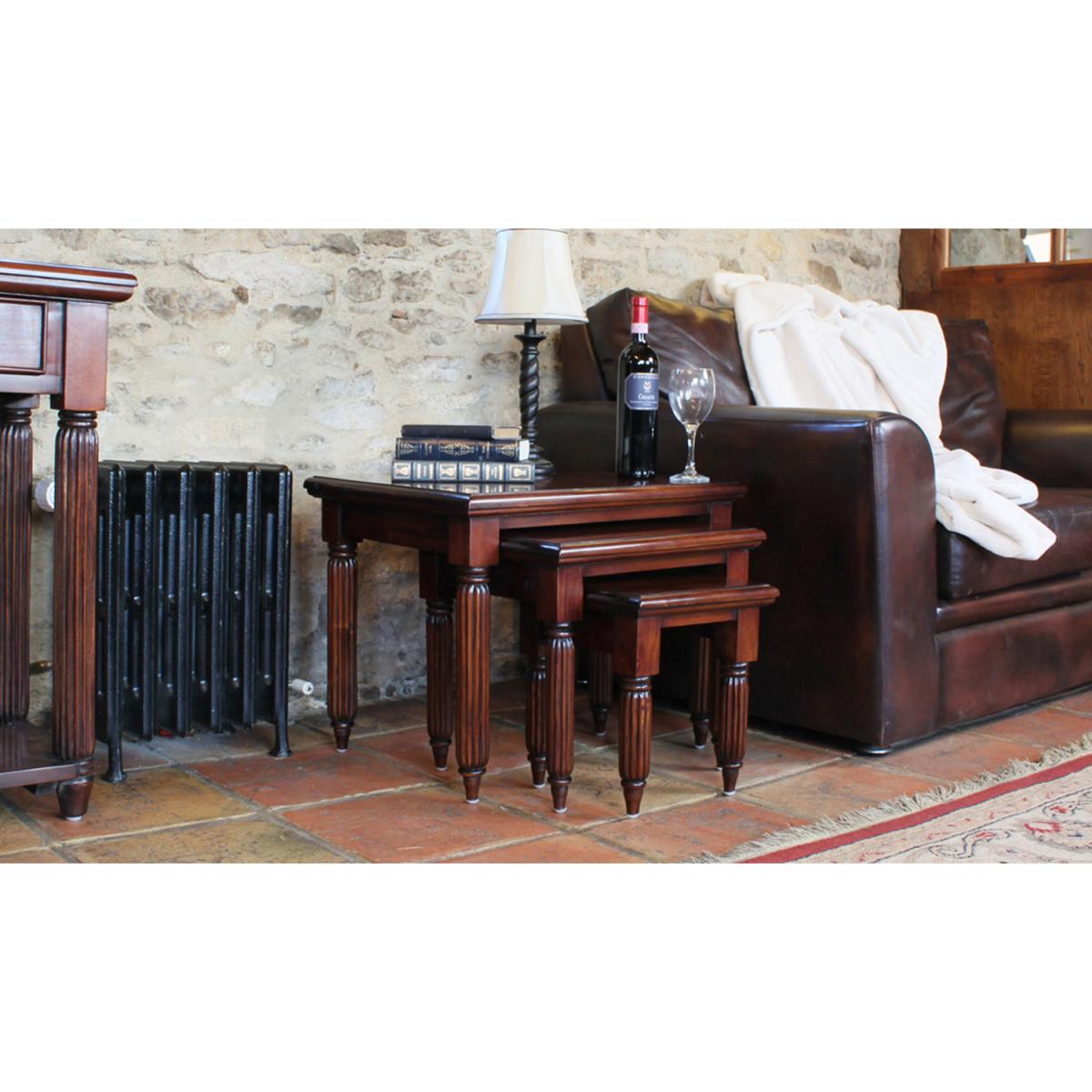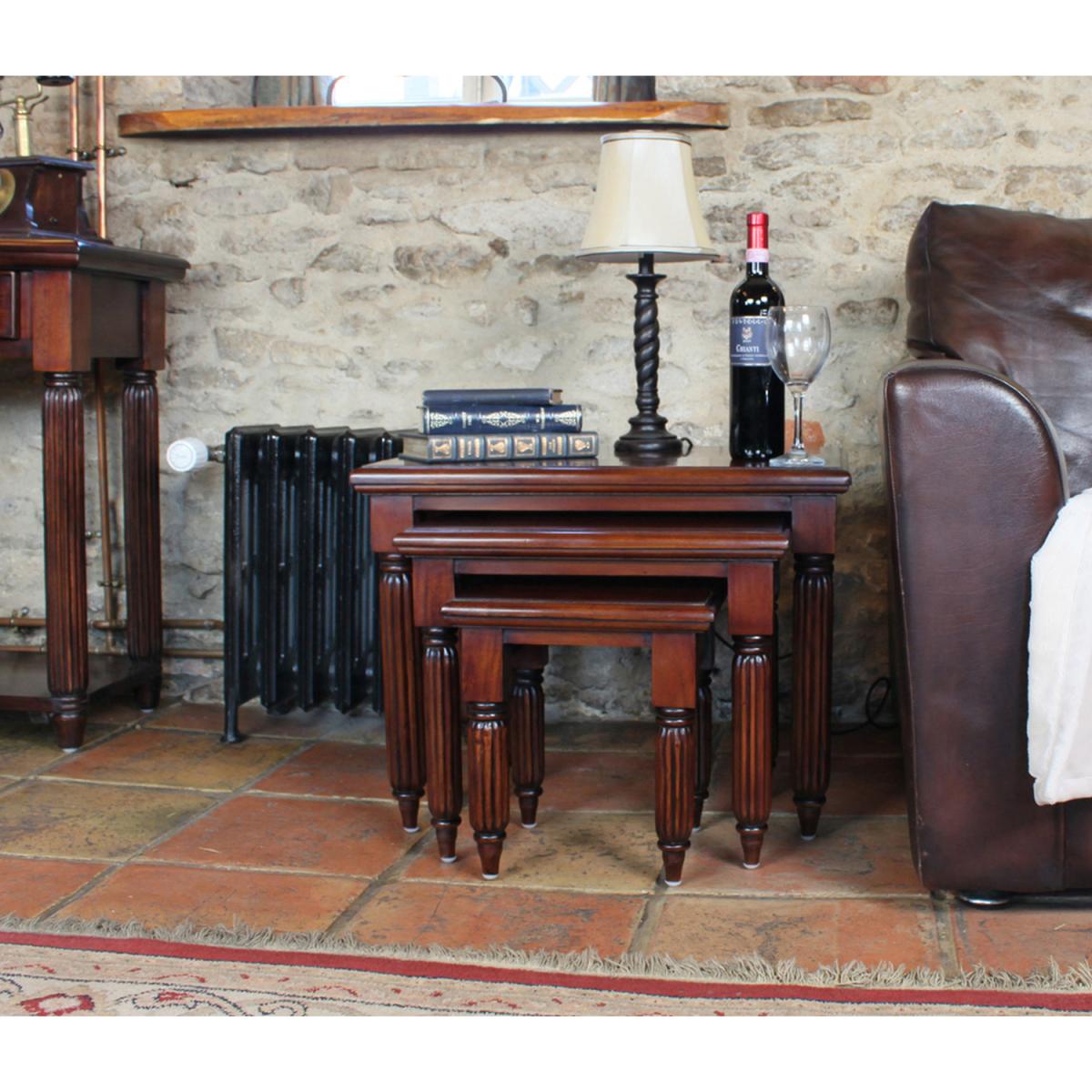 I love this set of nesting tables because of their rich mahogany finish, which adds warmth and a touch of traditional elegance to any living space. They're incredibly versatile and work well in both classic and eclectic interiors, providing flexibility to adapt to different room layouts or styling needs. Practical tips include using the smaller tables for side or accent pieces when entertaining, or stacking them neatly when space is tight. You can also style the tops with a few carefully chosen accessories-such as a small lamp, decorative books, or a tray of candles-to create a polished, inviting look without clutter. Overall, these tables are a practical yet stylish addition that can effortlessly elevate a room’s character.