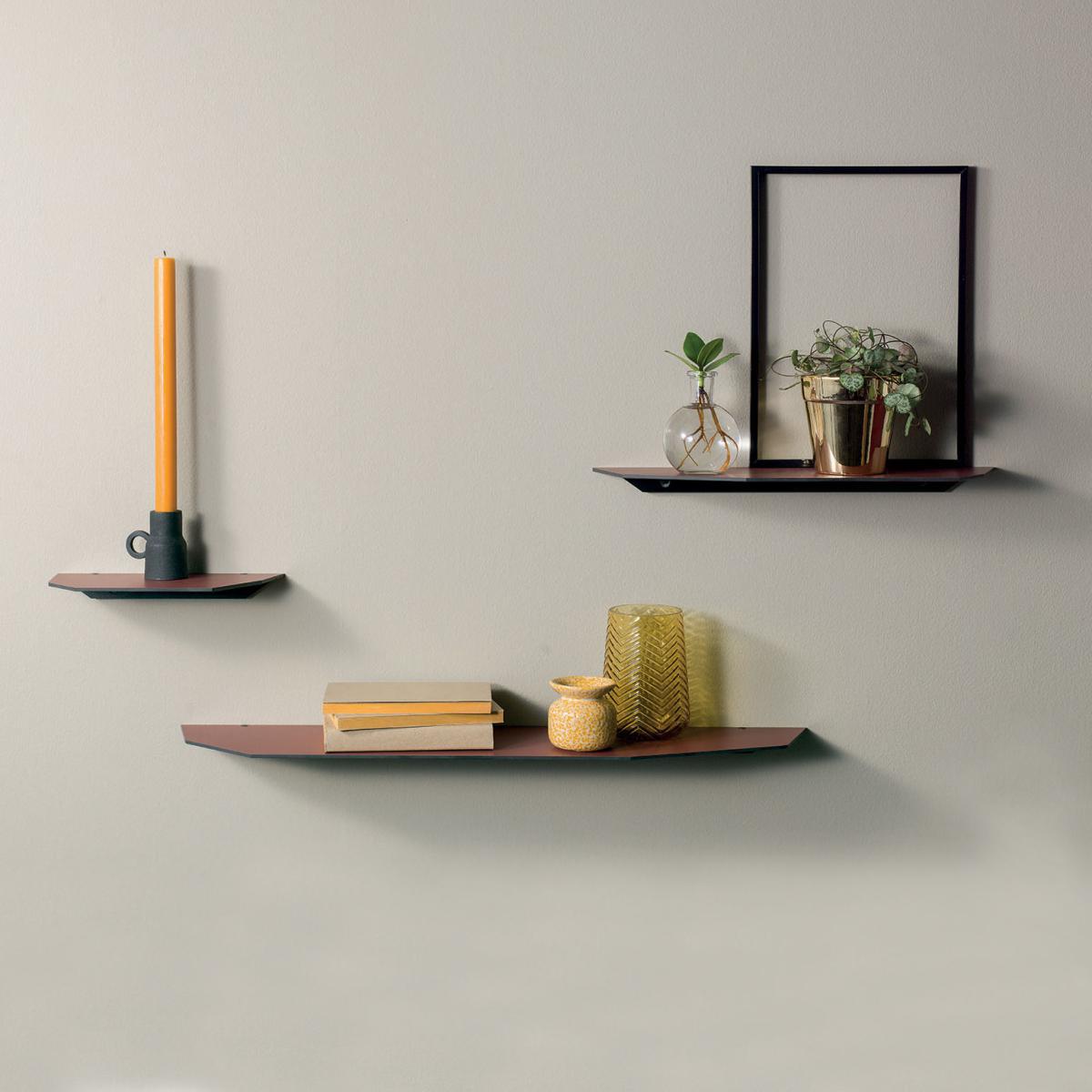 These shelves with their geometric shapes cling to the walls and defy the laws of gravity. They come as a set of three display surfaces to arrange to match your desired interior landscape. These shelves are delicate pedestals for displaying your favourite items like museum pieces! Try your hand at being an artist and let your imagination do the talking by transforming your interior into a mini-gallery of "home" artworks. These shelves can be used to hold a trinket tray in a cramped entrance. They can hold beauty products in the bathroom or an alarm clock in the bedroom. One thing is certain: they’ll come in useful everywhere. These shelves are the perfect complement to the vertical wanderings of Horace, the chamois goat-shaped wall shelf by Ibride. They come in the same coloured harmony and follow the famous ascent in an elegant graphic game.