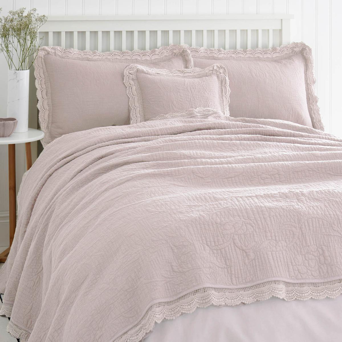 Featuring a stitched abstract floral pattern and finished with a lace trim, this blush pink bedspread is 100% cotton and machine washable. Available in two sizes. 235cm x 235cm – Suitable to cover a double and kingsize bed. 265cm x 265cm – Suitable for a super kingsize bed.