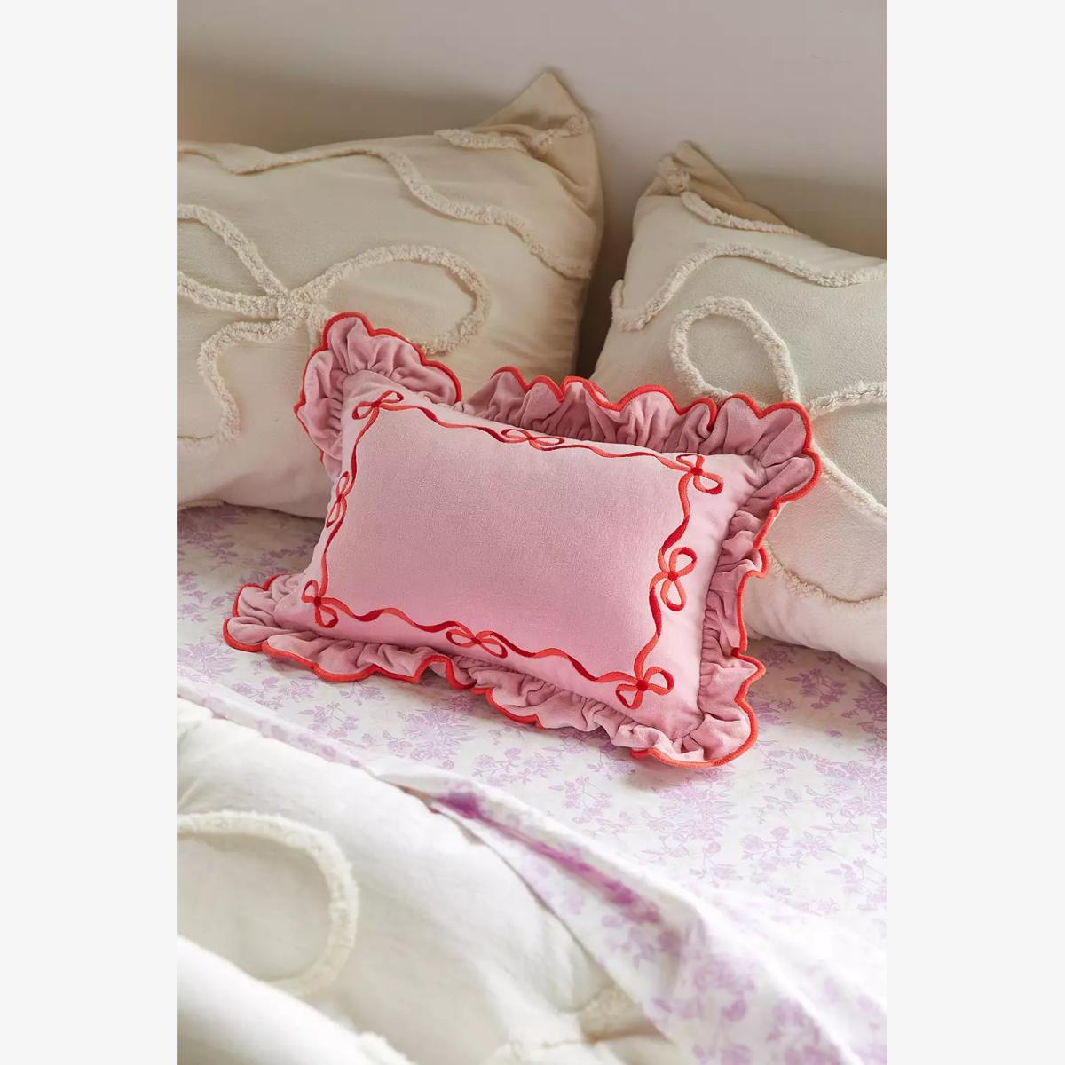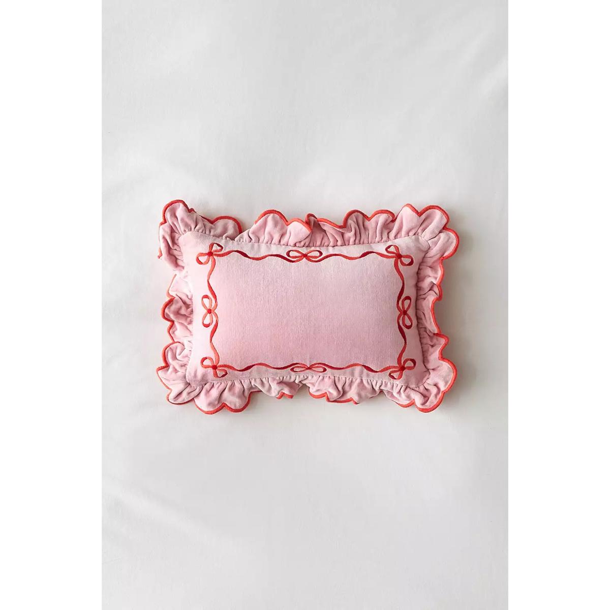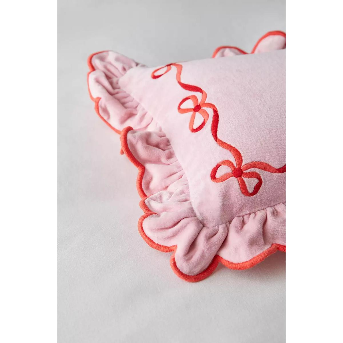 A femme finishing touch to your bed or sofa, this velvet throw pillow features embroidered bow icons framing the top panel. Finished with ruffled edges accented with contrasting trims for a colorful statement. **Content + Care** \- 100% Cotton \- Spot clean