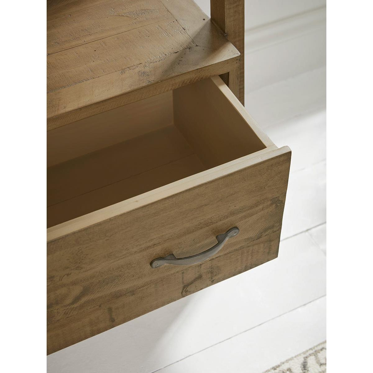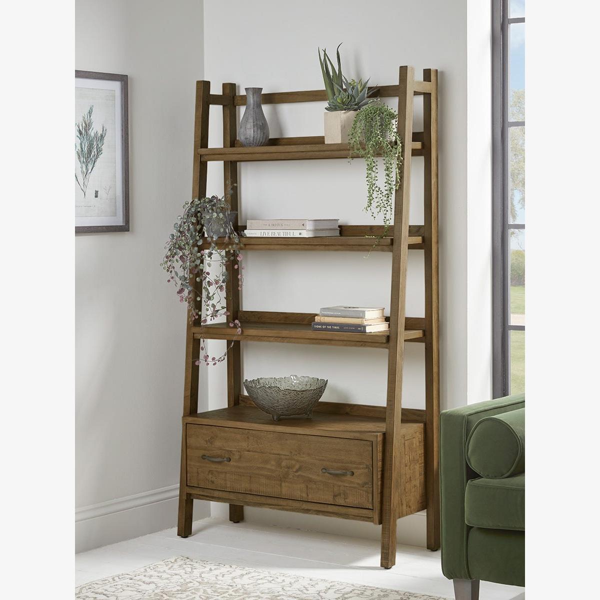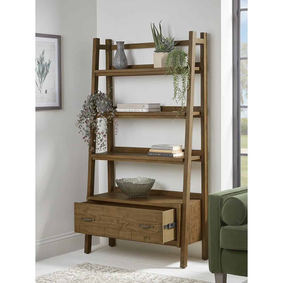 Three shelves sit above a drawer in this ladder style shelf unit, perfect for styling your favourite ornaments as well as keeping clutter at bay.  Made from a natural wood, the unique patina creates a rustic feeling, making this unit ideal for a more industrial style.