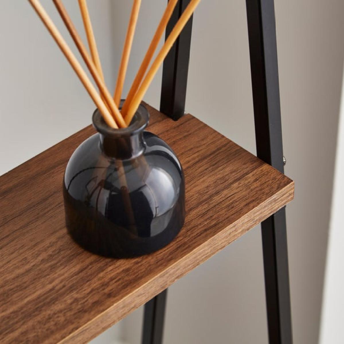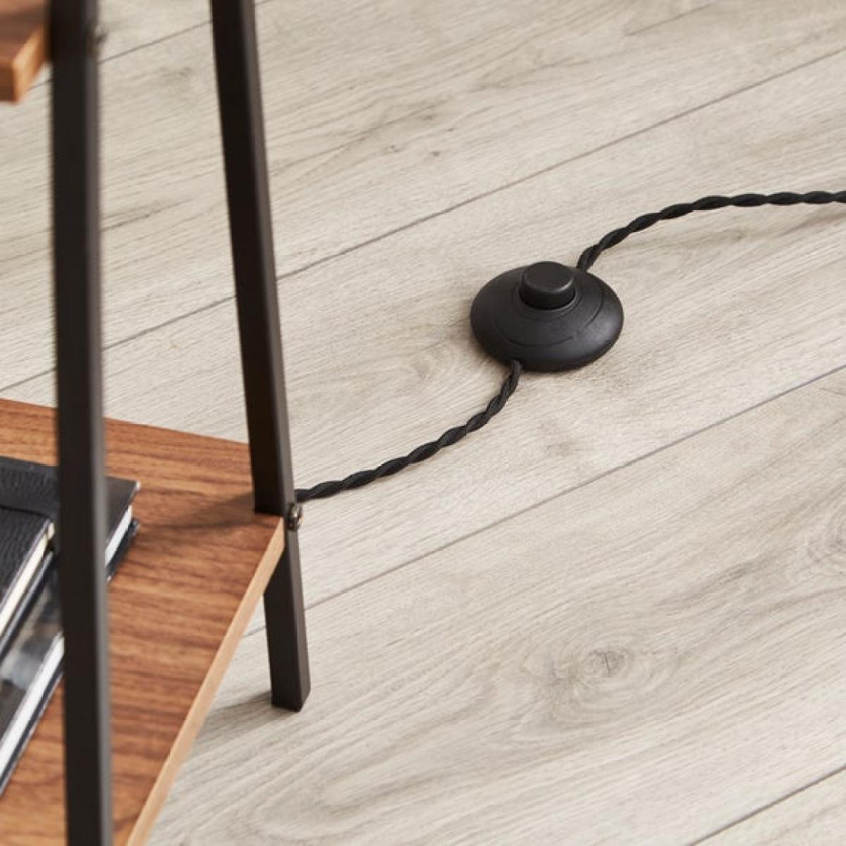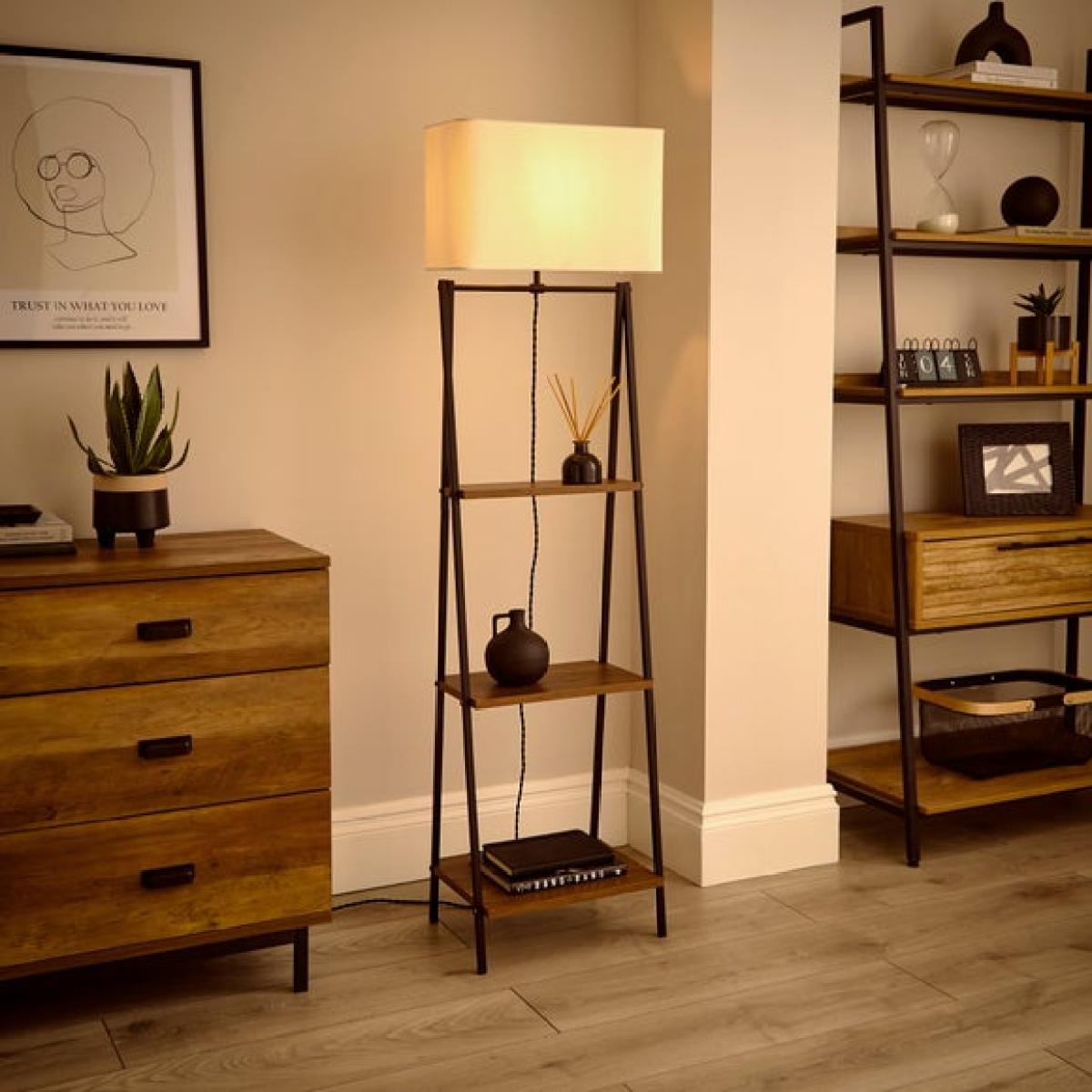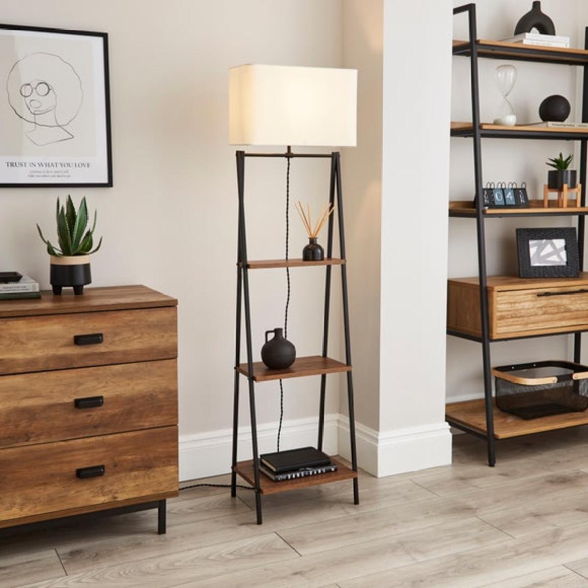 * Industrial-Inspired Design * Made from Fabric, Metal, & Engineered Wood * Versatile - Offers Storage Space Here's to the Ladder Shelved Floor Lamp - your home's newest must-have! It combines black coated metal with a natural linen shade, whilst featuring stylish walnut-finished shelves - bringing both warm light, and practical storage, to any space.