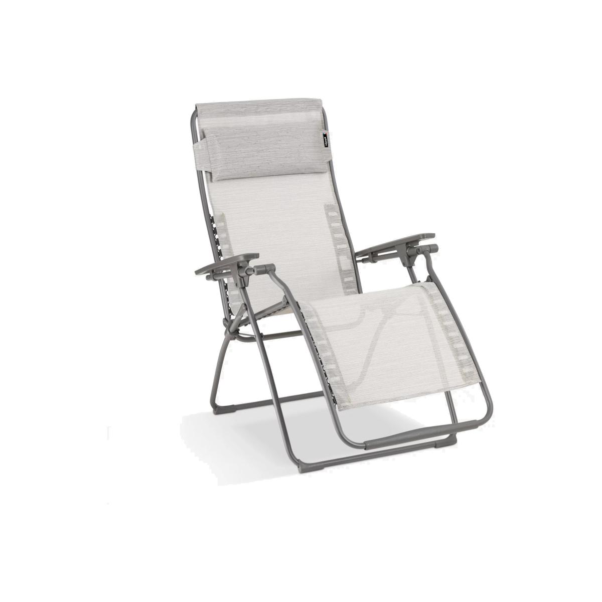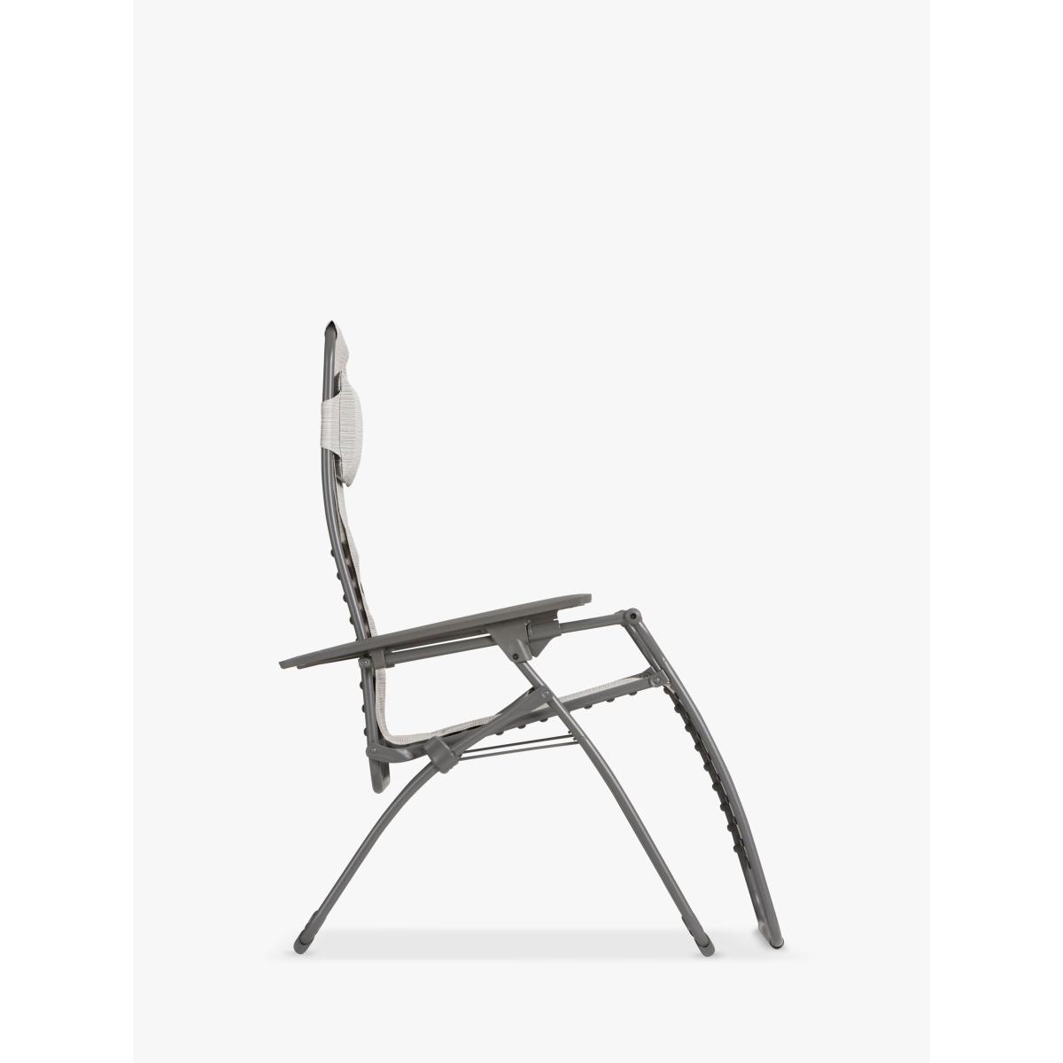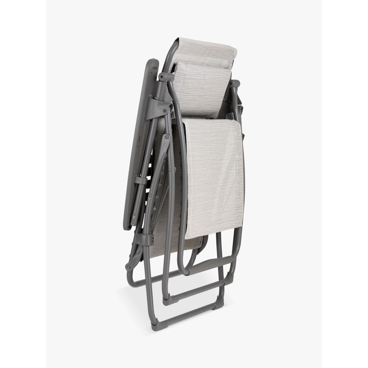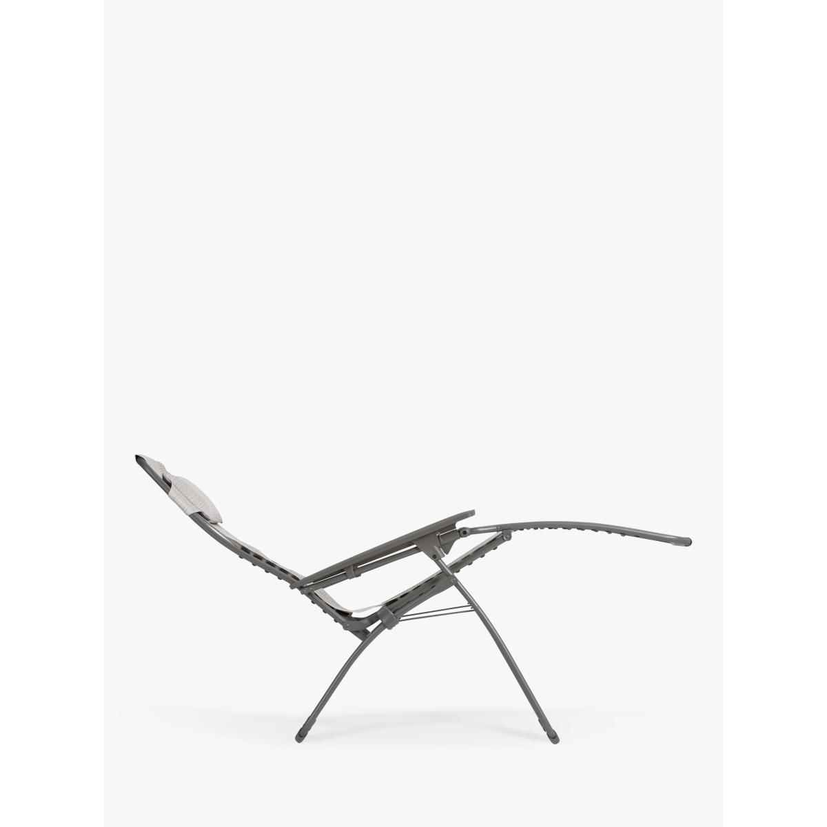 Designed for ultimate relaxation outdoors, this Lafuma Futura Recliner Sun Lounger has a principal position that rests the legs just above the heart so you feel properly relaxed. Angled at exactly 127 degrees, the chair's zero-gravity position aligns the body, reducing tension in the lumbar region and improving circulation in the lower limbs. You can easily change the reclining position and raise the seat up very simply, using the armrests. The armrests remain fixed which allows for firm pressure when you want to stand up out of the chair. With the help of its patented clip suspension system, forming the link between the tubing frame and the strong Batyline fabric, the chair provides firm comfort and excellent back support and benefits from an ergonomic back rest and padded foot bar. Multi-position 127-degree angle for zero-gravity feeling Patented clip suspension system for comfortable support Adjustable and removable headrest cushion and a footrest Folds for compact storage About the material - Batyline® Duo 1 warp thread / 2 weft thread weave Original style effects Durable, resistant to UV exposure and ripping Open weave promotes an ultra-quick drying time Anti-fungal treatment prevents mildew Easy to clean Want to see it first? You may want to see and get a feel for the product in one of our shops before ordering. We'll be able to tell you where the range you'd like to view is on display.