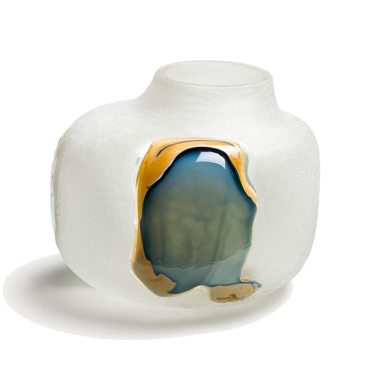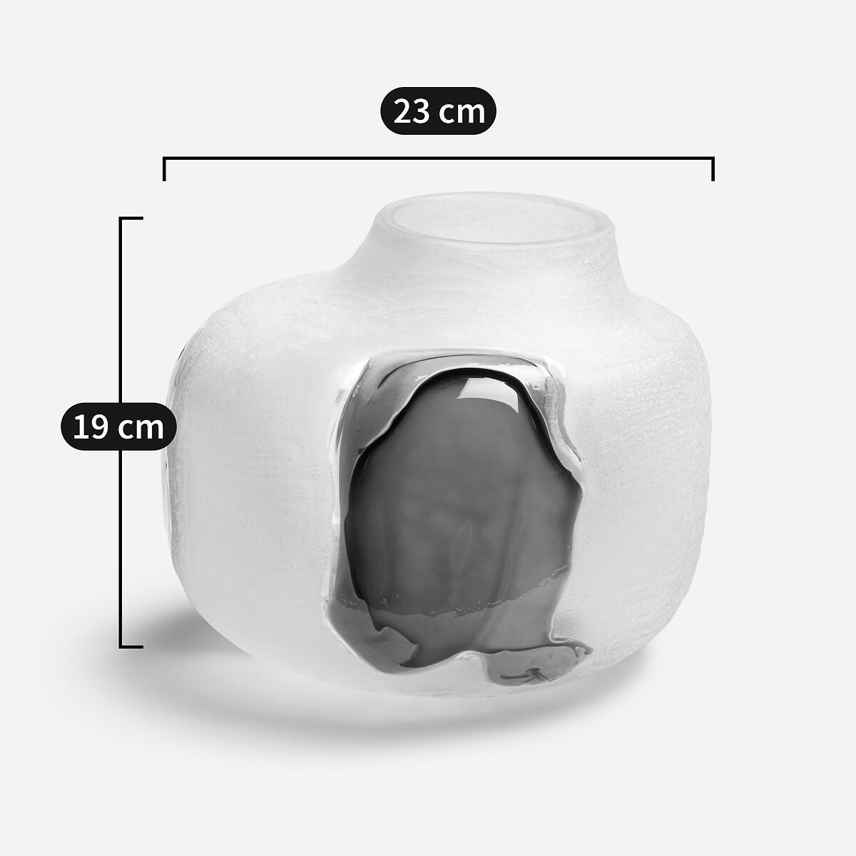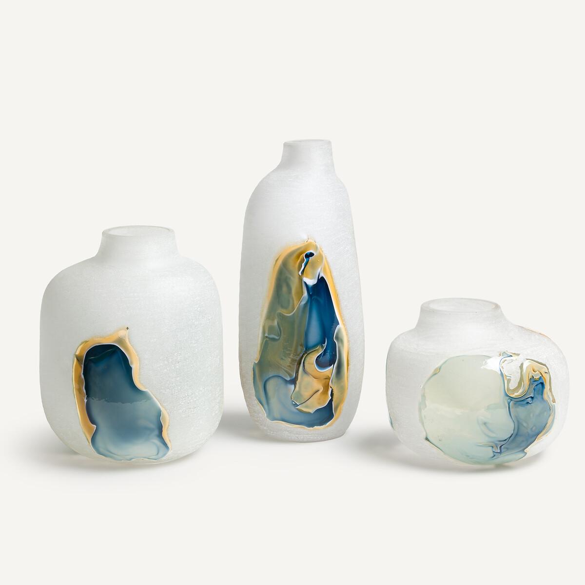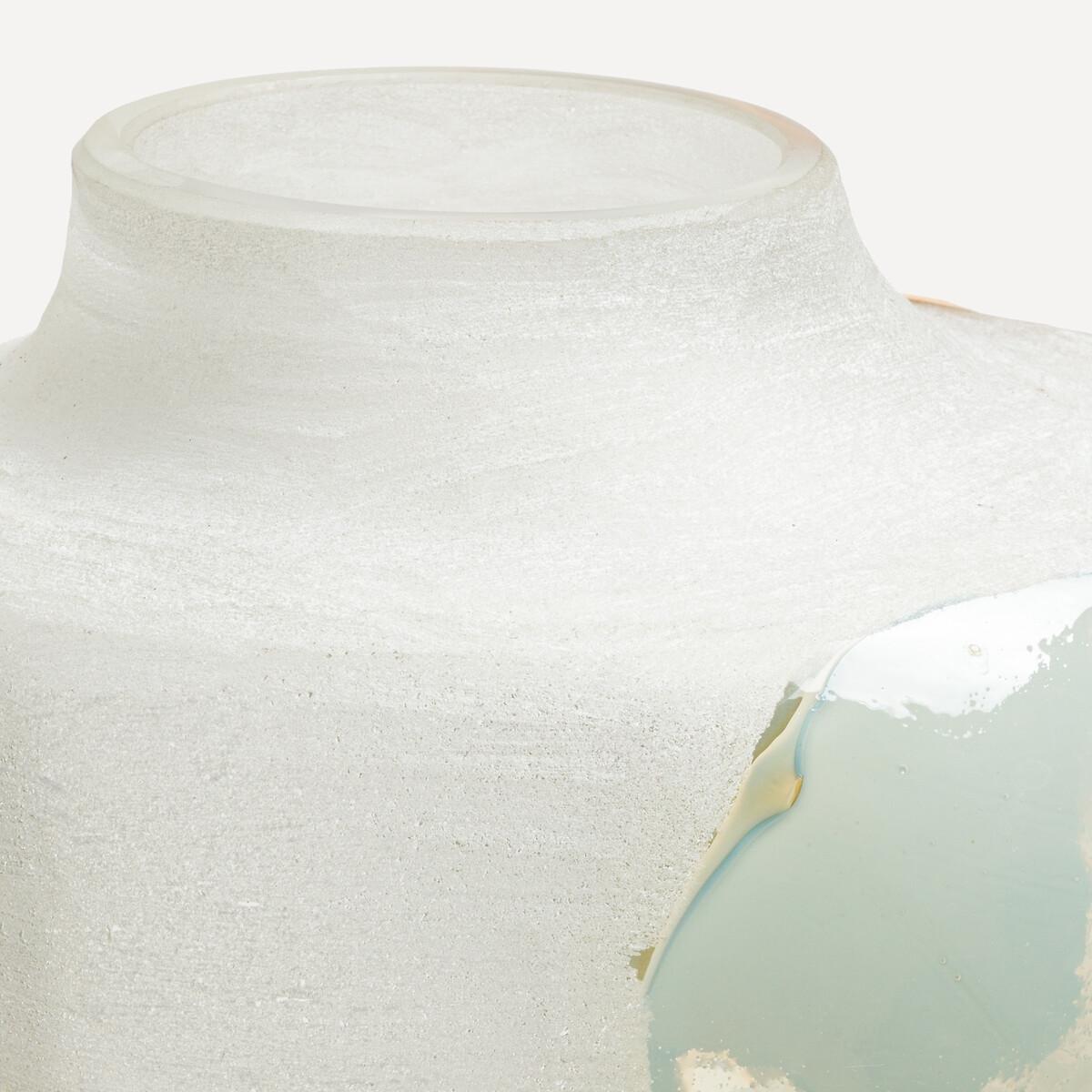 Its subtle and strikingvisual effects are created by hand by the glassmaker. The hand-blown glass is frosted to create a textured, opalescent appearance. Touches of glass are affixed to create a lagoon with mineral tones, veering between land and sea. Product Details • Made from hand-blown glass • Hand-crafted, each piece is unique. Shapes, colours and dimensions may vary slightly from product to product. Dimensions • Diameter: 23cm • Height: 19cm. Dimensions and weight of parcel • 1 parcel • L28 x H24 x D28cm. 1.2kg