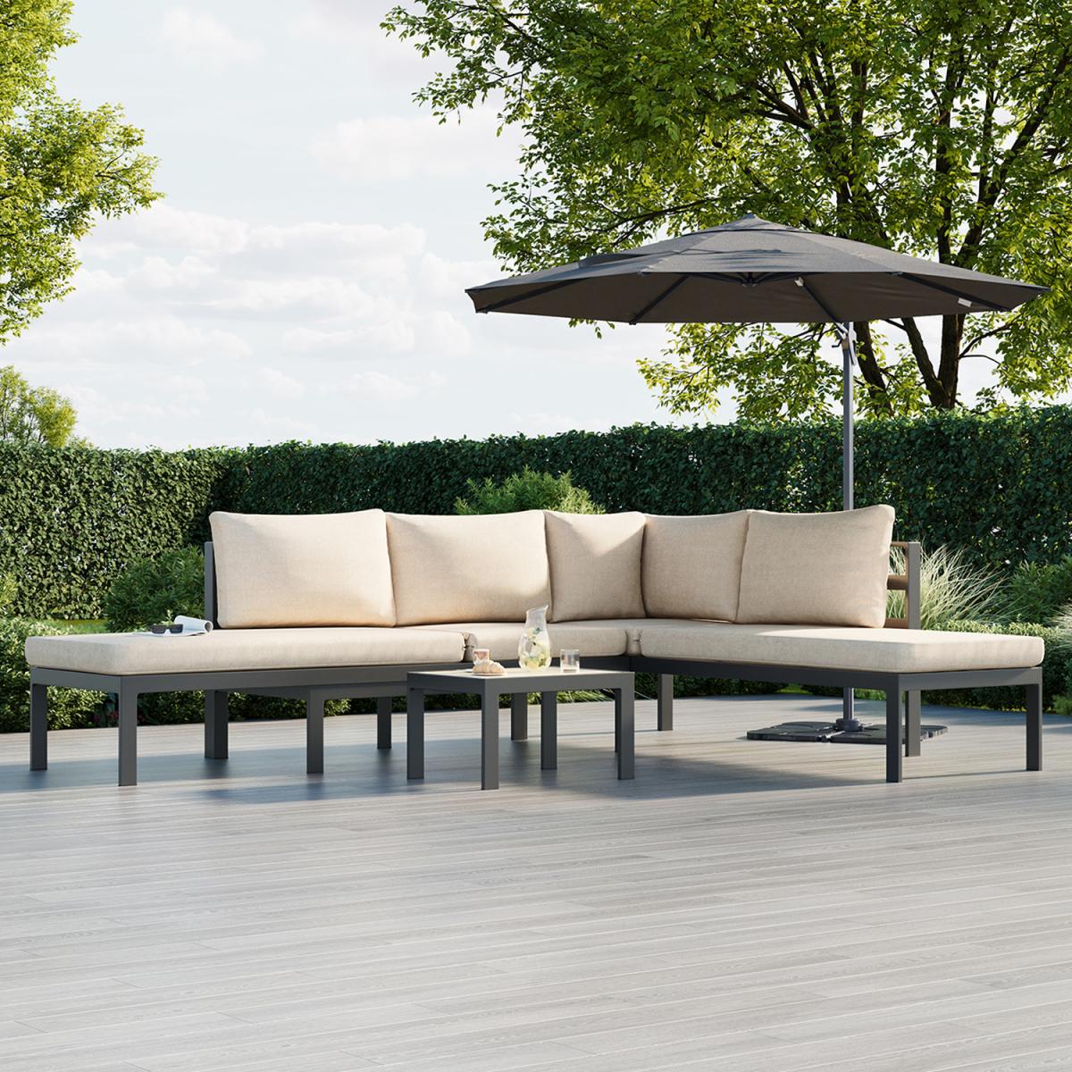 Our Lagos Modular Aluminium Lounge Set is the ultimate multifunctional outdoor seating solution, offering four adaptable configurations to suit any occasion. Designed for versatility, it can be arranged as a spacious corner sofa, or transformed into a luxurious double sunlounger with individual recline options. Crafted with a sleek anthracite aluminium frame and deep-filled, plush cushions, it provides a stylish and comfortable space to relax. The weather-resistant, UV-protected fabric ensures lasting durability, while the matching coffee table offers the perfect spot for drinks and essentials. Whether you're unwinding alone, lounging with a partner, or hosting friends, this all-in-one set is designed for effortless outdoor living.