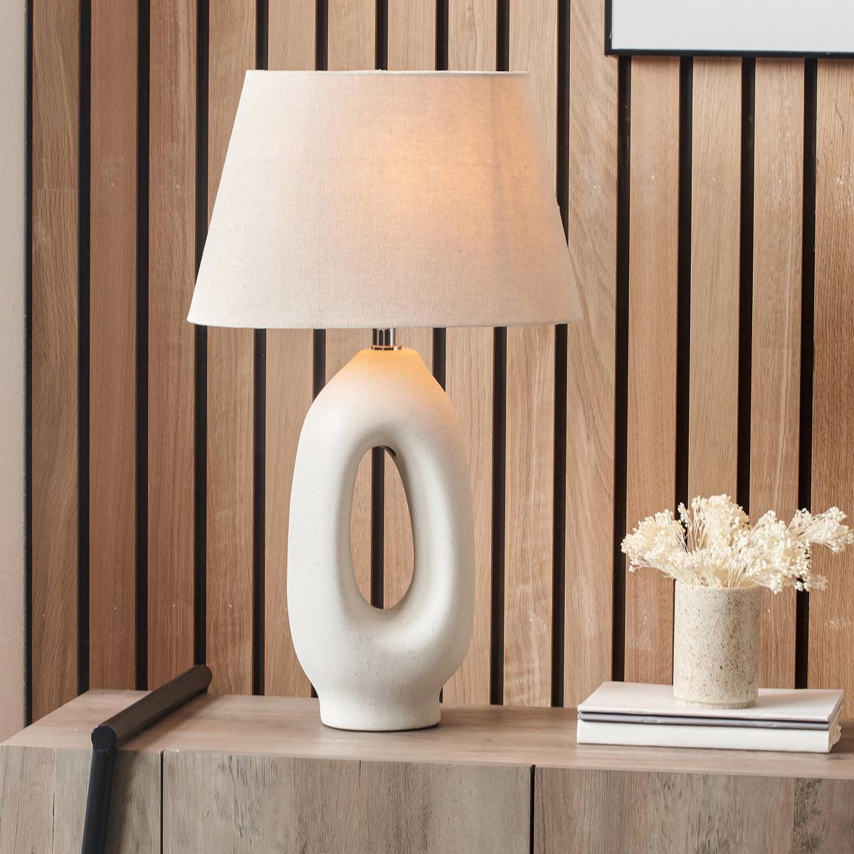 * Bulb required: 1 x ES (Edison Screw) - E27* Bulb(s) not included* Tall, organic design* Self lined linen shade* 2.5m cable with an In Line switch The Laila Natural Organic Tall Ceramic Table Lamp is a quirky and stylish addition with its tall organic ceramic base paired with a neutral, self-lined shade. Perfect for scandi or coastal style interiors, this lamp is eye-catching and versatile.