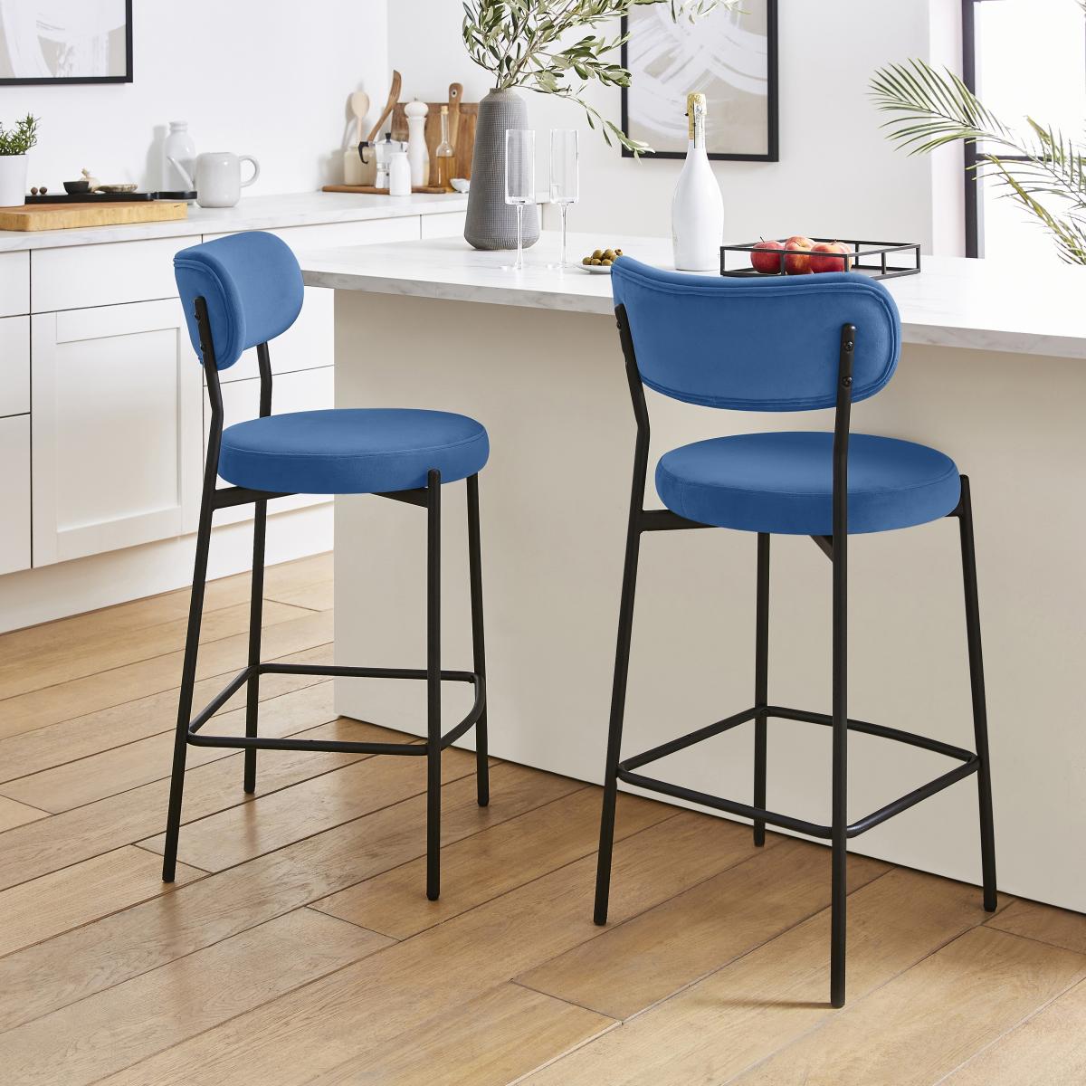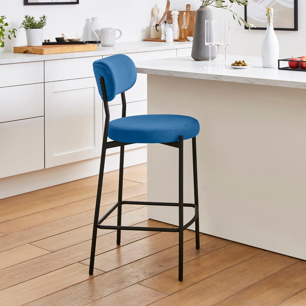 I love this chair for its vibrant blue hue, which adds a pop of colour and a touch of sophistication to both contemporary and eclectic interiors. The soft velvet finish elevates its look, making it suitable for luxury kitchen islands or casual breakfast bars. It works well paired with neutral tones to highlight its colour or with patterned accessories to create visual interest. For practical styling tips, consider using it in spaces where you want to combine comfort with style-adding cosy cushions or contrasting metals can enhance its aesthetic. Keep in mind that its plush velvet makes it ideal for low to moderate use areas, and occasional cleaning will help maintain its rich colour and texture.