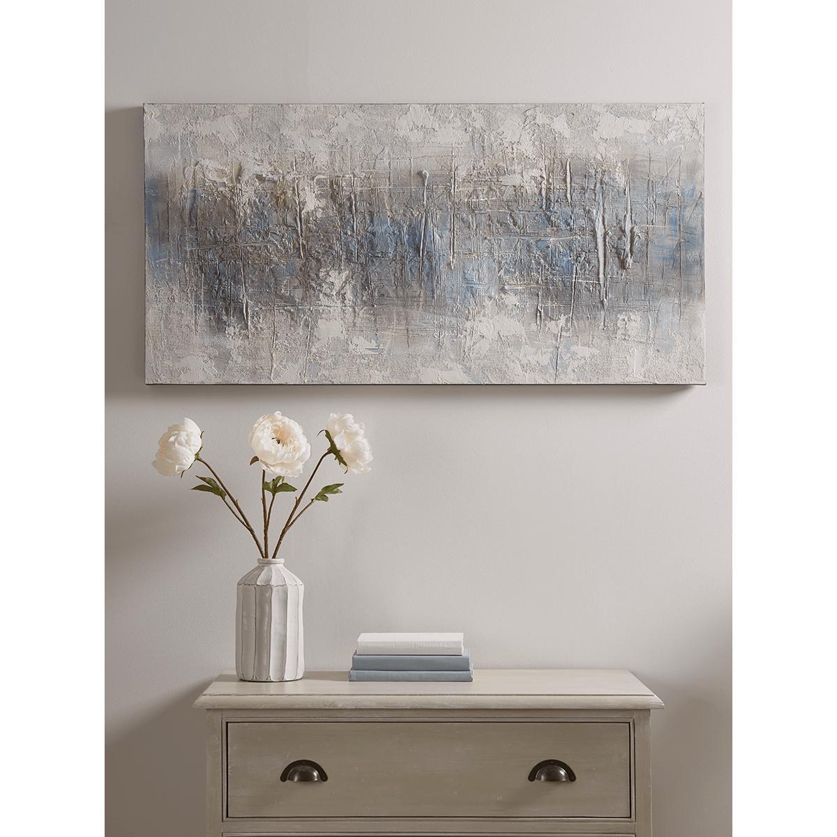 The impression of cloud reflection in an expanse of water is here captured in a richly textured media on canvas for a striking artwork. Add beauty to any space as our piece intrigues the eye by abstract treatment and a patchwork of cool restful shades.