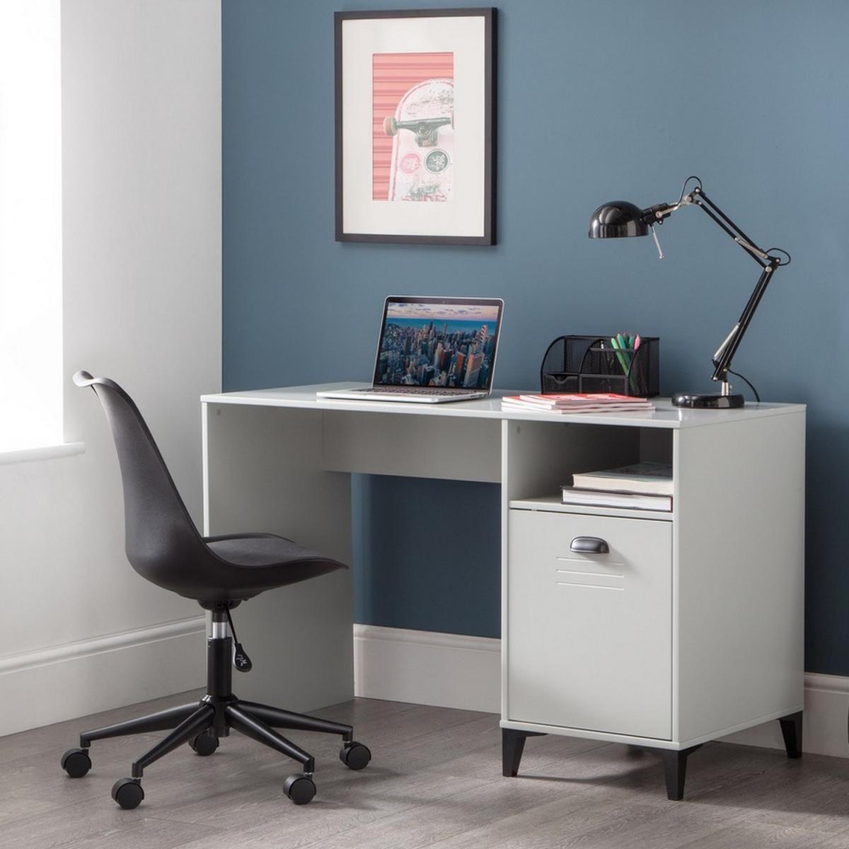 I’m a fan of this grey locker desk for its clean lines and built-in storage, which means you get a work surface and a neat filing cupboard in one compact piece. Its muted finish and slim metal legs suit both minimalist and industrial-leaning interiors, while the neutral tone makes it easy to layer in warmer woods or brighter accents. To style it, keep the desktop uncluttered with just a desk lamp, a small plant and a stack of notebooks. Use the locker section for papers or tech accessories, and consider floating shelves above in black or pale timber to echo the desk’s legs. Finish by adding a simple cork or fabric noticeboard on the wall for both function and texture.