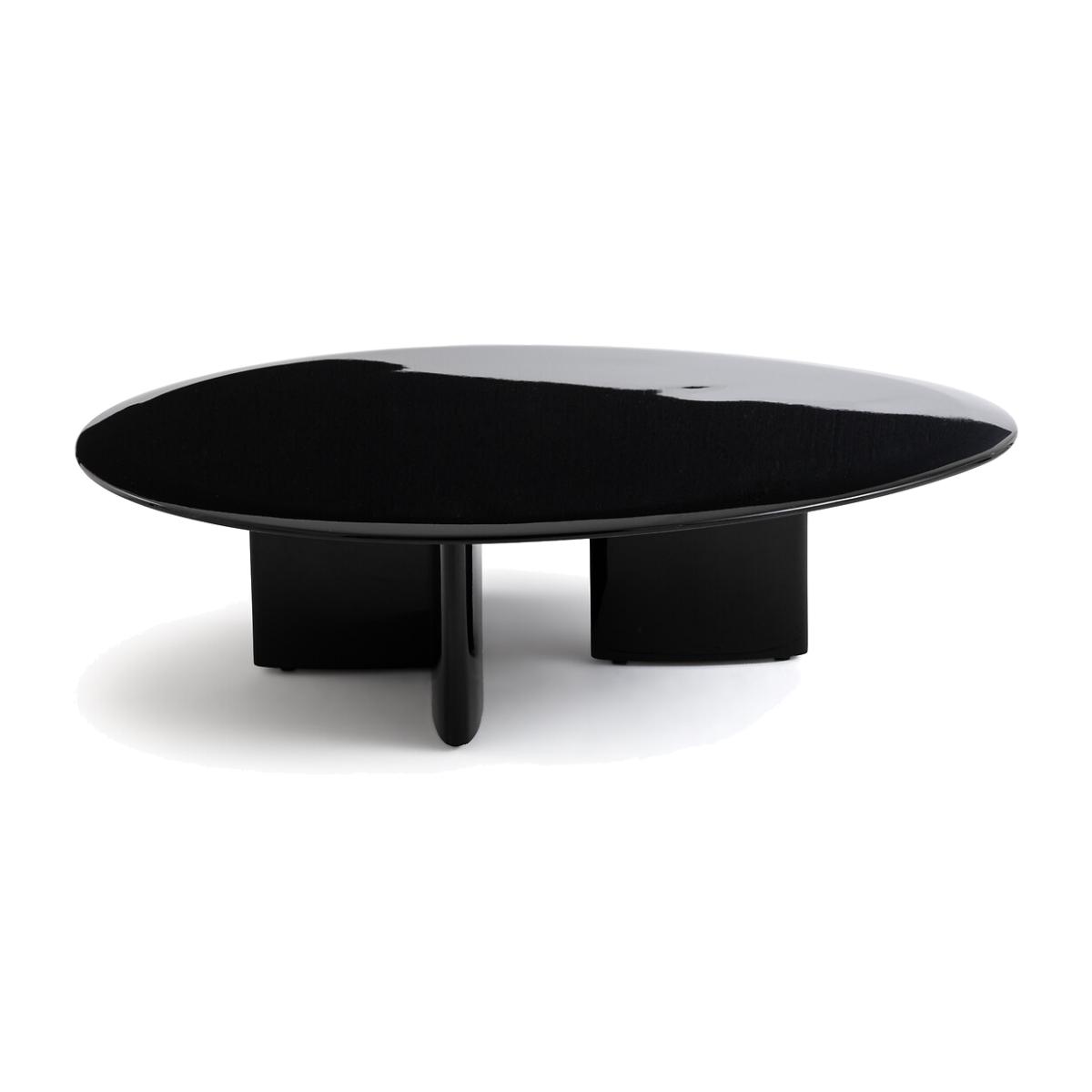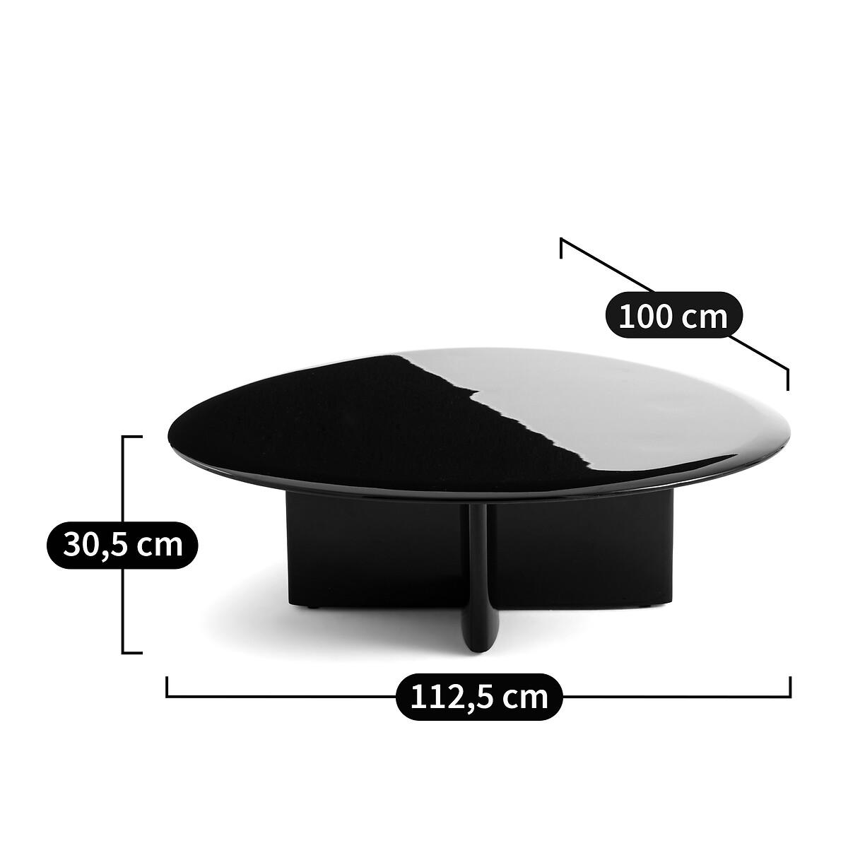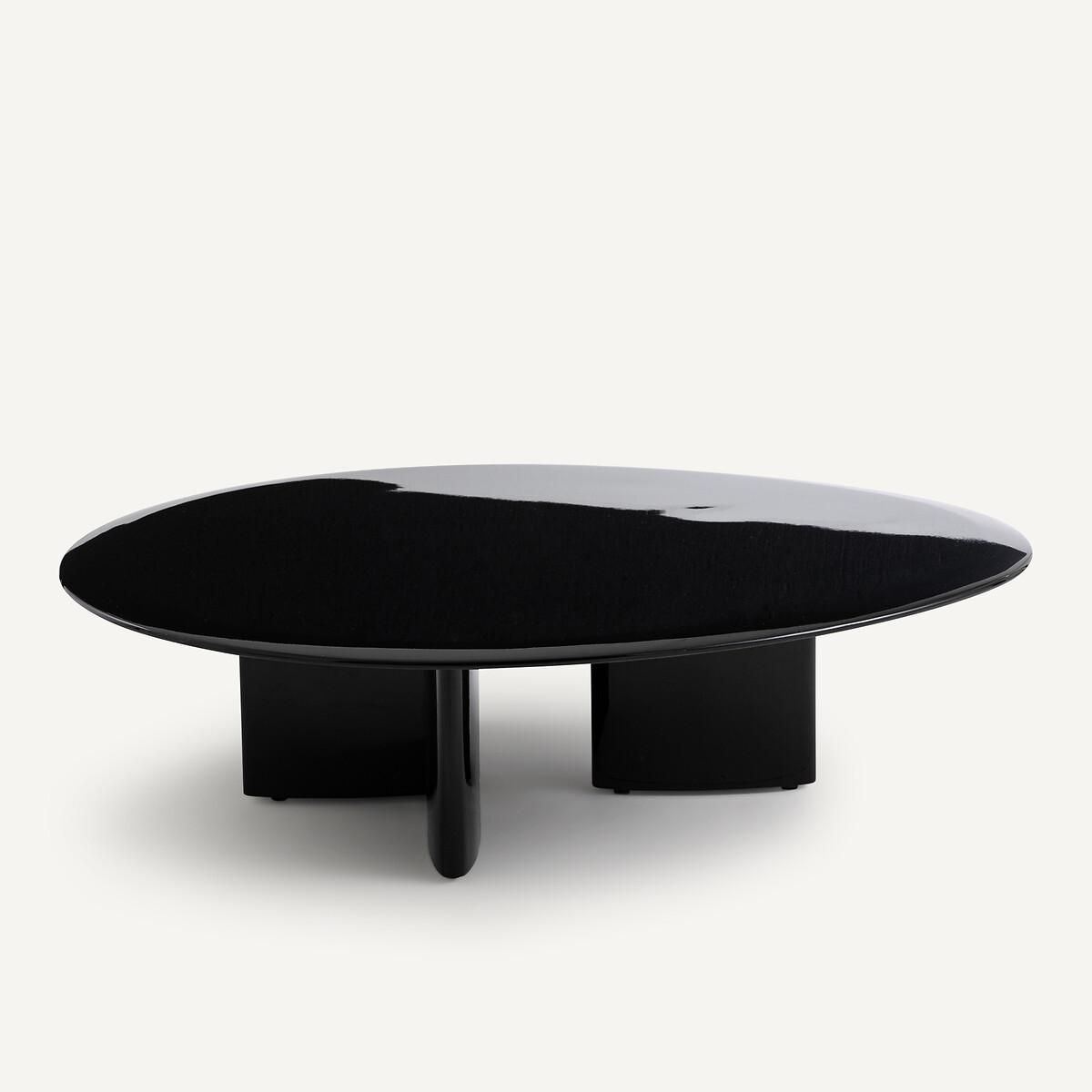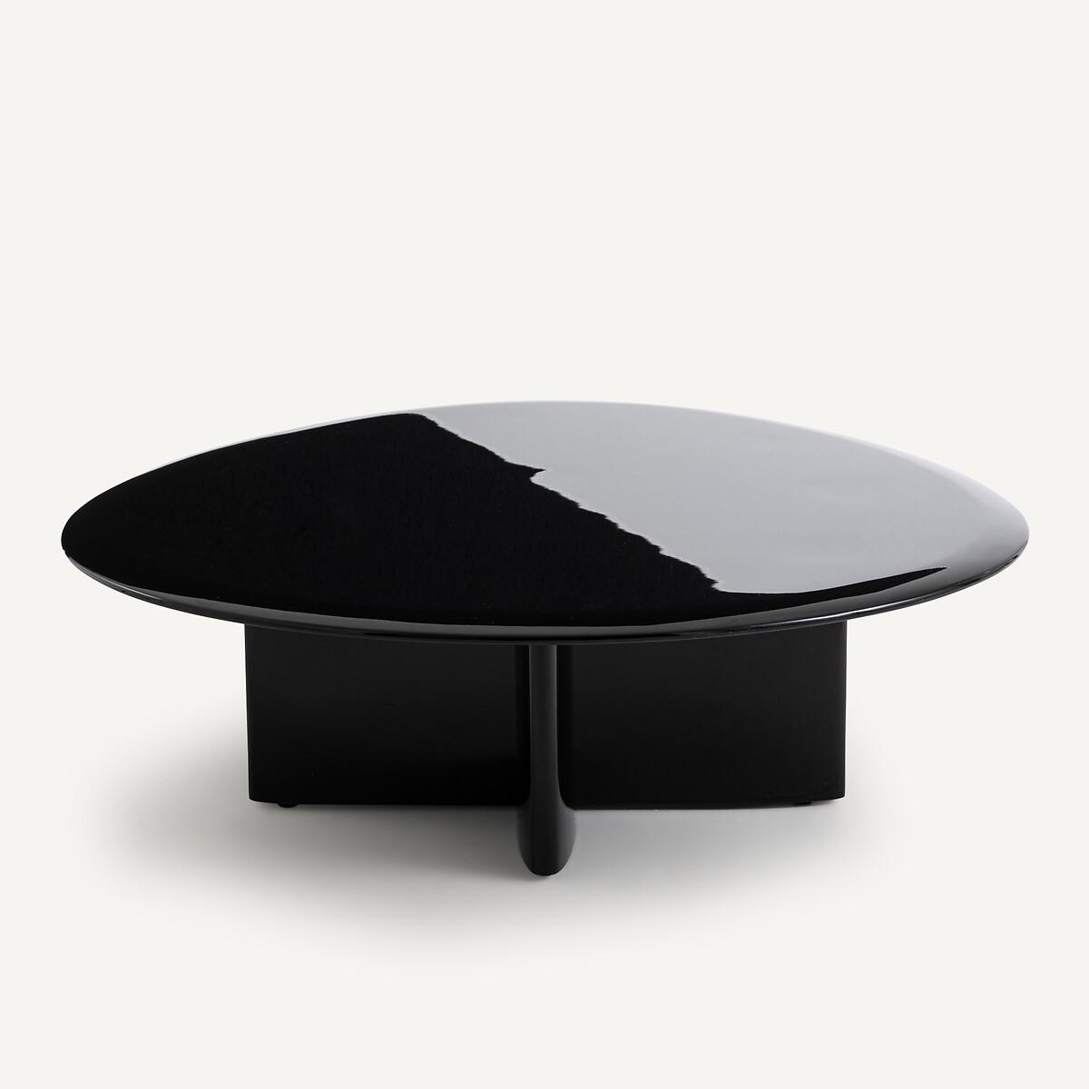Everything about it evokes fluidity. Its rounded lines, the contours of its top, its 3 profiled feet and its lacquered finish vibrates like the surface of flowing water. A soft organic shape offset by an intense black, magnified by the shine of the lacquer. A coffee table that is both simple and sophisticated, with the AMPM signature.. Product Details • Top and legs in painted FSC® MDF • Glossy lacquered polyurethane varnish finish • Organically shaped tabletop • Airplane wing edge finish. Quality Info • Lacquer is a refined finish that enhances a piece of furniture. Its smooth and shiny finish reflects the light. A very special effect that catches the eye in a room. Based on polyurethane varnish, the lacquered surface is sensitive to scratches, humidity and heat. • To preserve their beauty, keep your lacquered furniture away from any heat source or a window exposed to the sun. Care Advice • Clean with a cloth dampened with a mild detergent.. Finish by wiping with a dry cloth. • Wipe up any spills immediately with a soft cloth. • Ban scratching sponges. • Do not place vases, plants or hot objects directly on the surface.. • We recommend the use of coasters and placemats. Dimensions • Width: 112.5cm • Height: 30.5cm • Depth: 100cm • Sold with feet to be attached. • WOOD FROM SUSTAINABLY MANAGED FORESTS. FSC® certified wood comes from forests that are environmentally, socially and economically well managed. Dimensions and weight of parcel • 2 parcels • L77 x H26 x D40cm, 17.5kg • L124 x H9 x D110cm, 18kg