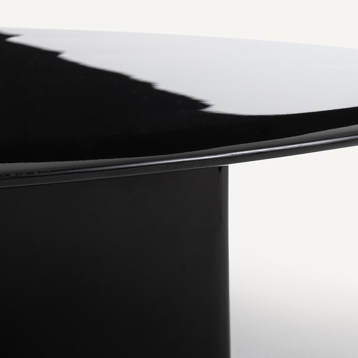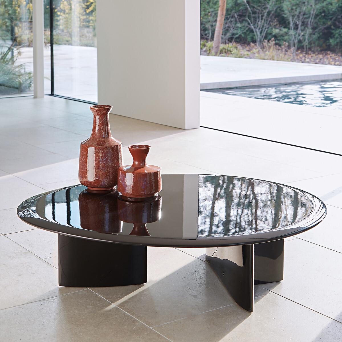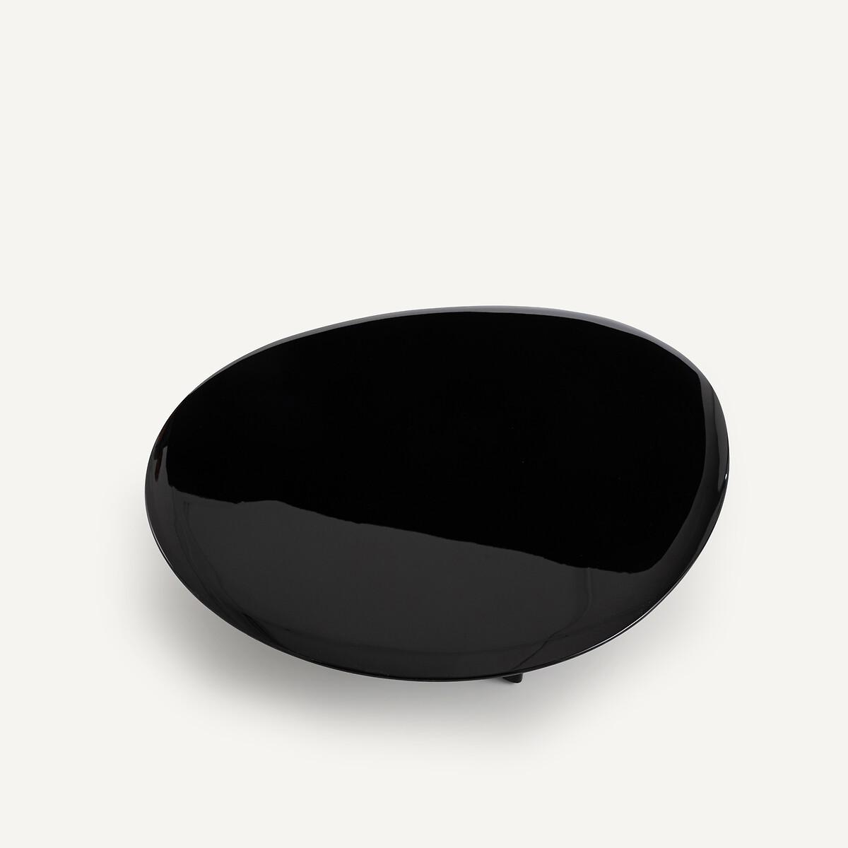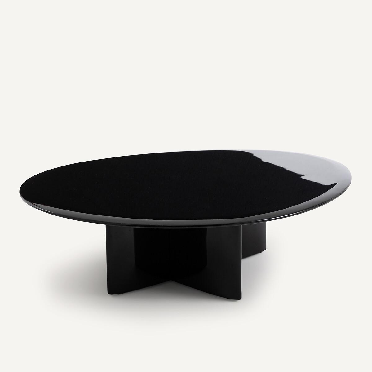 Everything about it evokes fluidity. Its rounded lines, the contours of its top, its 3 profiled feet and its lacquered finish vibrates like the surface of flowing water. A soft organic shape offset by an intense black, magnified by the shine of the lacquer. A coffee table that is both simple and sophisticated, with the AMPM signature.. Product Details • Top and legs in painted FSC® MDF • Glossy lacquered polyurethane varnish finish • Organically shaped tabletop • Airplane wing edge finish. Quality Info • Lacquer is a refined finish that enhances a piece of furniture. Its smooth and shiny finish reflects the light. A very special effect that catches the eye in a room. Based on polyurethane varnish, the lacquered surface is sensitive to scratches, humidity and heat. • To preserve their beauty, keep your lacquered furniture away from any heat source or a window exposed to the sun. Care Advice • Clean with a cloth dampened with a mild detergent.. Finish by wiping with a dry cloth. • Wipe up any spills immediately with a soft cloth. • Ban scratching sponges. • Do not place vases, plants or hot objects directly on the surface.. • We recommend the use of coasters and placemats. Dimensions • Width: 112.5cm • Height: 30.5cm • Depth: 100cm • Sold with feet to be attached. • WOOD FROM SUSTAINABLY MANAGED FORESTS. FSC® certified wood comes from forests that are environmentally, socially and economically well managed. Dimensions and weight of parcel • 2 parcels • L77 x H26 x D40cm, 17.5kg • L124 x H9 x D110cm, 18kg