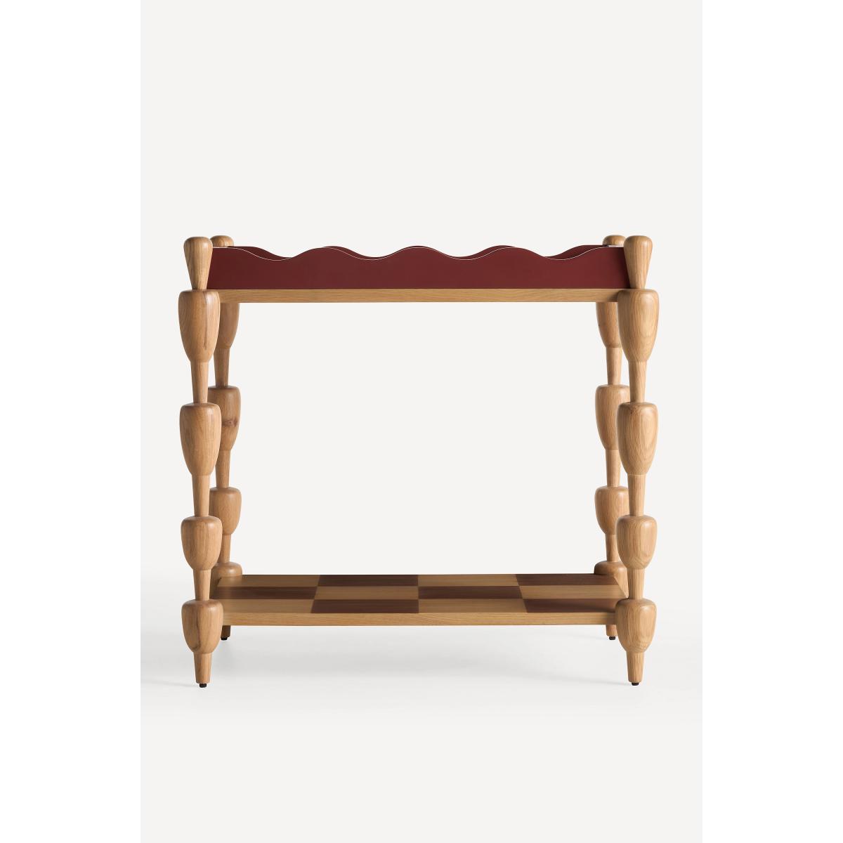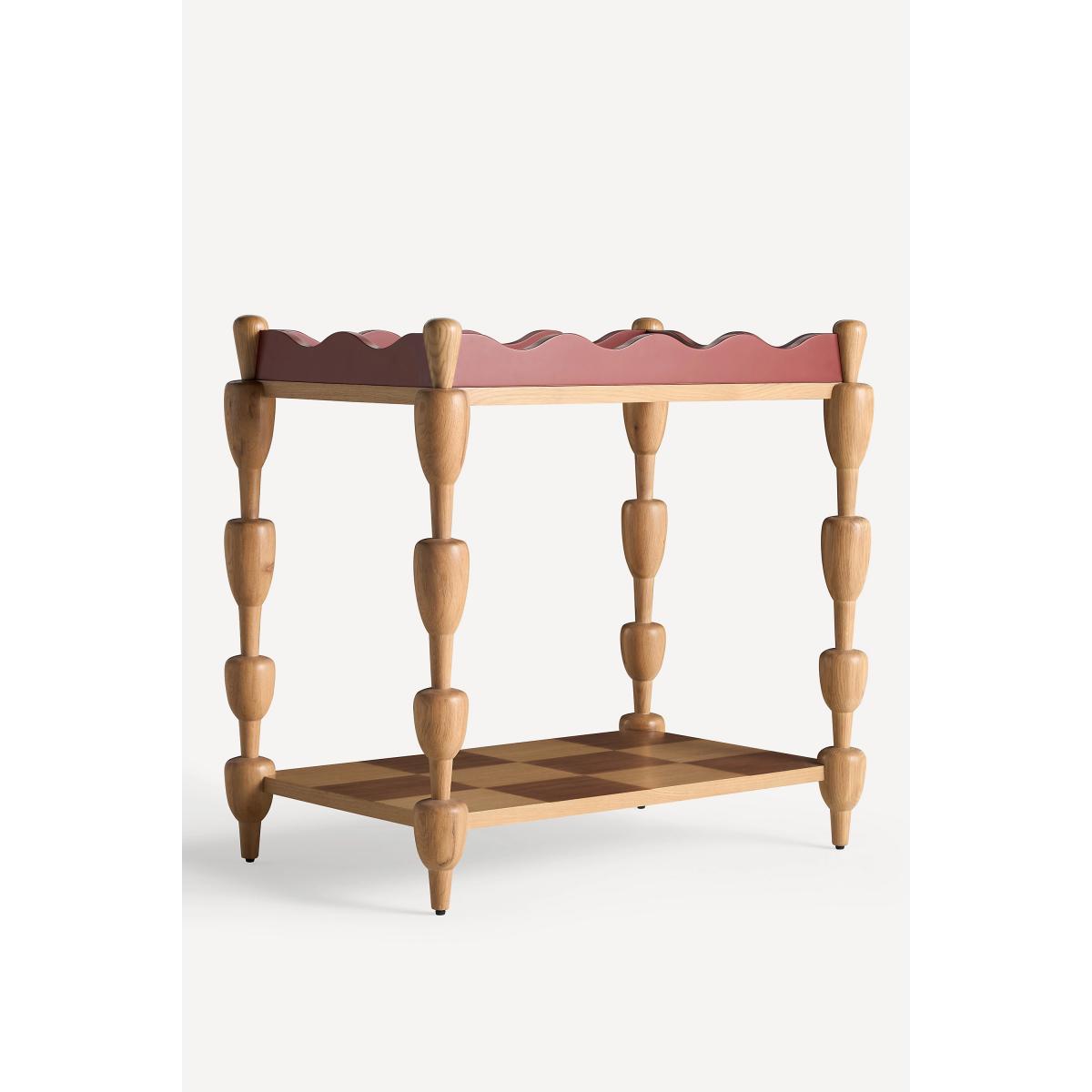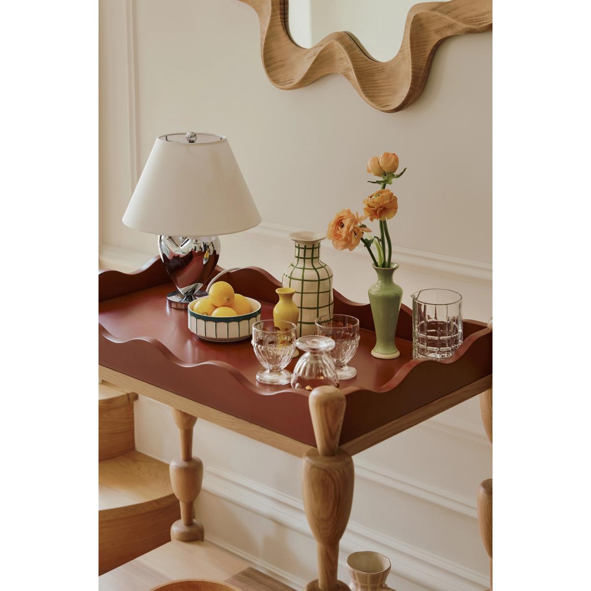 This bar cart places a modern twist on classic craftsmanship with its bold and artistic silhouette. Featuring turned wood legs with cylindrical structures, a checkered shelf, and a scalloped tray, it adds playful sophistication to your home bar. * Oak wood bar cart reinforced with engineered hardwood and an oak veneer finish * Includes one shelf * Wipe clean with soft cloth. Avoid using chemical cleaners * No assembly required * Imported