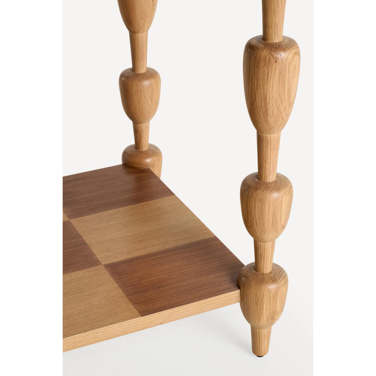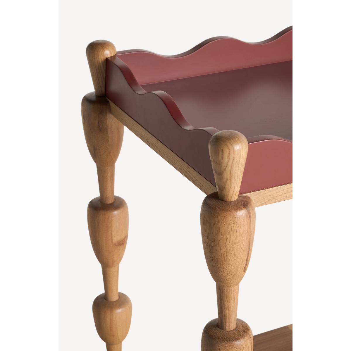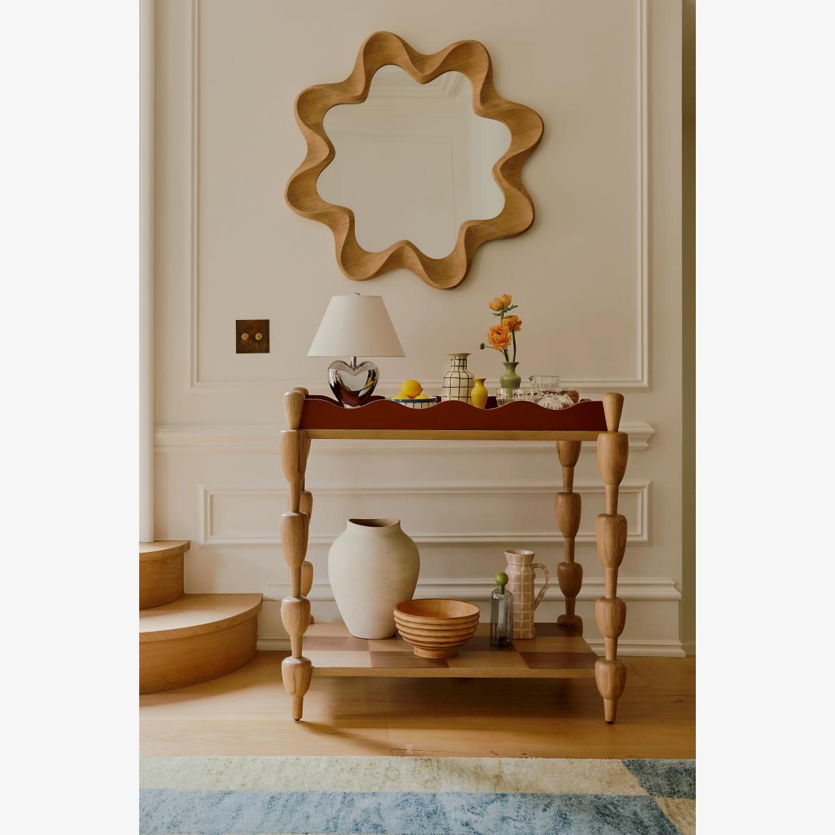 This bar cart places a modern twist on classic craftsmanship with its bold and artistic silhouette. Featuring turned wood legs with cylindrical structures, a checkered shelf, and a scalloped tray, it adds playful sophistication to your home bar. * Oak wood bar cart reinforced with engineered hardwood and an oak veneer finish * Includes one shelf * Wipe clean with soft cloth. Avoid using chemical cleaners * No assembly required * Imported