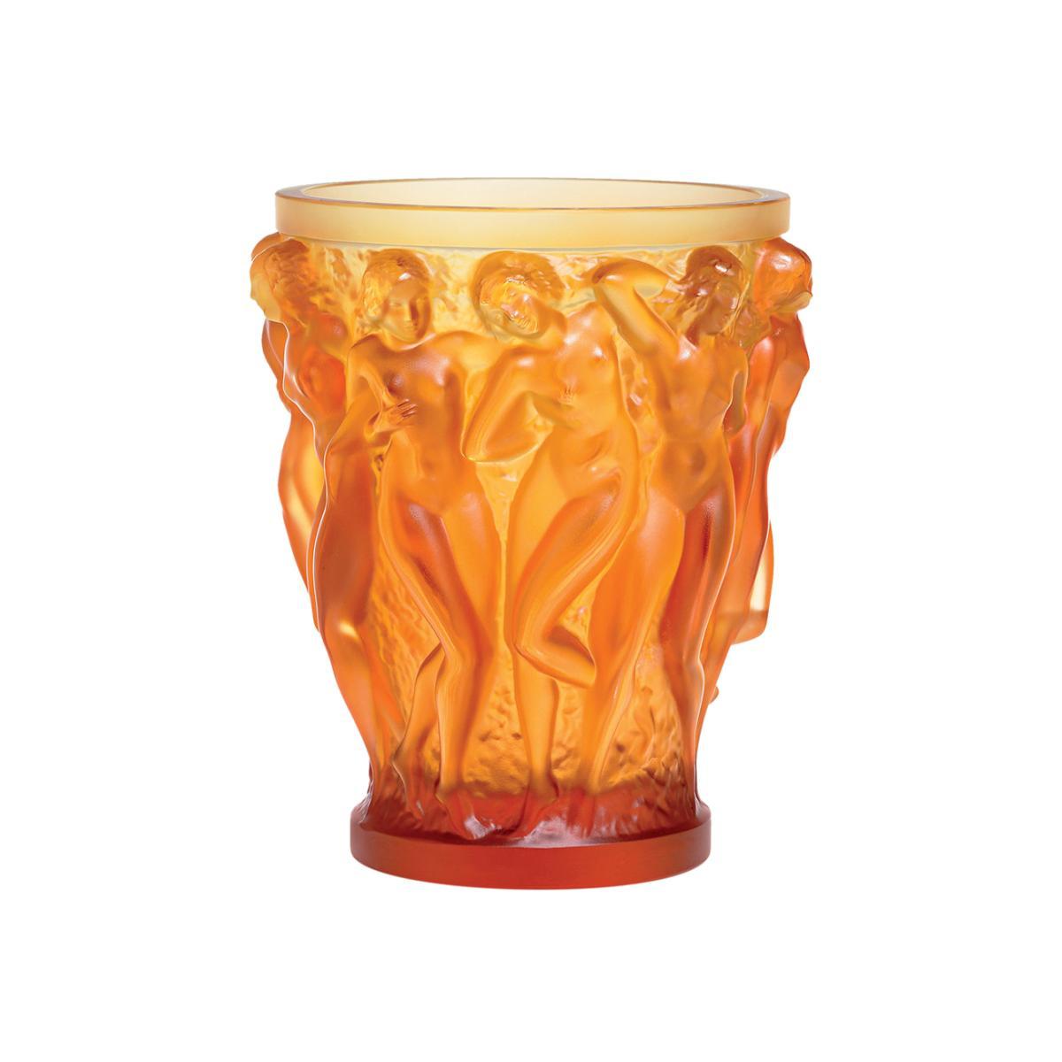 Add timeless luxury to your home with this Bacchantes Amber crystal vase from Lalique. Meticulously crafted in Alsace, France, every step is crafted by hand from the initial gathering of the crystal to the final sculpting, all completed by the very best artisans. It features beautiful figurine detailing around the outside, making it a real statement piece for any space. Presented in a grey Lalique gift box this crystal vase will make a timeless gift idea for any special occasion. There are many more Lalique crystalware designs available, each one ideal for adding a touch of luxury to any home.