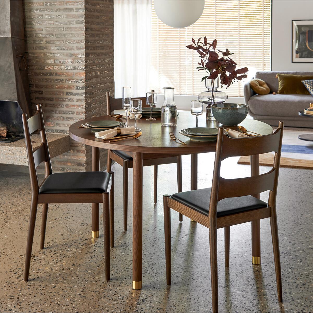 This round walnut veneer table offers a sleek, contemporary look with a timeless appeal, making it versatile for various interior styles. I love how the rich walnut finish adds warmth and character, pairing well with both modern minimalism and mid-century decor. It’s ideal for compact dining spaces or kitchens, seating four comfortably while maintaining a clean, uncluttered aesthetic. To style it effectively, consider adding a simple centrepiece like a vase or candles, and balance the look with understated chairs in neutral or textured fabrics. The earthy tone also works beautifully with soft pastel shades or darker, moody palettes, making it adaptable to different colour schemes.