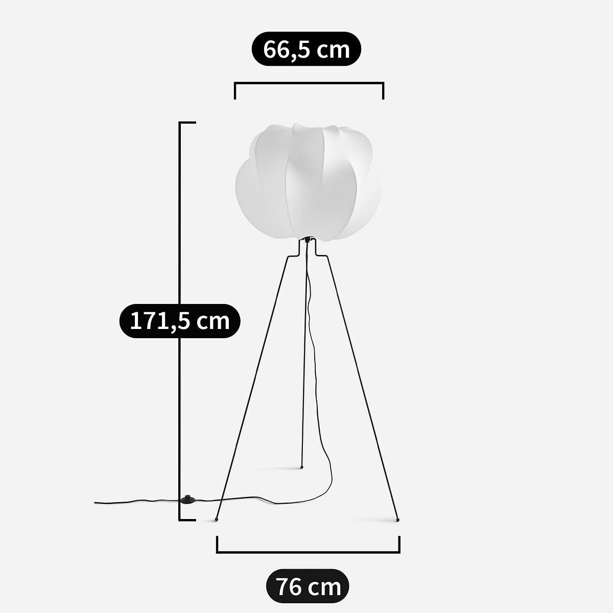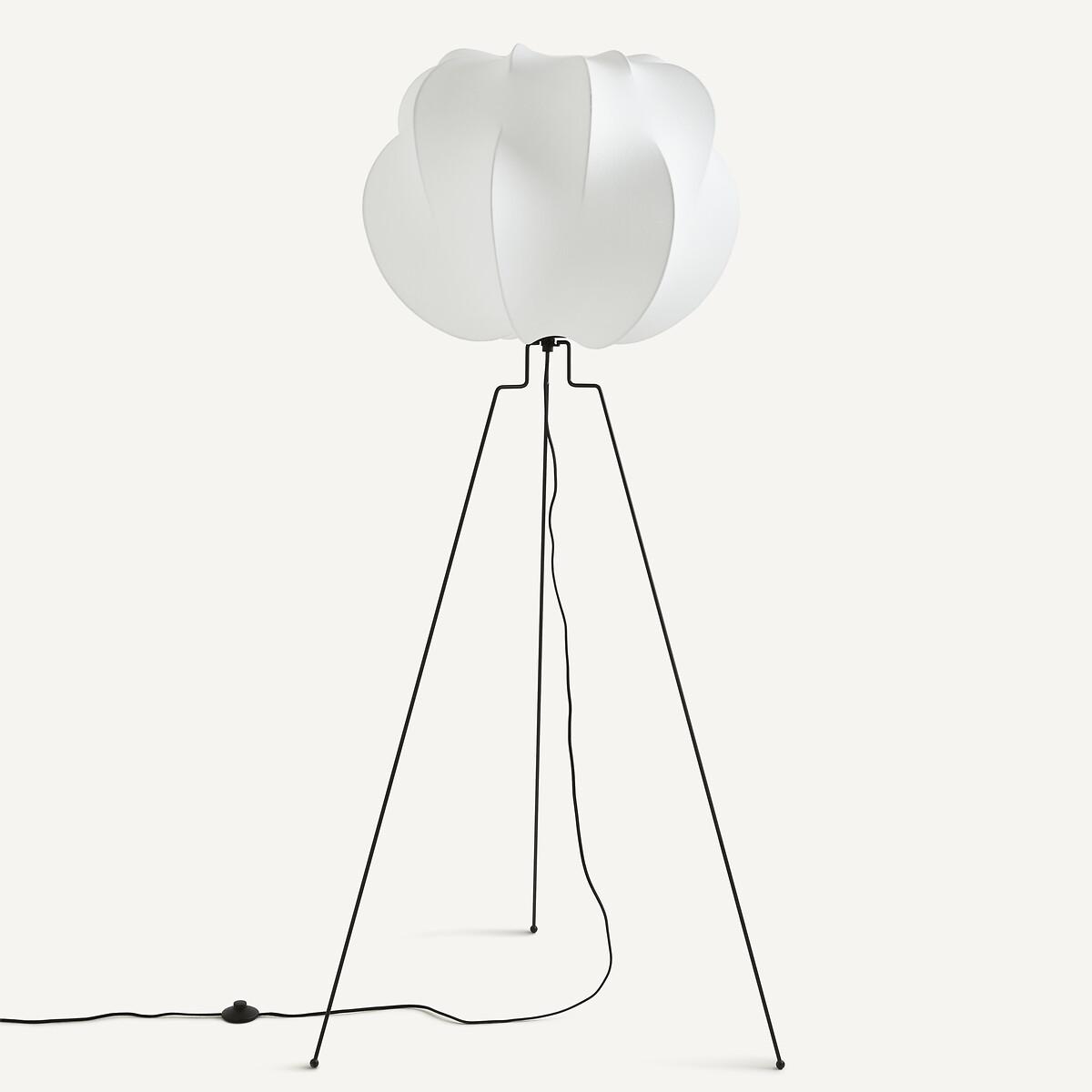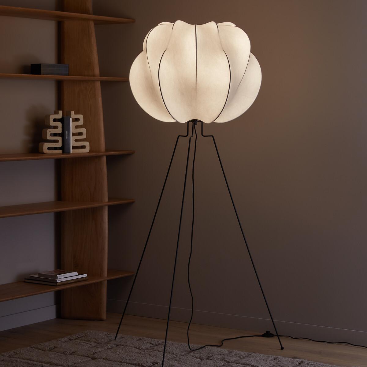 Poetic, graphic, artistic. Its clean, soft lines give it a distinctly contemporary feel. Its resin material, delicately sprayed onto a metal structure, creates a chrysalis effect. To create a warm, captivating, diffused light. A Lamp by AMPM.Product Details • Lampshade in sprayed polymer resin • 3 black epoxy-finish iron legs • Textile sheathed electric cable • Supports E27 bulb (not supplied) • For bulb (not included): LED 4W max. Dimensions • Overall diameter : 76cm • Total Height: 171.5 cm • Lampshade:Ø66.5 x H48cm • Base: Ø76 x H123.5cm • Weight: 4.2kg • This product requires assembly. Dimensions and weight of parcel:2 parcels • W16 x H140 x D16cm. Weight 2.6kg • W73 x H53 x D73cm. 4.2kg
