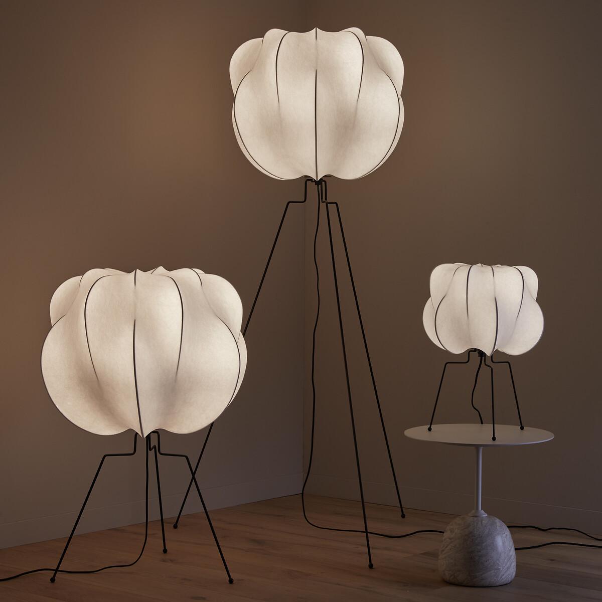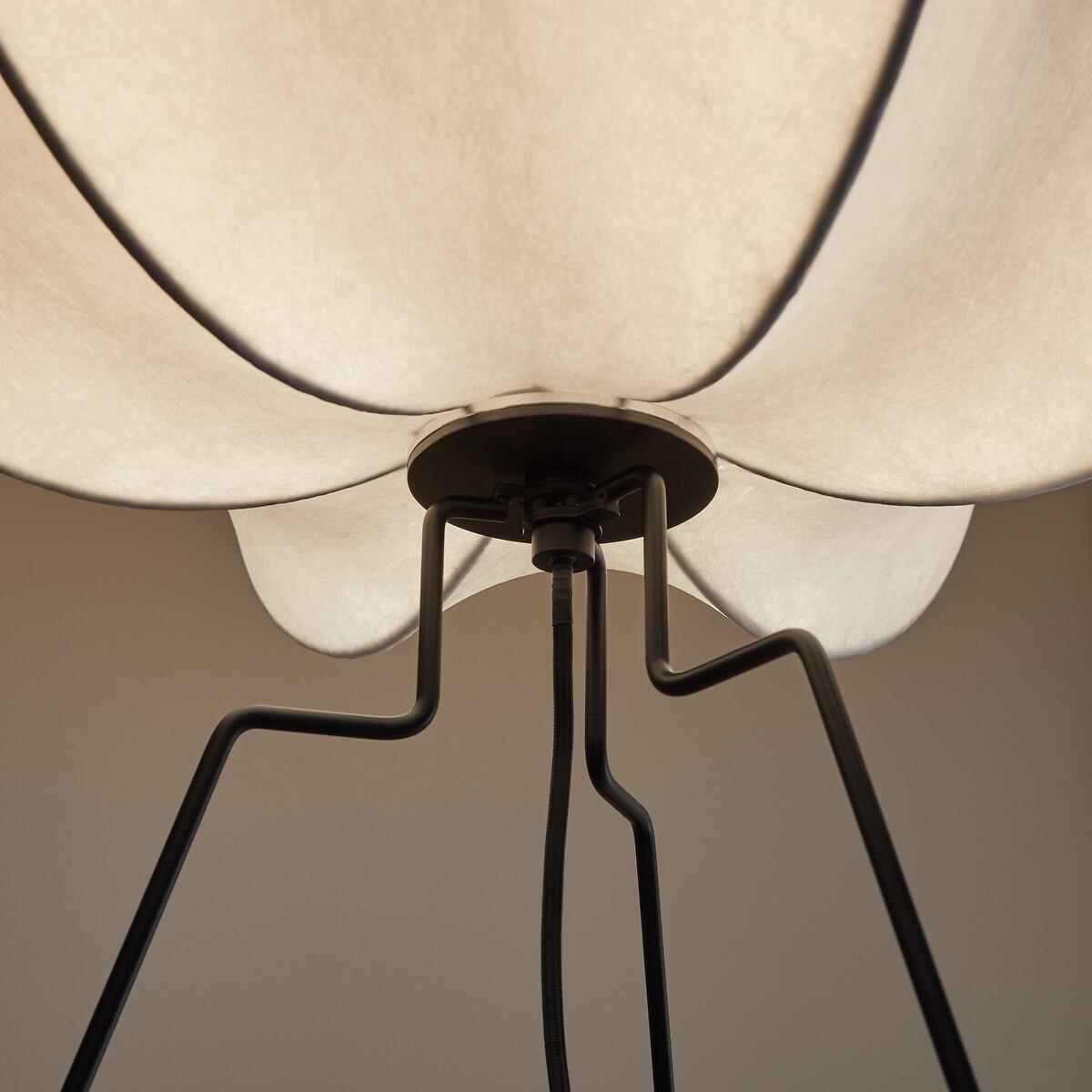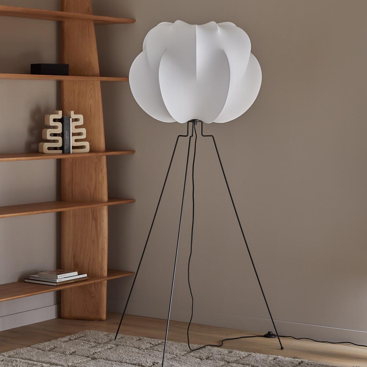 Poetic, graphic, artistic. Its clean, soft lines give it a distinctly contemporary feel. Its resin material, delicately sprayed onto a metal structure, creates a chrysalis effect. To create a warm, captivating, diffused light. A Lamp by AMPM.Product Details • Lampshade in sprayed polymer resin • 3 black epoxy-finish iron legs • Textile sheathed electric cable • Supports E27 bulb (not supplied) • For bulb (not included): LED 4W max. Dimensions • Overall diameter : 76cm • Total Height: 171.5 cm • Lampshade:Ø66.5 x H48cm • Base: Ø76 x H123.5cm • Weight: 4.2kg • This product requires assembly. Dimensions and weight of parcel:2 parcels • W16 x H140 x D16cm. Weight 2.6kg • W73 x H53 x D73cm. 4.2kg