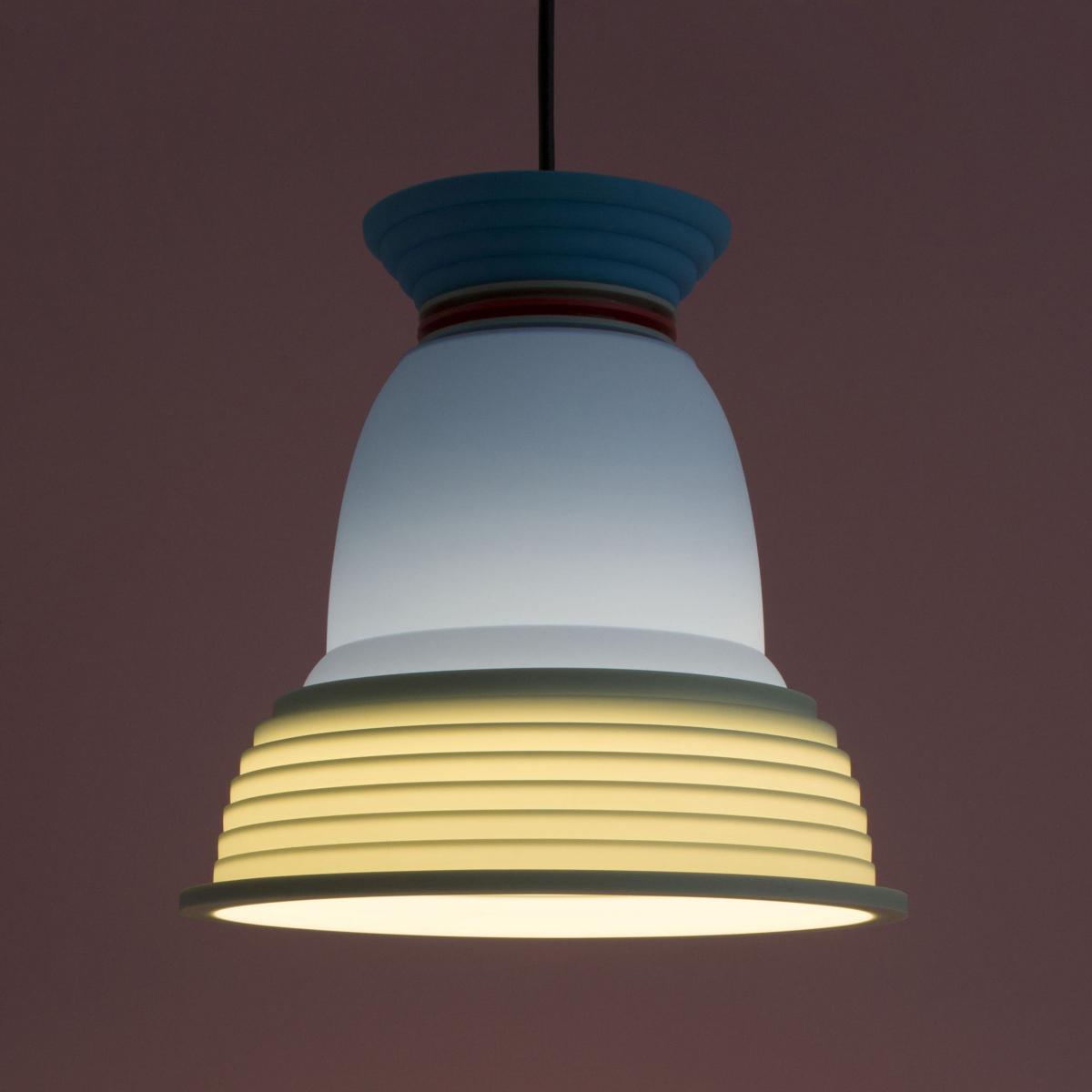 PLEASE NOTE. Lampshade sold on its own, without electrical system. The Shades lampshade is compatible with any socket with an E27 base. A compatible electrical system is sold separately (cable / ceiling fitting / socket set). Renowned co-founder of the Memphis movement, British designer George Sowden has continued his creative journey with his lighting series, "Shades". These modular, silicon lamps bear the geometric, colourful and bold style of their renowned creator. The Shades lamps are composed of colourful silicon lampshades with infinite combination possibilities. The simple geometric shapes are layered in a thousand and one ways, creating totem-like silhouettes. The rich, chromatic combinations highlight the play on layered volumes. The Shades lamps allow for countless configuration possibilities thanks to the modularity of their silicon components. The initial idea behind Shades came about in 2020, when George Sowden discovered the extraordinary potential of silicon, which optimally propagates light in a marvellously expressive way. Once the light is switched on, the material plays on transparency and colour, showcasing the textures of its surface and creating a stunning effect of depth. The colours light up, diffusing a vibrant yet soft and comfortable light. Plus, silicon is a non-toxic material, as well as being easy to clean, shock-resistant and known for retaining its aesthetic qualities over time. George Sowden: "Silicon sets Shades lamps apart even before they've been switched on, the colours and proportions are remodelled over use, diffusing a soft and comforting light."