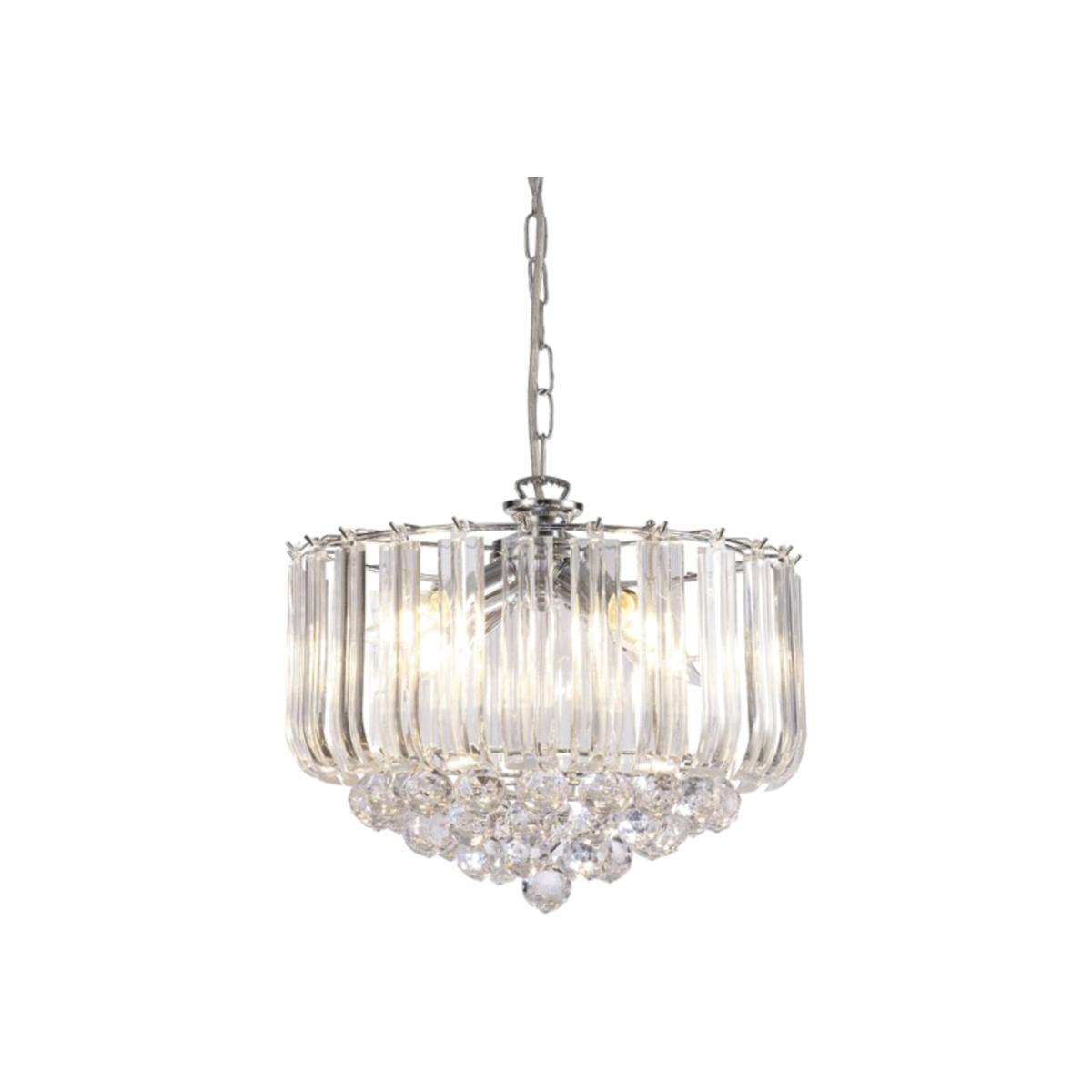 This collection combines contrasting acrylic shapes to create an eye catching, affordable, modern chandelier. The classic polished chrome ceiling cup and chain suspend the E14 lampholders. The lampholders are surrounded by curved lengths of clear acrylic pieces providing a border around the light. The bottom of the fitting, beneath the lampholders, is then adorned with clear buttons which hang clear facetted spheres. Available in two sizes as a 3 or 5 light, this is stunning modern chandelier.