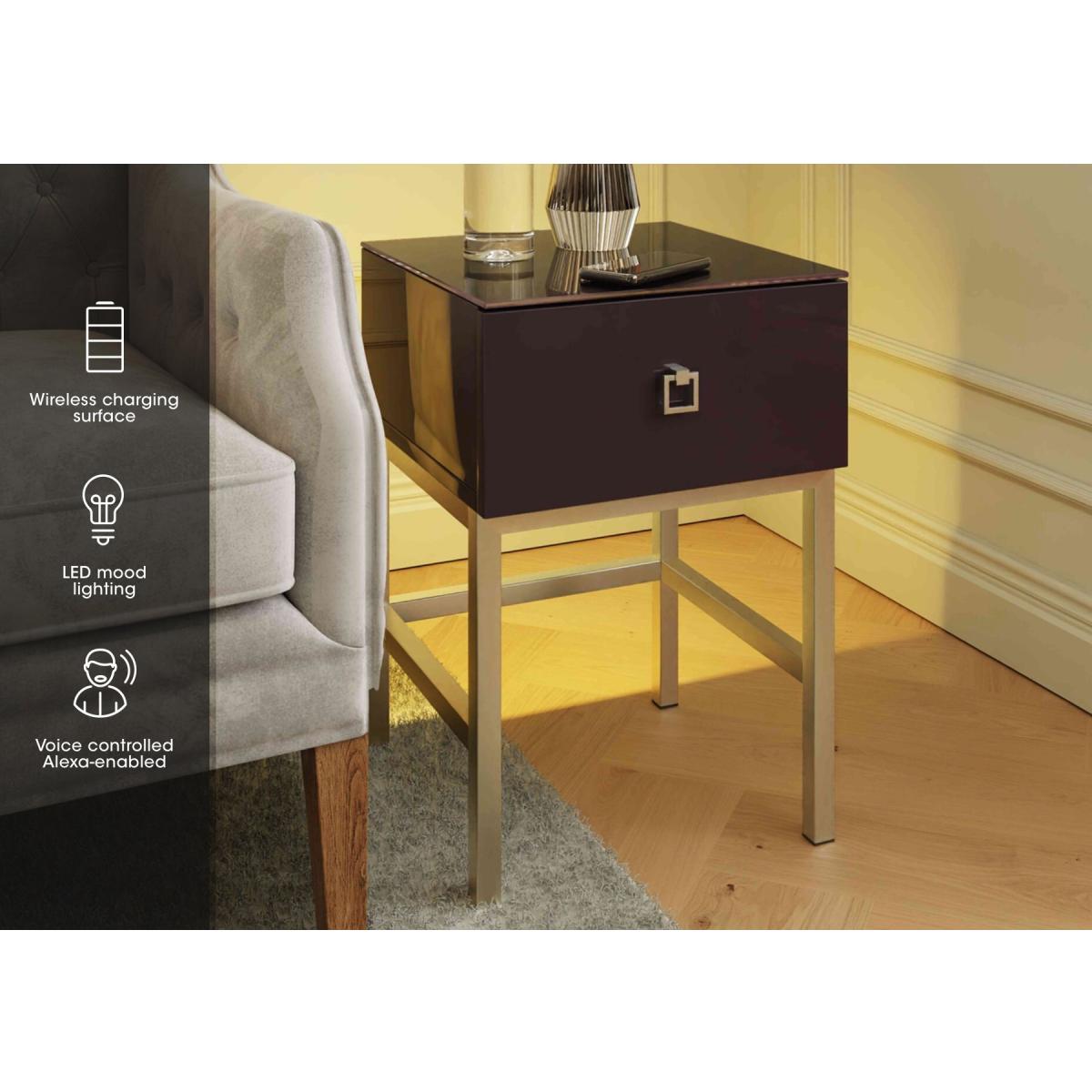 Glossy and glamorous, the living room furniture in our Lana collection is as functional as it is fabulous. Designed for modern living and offering a range of integrated SMART features like app- and smart speaker-operated mood lighting and discreet wireless phone charging, each piece is both high-tech and high-gloss. The essence of carefully considered and tasteful design, Lana pieces have midnight purple interiors, brushed gold-effect legs and handles and plenty of practical storage space. The range includes sideboards, a TV cabinet and occasional tables, and everything is offered in a choice of sophisticated colours. Online only. Perfect in every way, this glam and stylish high-gloss SMART lamp table provides discrete wireless phone charging and built-in app-controlled mood lighting. Why you'll love it High-gloss glam meets high-tech functionality in this lamp table. With a range of integrated SMART features. Built-in mood lighting is controlled via smart speaker or phone app. Discrete wireless phone charging point. In a choice of glossy finishes with colour-matched glass top. Gorgeous midnight purple interior. Drawer handle and legs have a subtle brushed gold-effect finish. Fast and easy click-together self-assembly. A Furniture Village online exclusive. This lamp table is part of the Lana range. What you need to know Simple self-assembly is required for this item. The finish may show small surface scratches, a result of the finishing process. Do not place in direct sunlight. Do not use abrasive cleaning products. Wipe clean with a damp cloth, and dry with a soft duster. We recommend using coasters and placemats at all times. Go all-out glam with matching Lana living room tables, sideboards and TV cabinet.