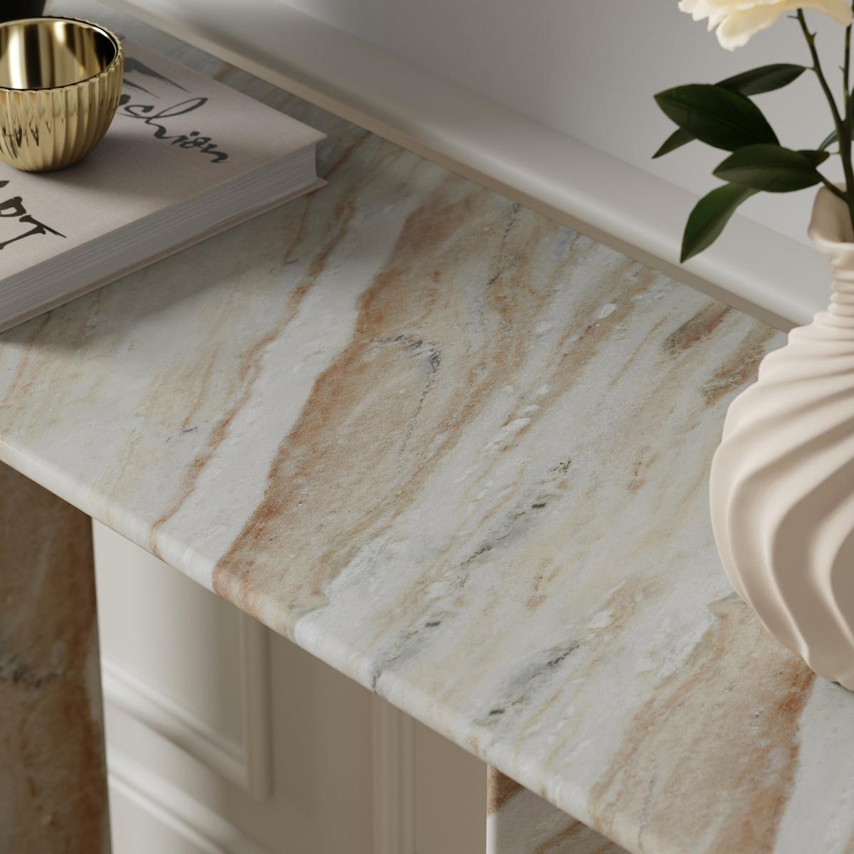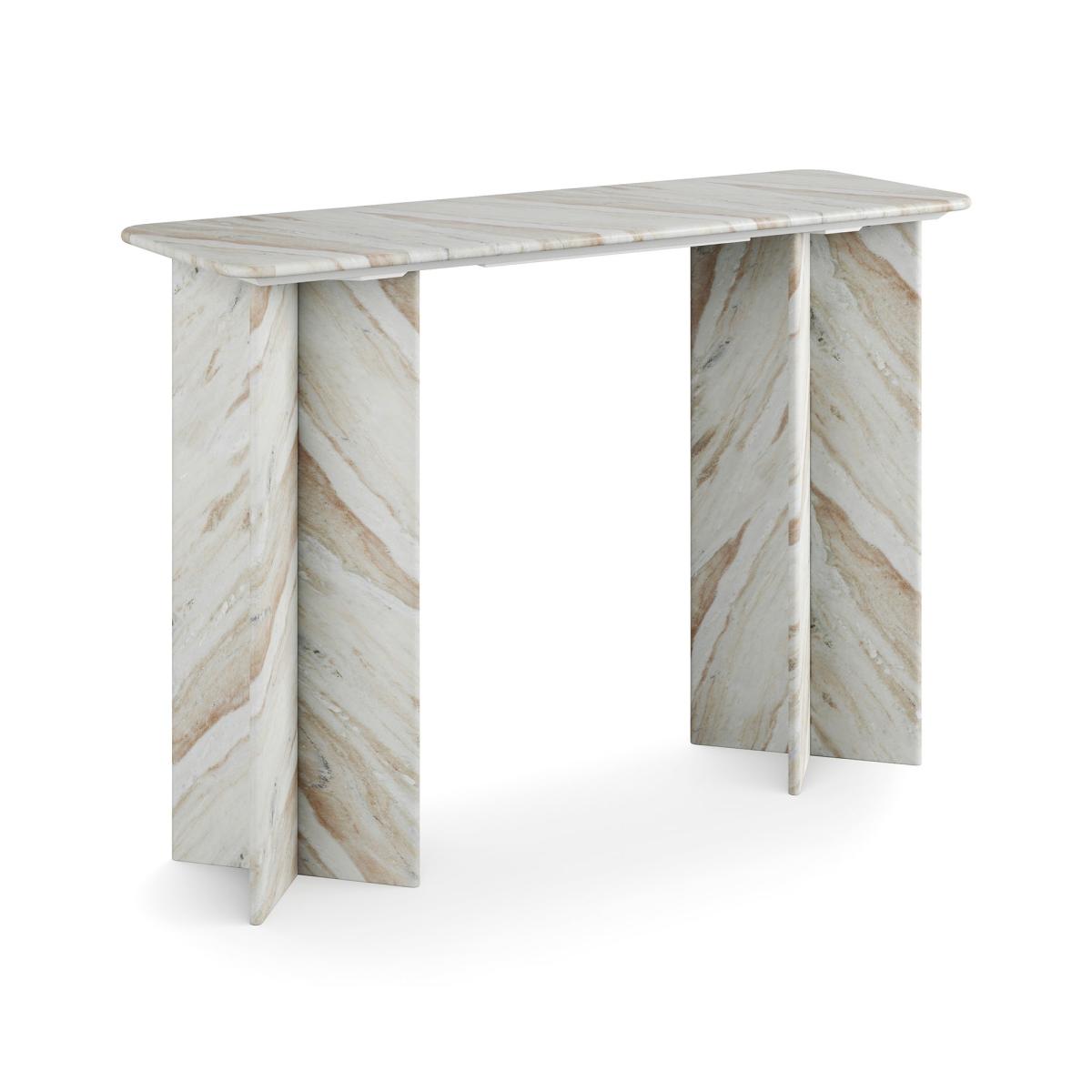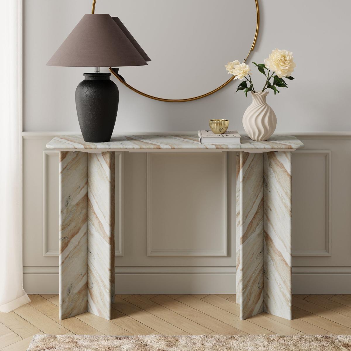 * 100% Marble * Luxe style * Unique finish for each piece This console table brings clean lines and luxurious texture to hallways, living rooms or entryways. Featuring a sleek marble top in soft neutral tones, it rests on a slender metal frame with a minimalist silhouette that keeps the overall look light and modern. The natural stone surface gives each piece a unique character, while the understated design ensures it complements both contemporary and classic spaces. Marble is a natural stone, meaning no two pieces are exactly alike. Variations in colour, veins, and texture add to its charm. To keep it in its best condition, clean with a damp cloth and avoid harsh chemicals. As a porous material, it’s important to wipe spills immediately and use coasters to protect the surface. Avoid cutting directly on the marble, placing excessive weight on it, or exposing it to high heat. With the right care, this timeless piece will remain a stunning feature in your home for years to come.