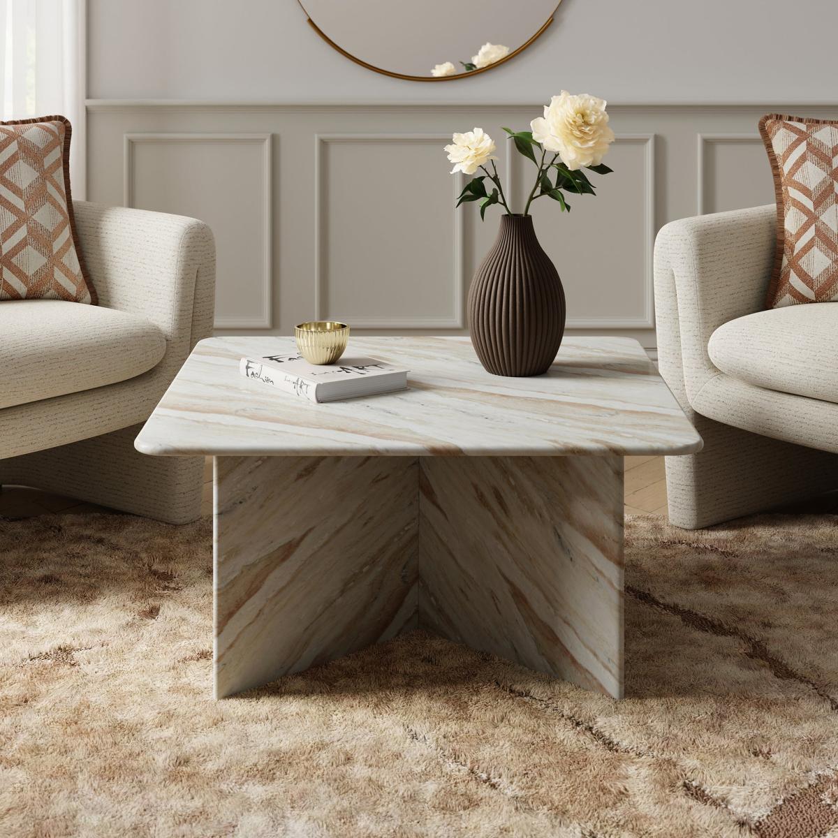 * Real marble * Luxe style * Unique finish A true statement piece, this square coffee table stands out with its bold presence and natural beauty. The genuine marble top boasts unique variations in veining, making each table an exclusive work of art. Its clean lines and modern silhouette balance luxury with functionality, perfect for anchoring a living room with sophistication. Marble is a natural stone, meaning no two pieces are exactly alike. Variations in colour, veins, and texture add to its charm. To keep it in its best condition, clean with a damp cloth and avoid harsh chemicals. As a porous material, it’s important to wipe spills immediately and use coasters to protect the surface. Avoid cutting directly on the marble, placing excessive weight on it, or exposing it to high heat. With the right care, this timeless piece will remain a stunning feature in your home for years to come.