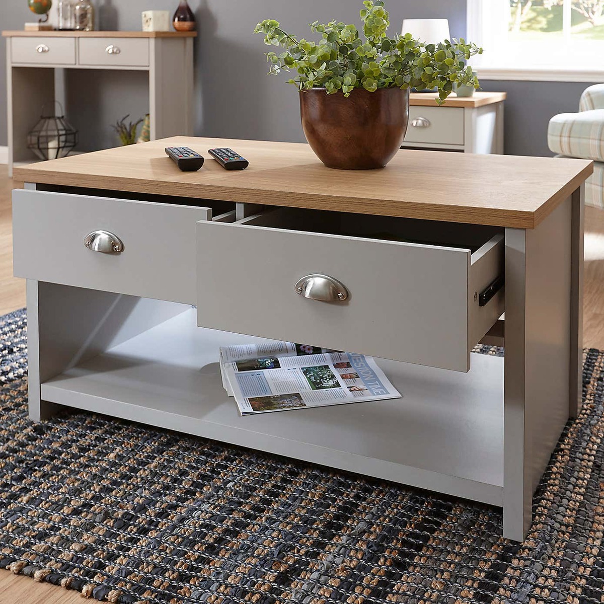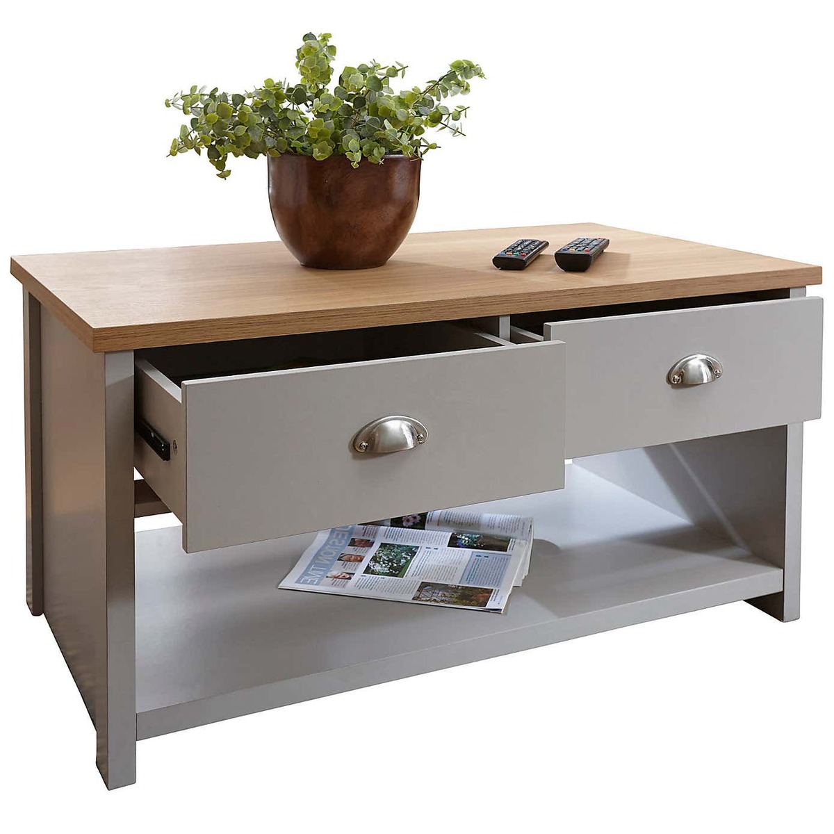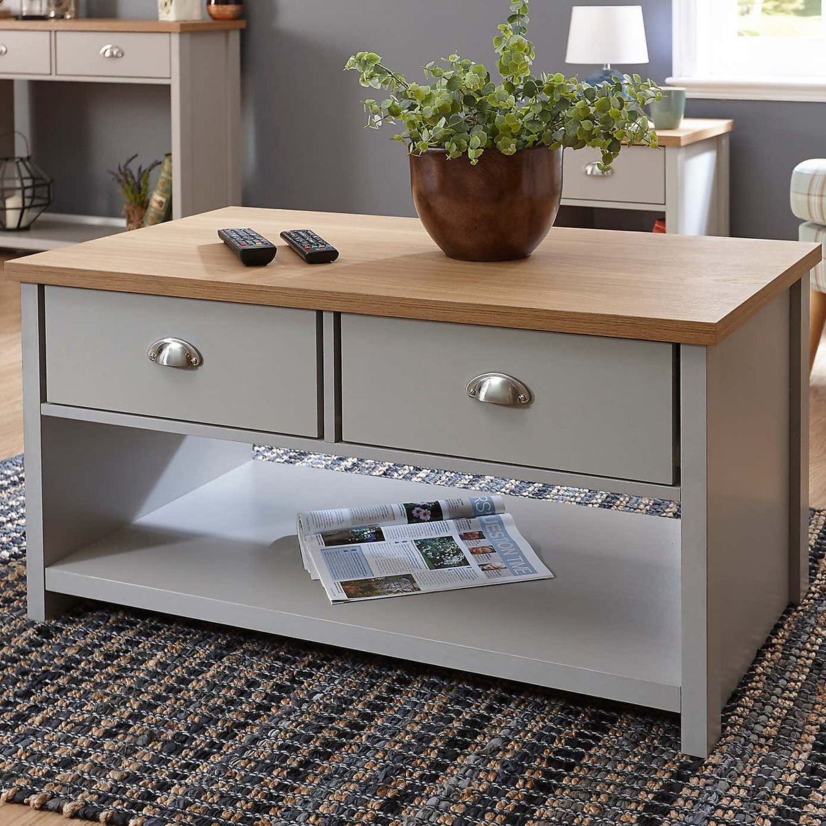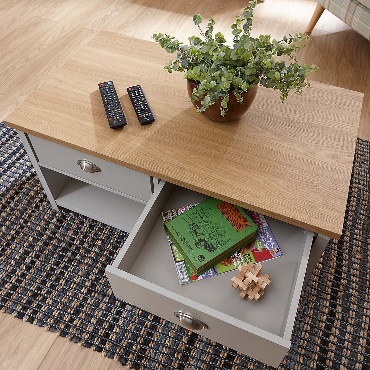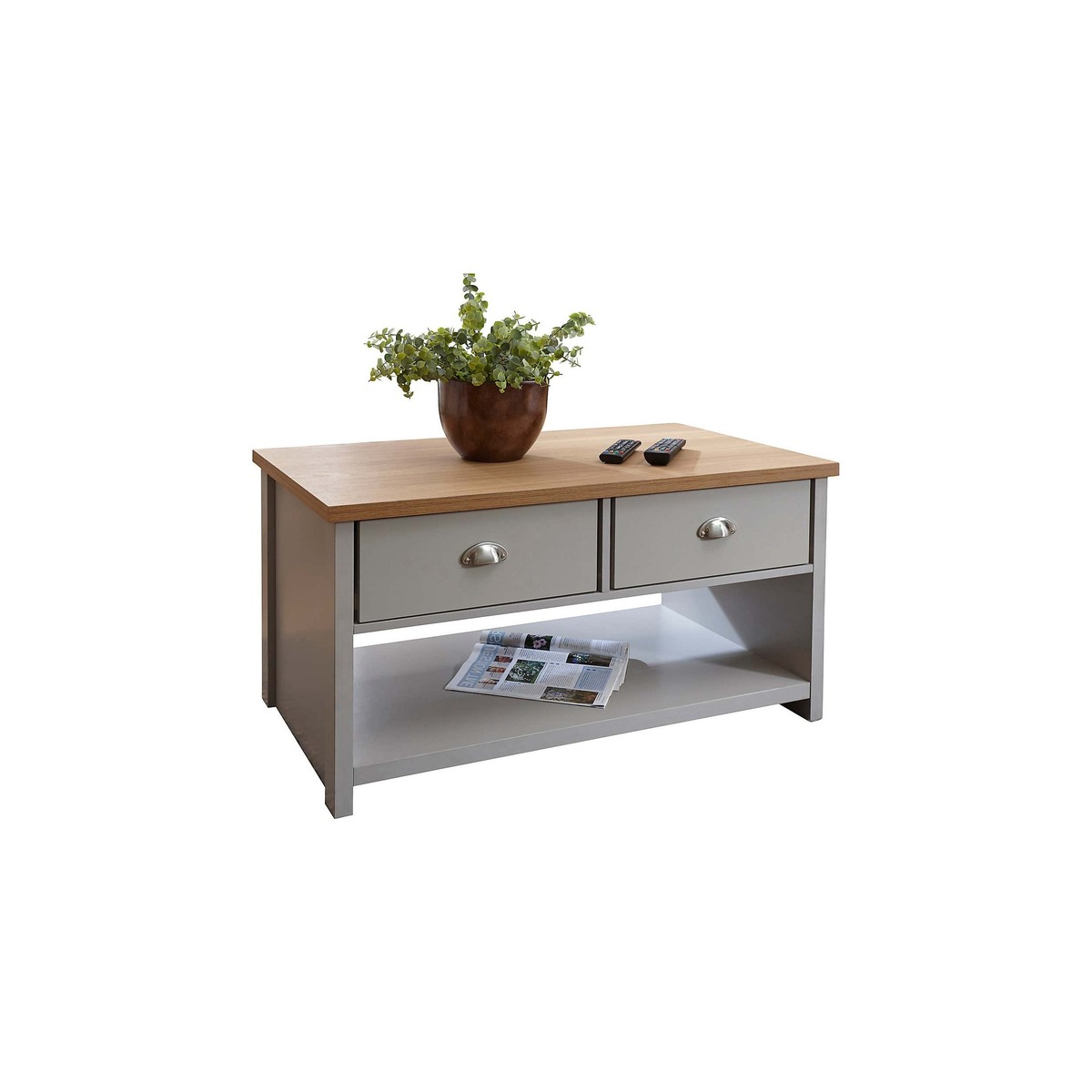 Boasting a practical design, the Lancaster 2 Drawer Coffee Table offers two deep drawers of storage space perfect for organising living room essentials and a lower shelf ideal for books and magazines. The grey painted finish and contrasting top emphasises the contemporary style that will bring a modern elegance to your living room. Please note, unfortunately we cannot deliver this item to the Channel Islands.