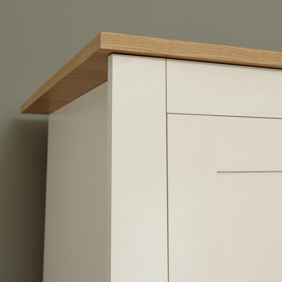 A stylish shaker-inspired wardrobe that's perfect for kitting out a bedroom in first-class style. The sleek lines, soft grey or cream foiled finish with oak tops and brushed steel handles create a sophisticated impression. The wardrobe provides effective storage with a good mix of hanging, drawer and shelf space. Ideal for a room where understated elegance is the goal.