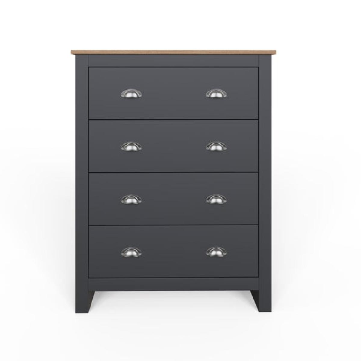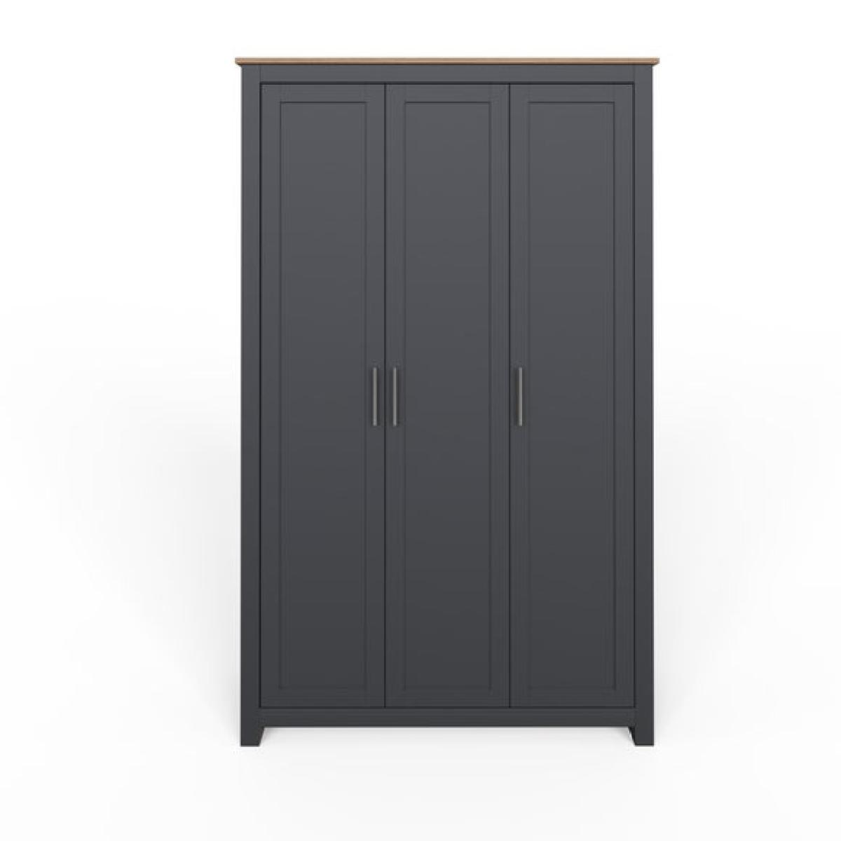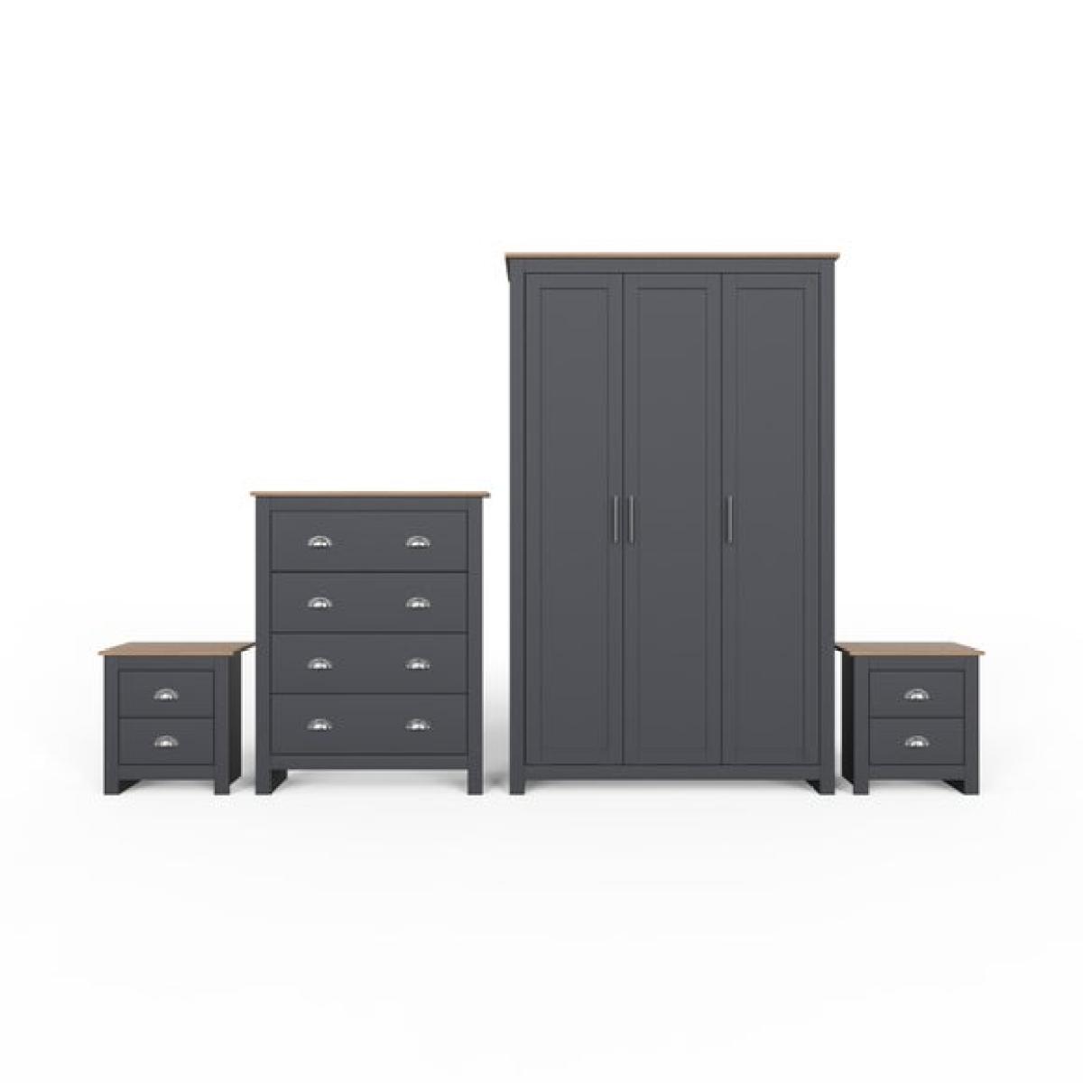 * Four piece set includes wardrobe, chest and two lamp tables * Oak-effect tops for added contrast * Hanging, drawer and surface storage * Brushed steel handles for a modern finish * Available in a range of colours The Lancaster 4 Piece Bedroom Furniture Set is a complete solution for stylish storage. With shaker-inspired detailing and a coordinated finish, it brings a polished look to any bedroom. This set includes a three door wardrobe, four drawer chest and two lamp tables, offering a practical mix of hanging space, drawer storage and surface area. Brushed steel handles and oak-effect tops add a refined touch to the clean lines. Designed to suit a range of interiors, it’s available in multiple colour options. A smart way to keep everything in its place.