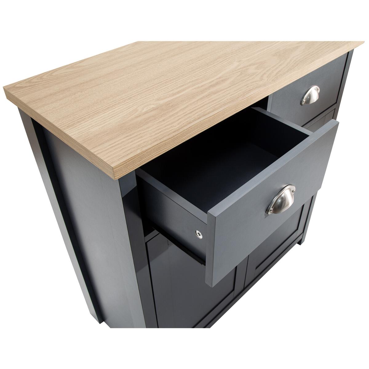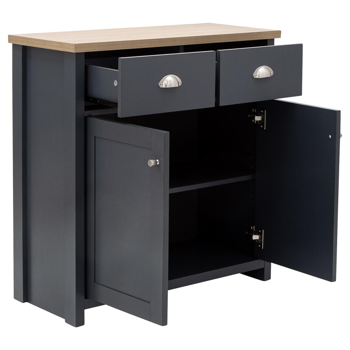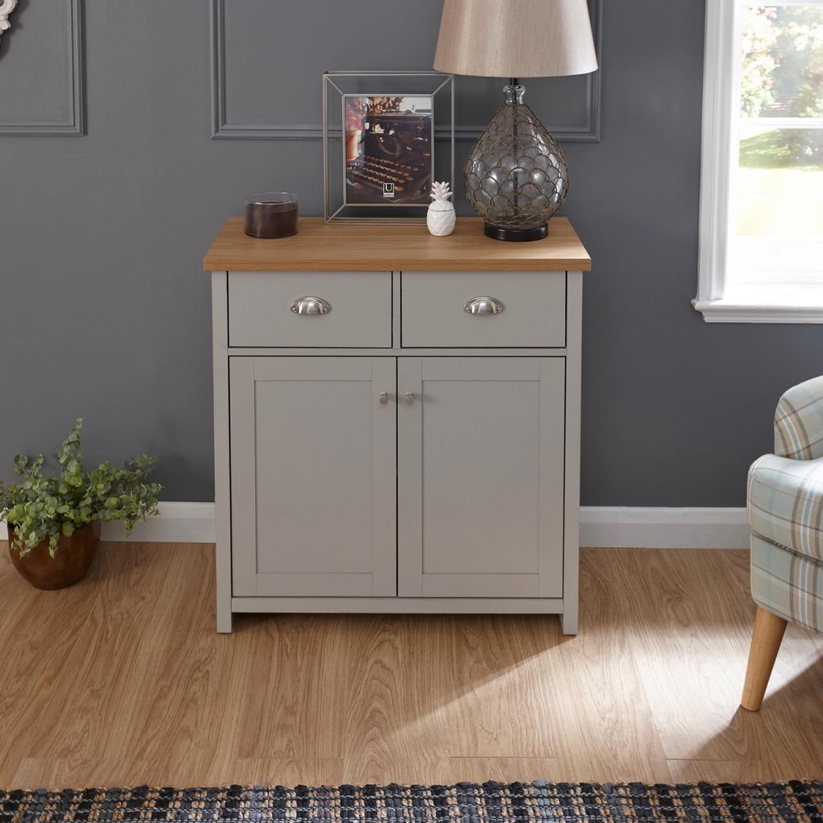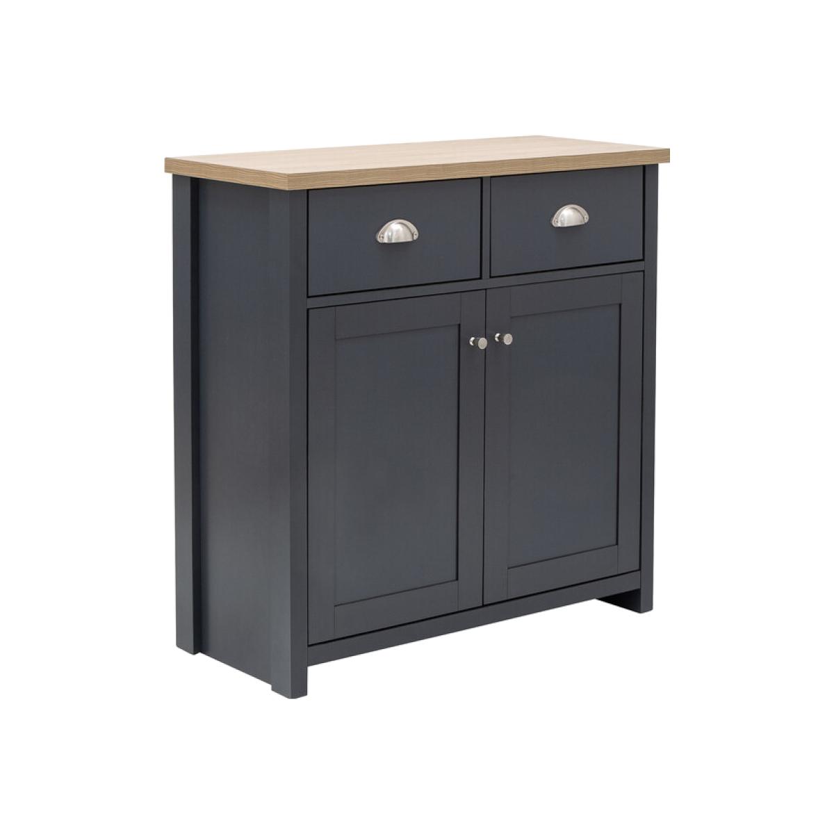 An elegant storage solution for the living or dining room, this Lancaster Compact Sideboard is a great way to keep your home looking neat and tidy. Featuring a beautiful matte grey finish and oak veneered top, this sideboard is designed with two handy drawers and a spacious double door cupboard underneath, great for storing all of your most beloved items.