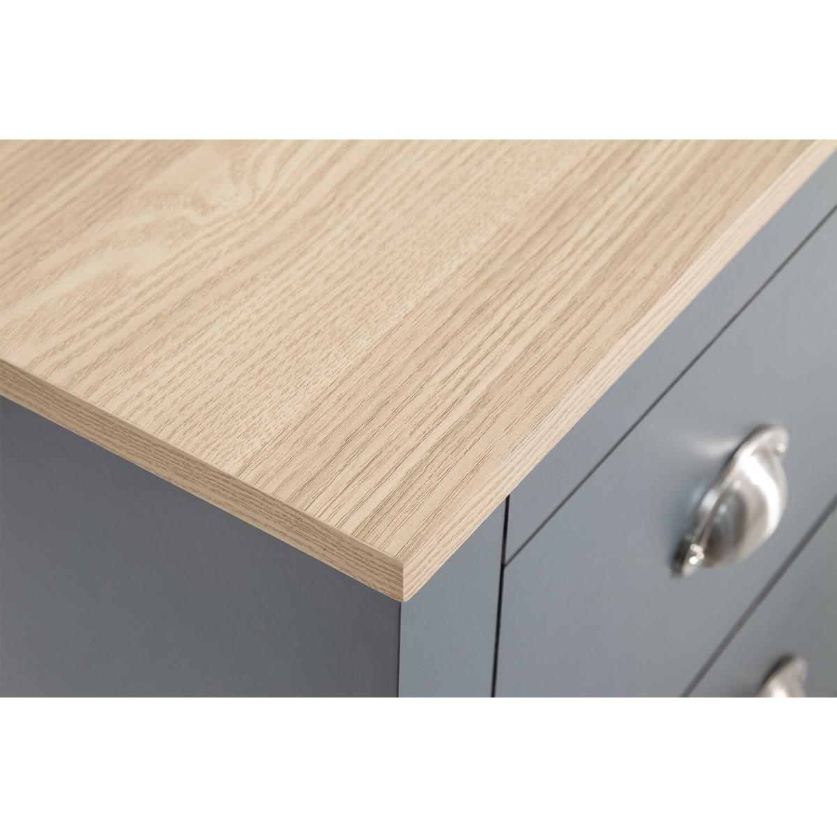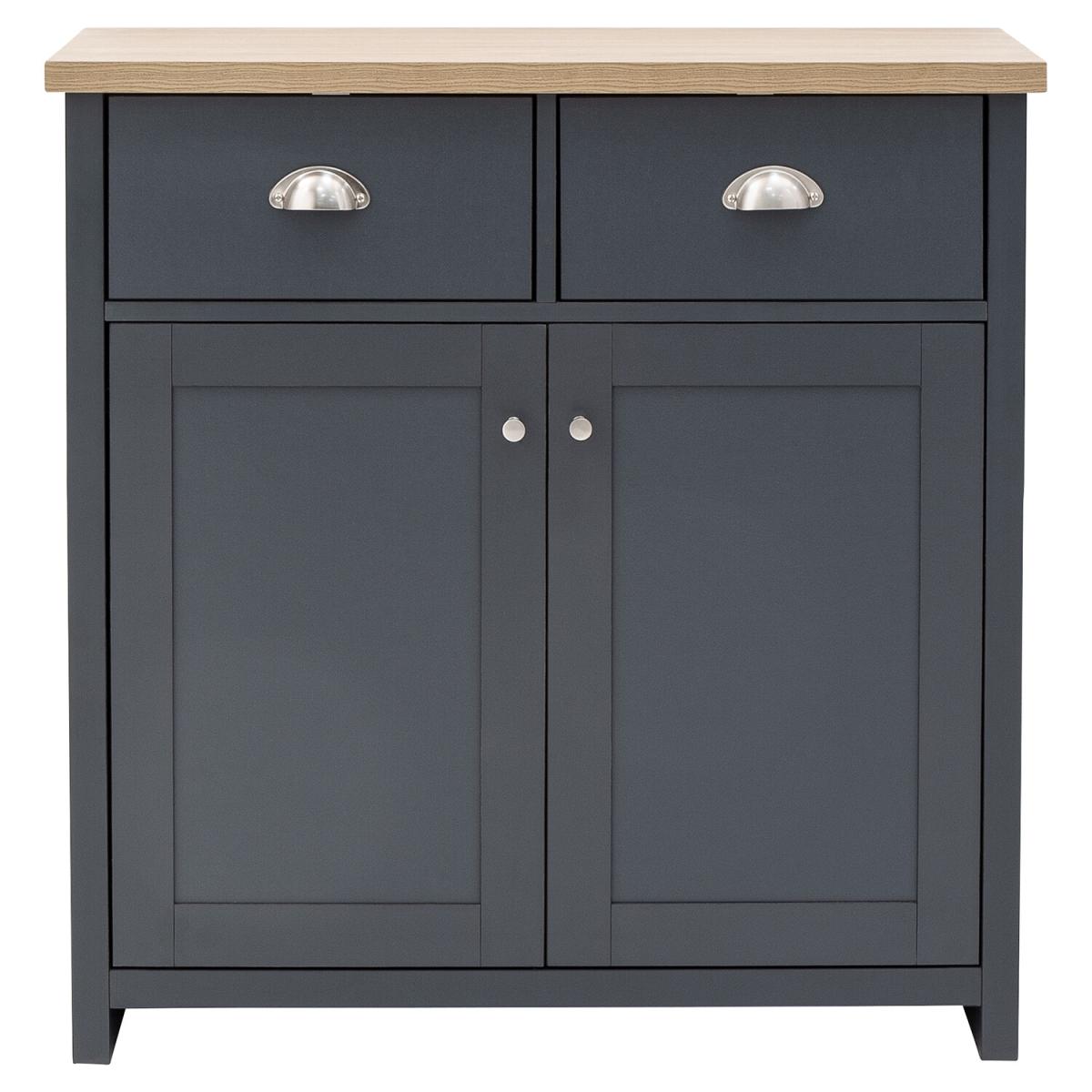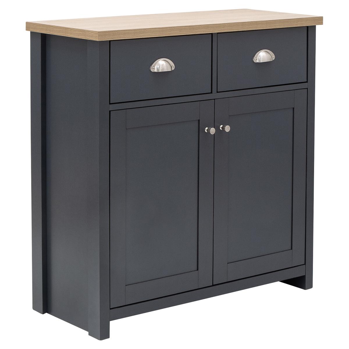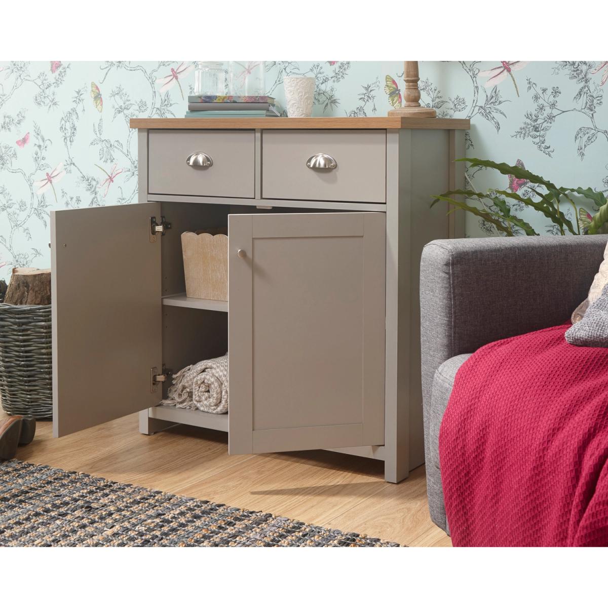 An elegant storage solution for the living or dining room, this Lancaster Compact Sideboard is a great way to keep your home looking neat and tidy. Featuring a beautiful matte grey finish and oak veneered top, this sideboard is designed with two handy drawers and a spacious double door cupboard underneath, great for storing all of your most beloved items.