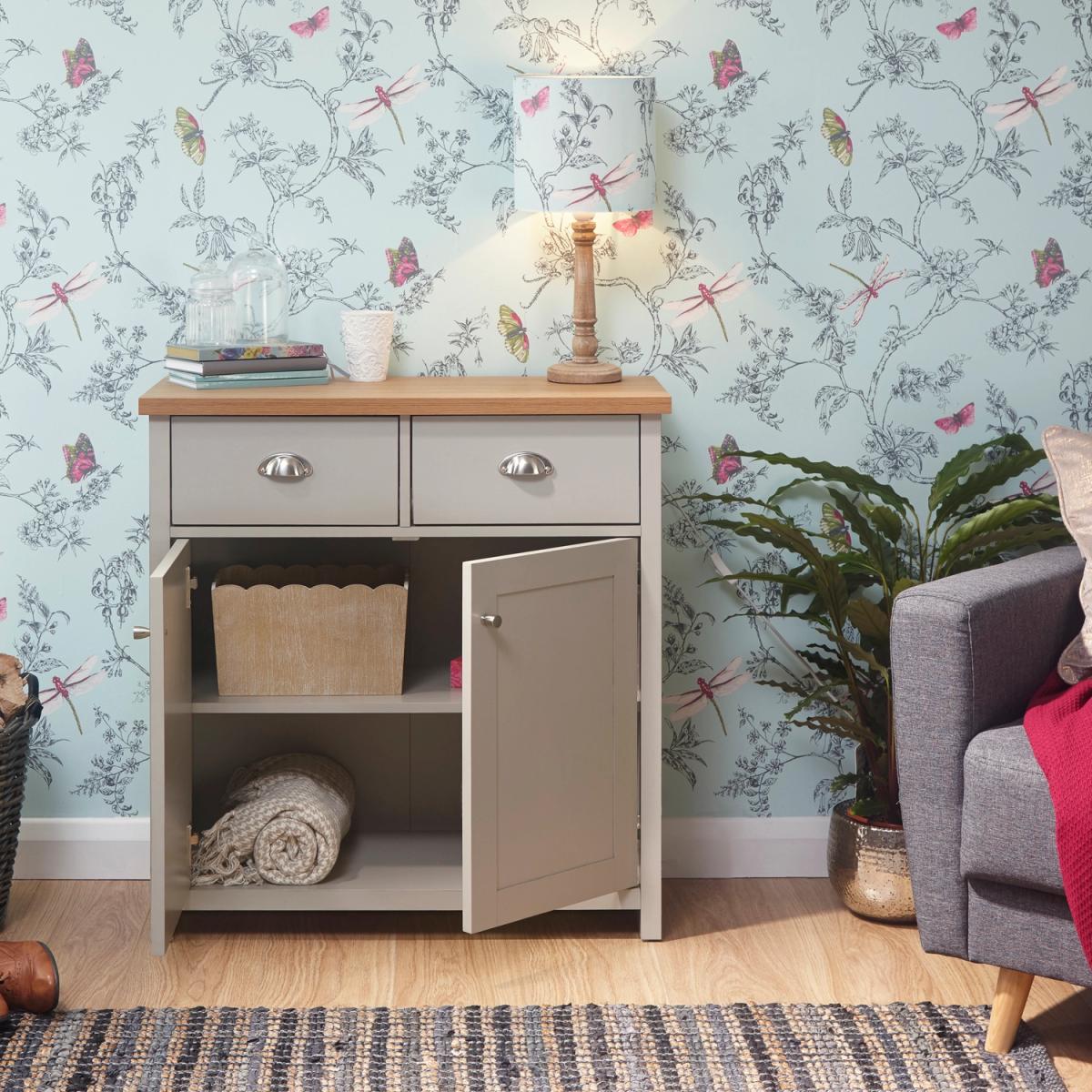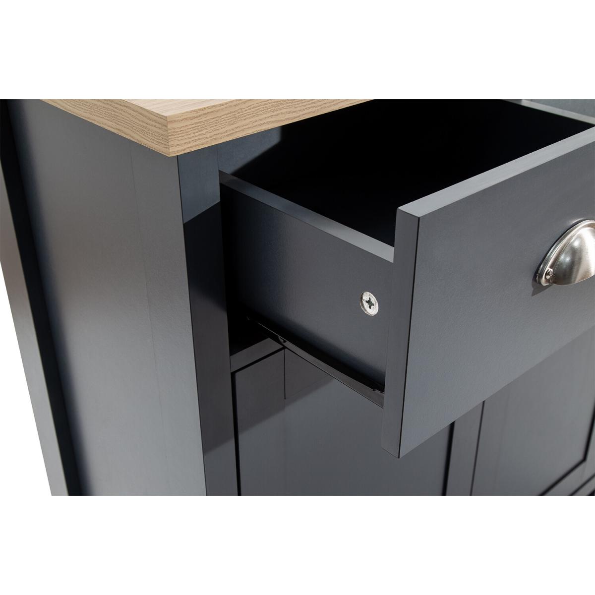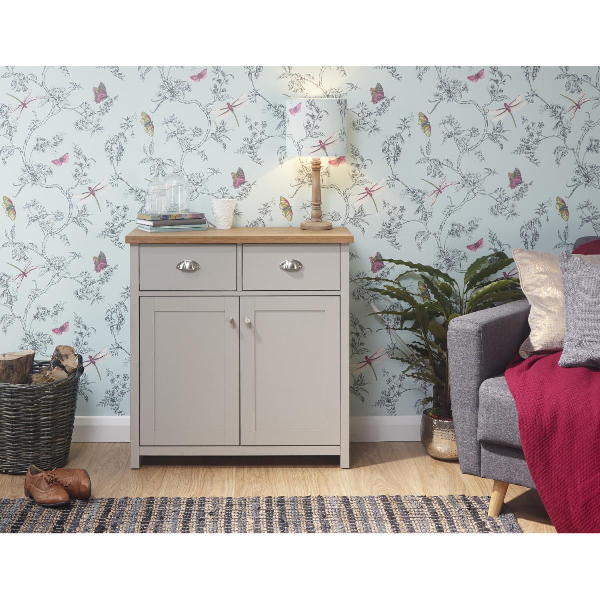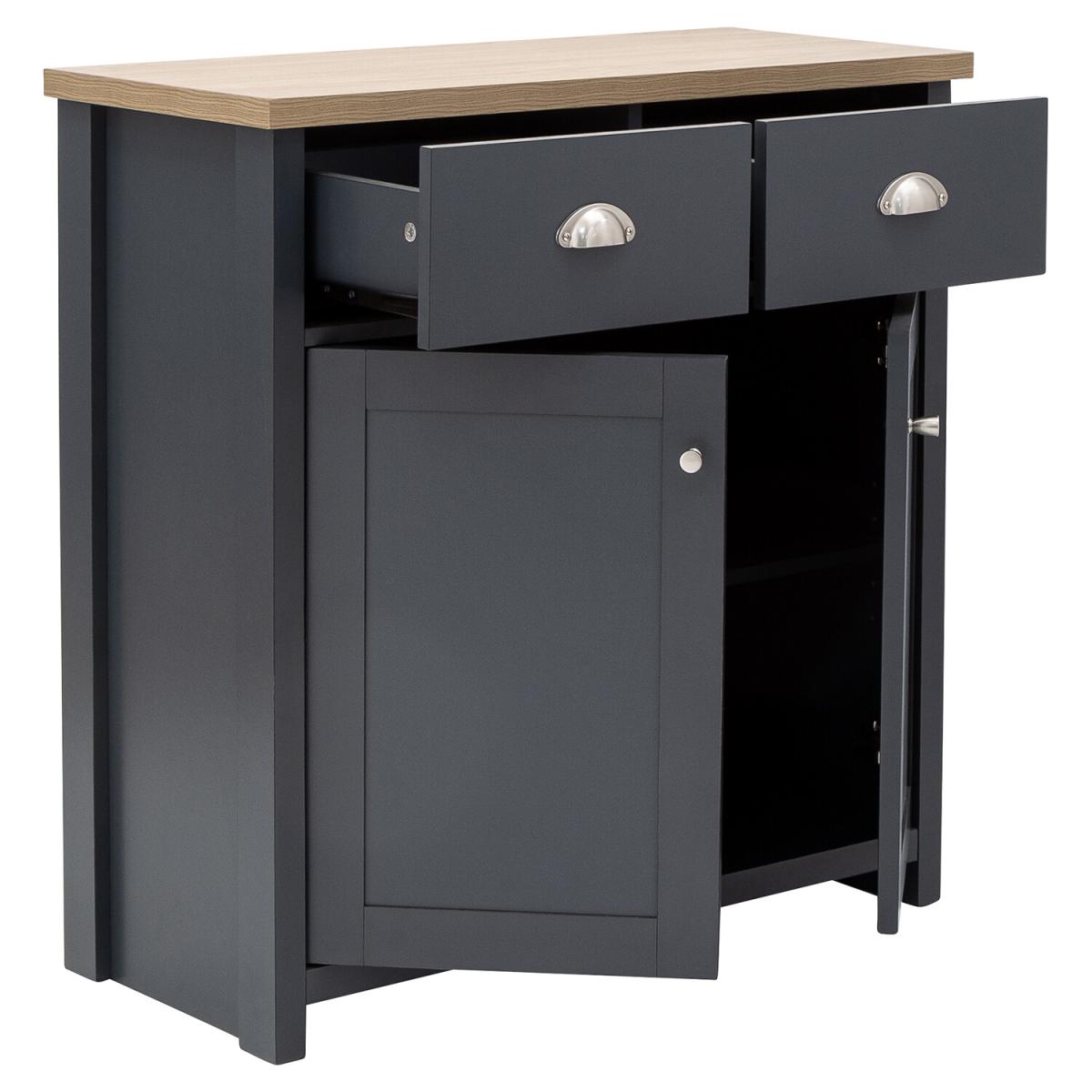 An elegant storage solution for the living or dining room, this Lancaster Compact Sideboard is a great way to keep your home looking neat and tidy. Featuring a beautiful matte grey finish and oak veneered top, this sideboard is designed with two handy drawers and a spacious double door cupboard underneath, great for storing all of your most beloved items.