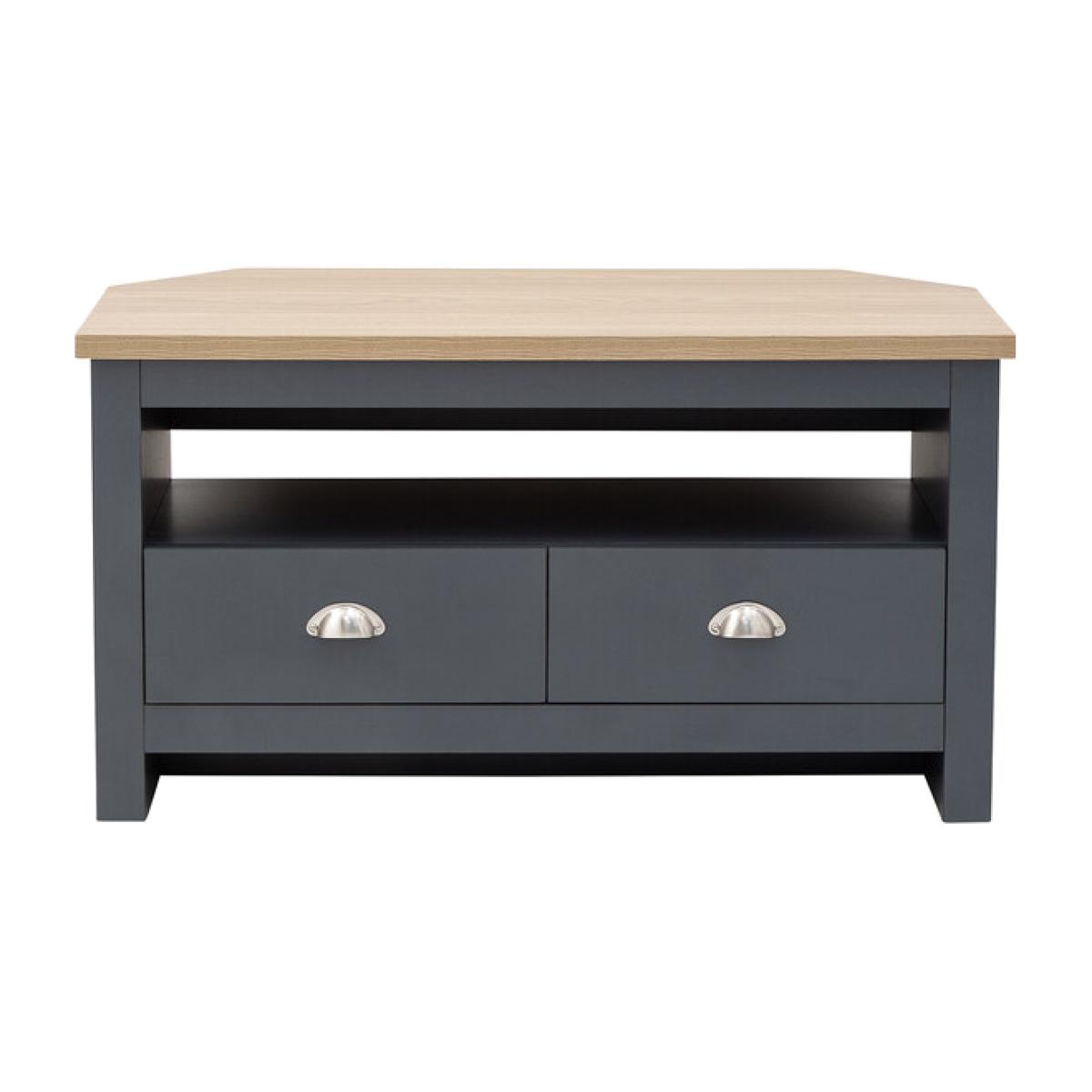 Our Lancaster Corner TV Unit in Slate Blue features a large shelf for all of your entertainment systems and two large storage drawers. Like the rest of the Lancaster collection, it is available in a modern slate blue or cream finish with contrasting oak veneer top, the two handy drawers are fitted with satin silver drawer pulls.